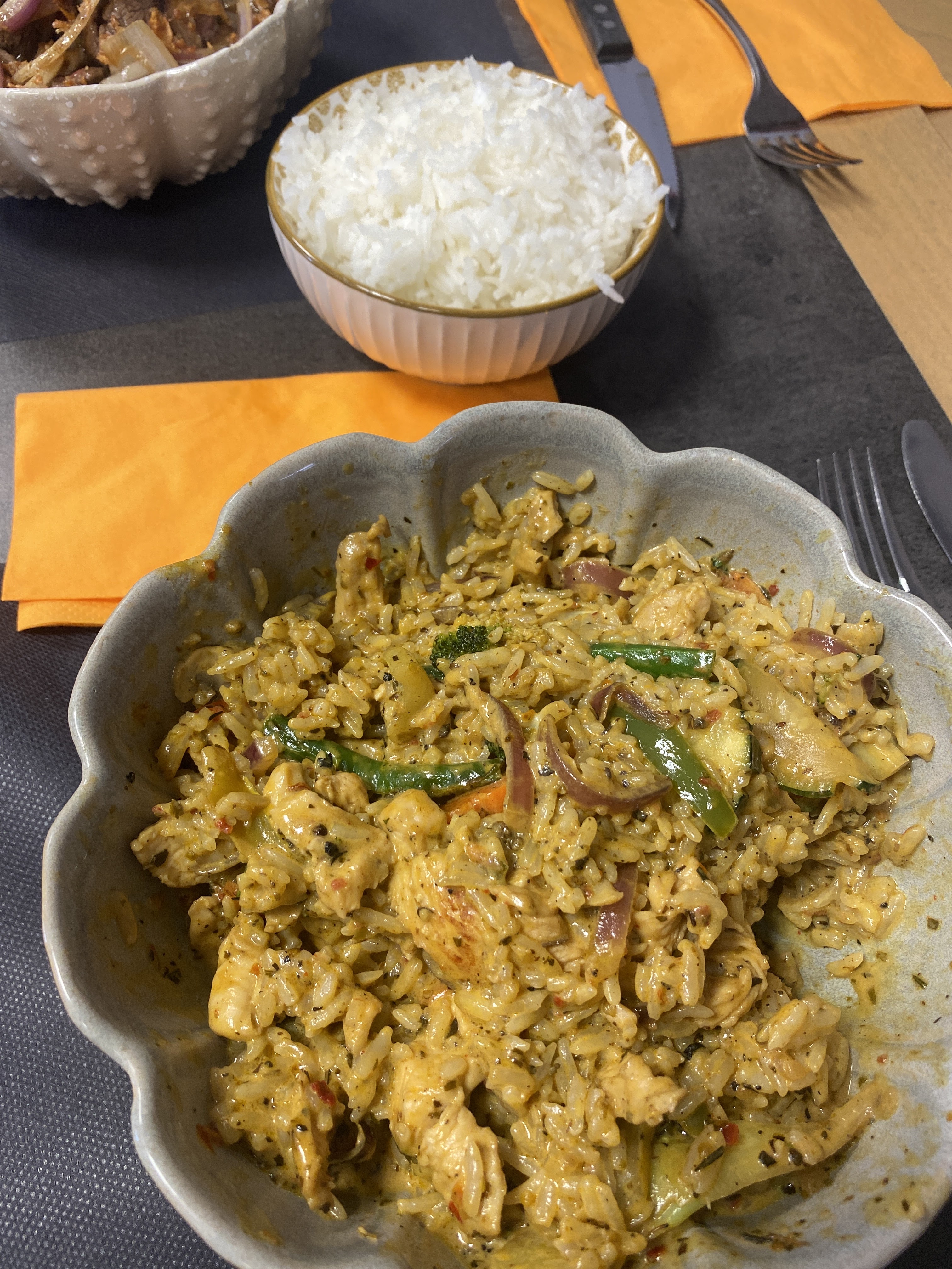 Test avec le poulet Jalfrezi très bon bon, curry délicieux, légume goûteux et savoureux, j'adore. Le porc au caramel et Pareille tres bon et goûteux, ma femme l'a trouvé trop sucré pour sa part. Menu enfant impeccable pour les deux filet de poulet. Riz très bon. Nous recommenceront avec plaisir. Continuer comme ça c'est très bon.