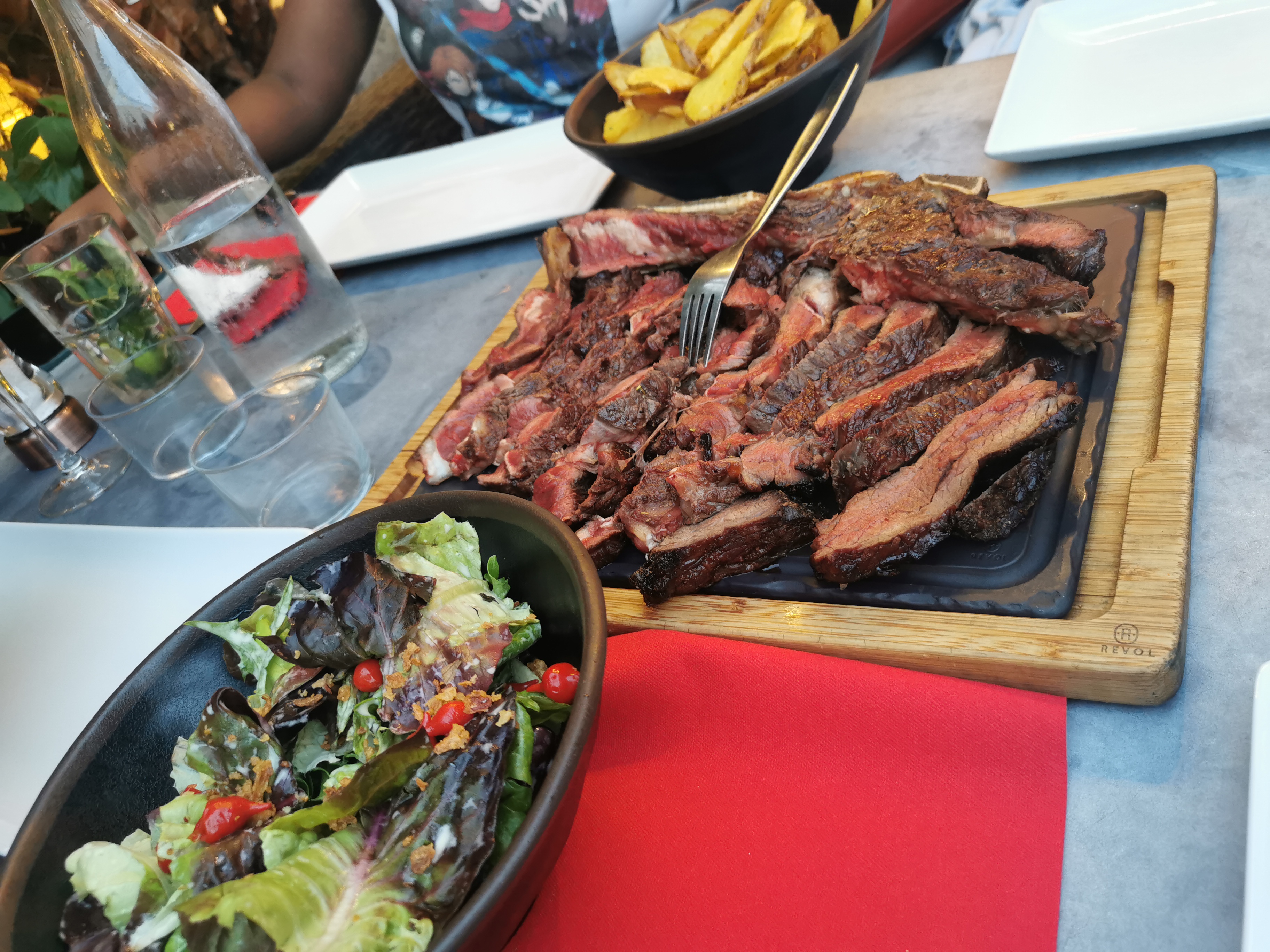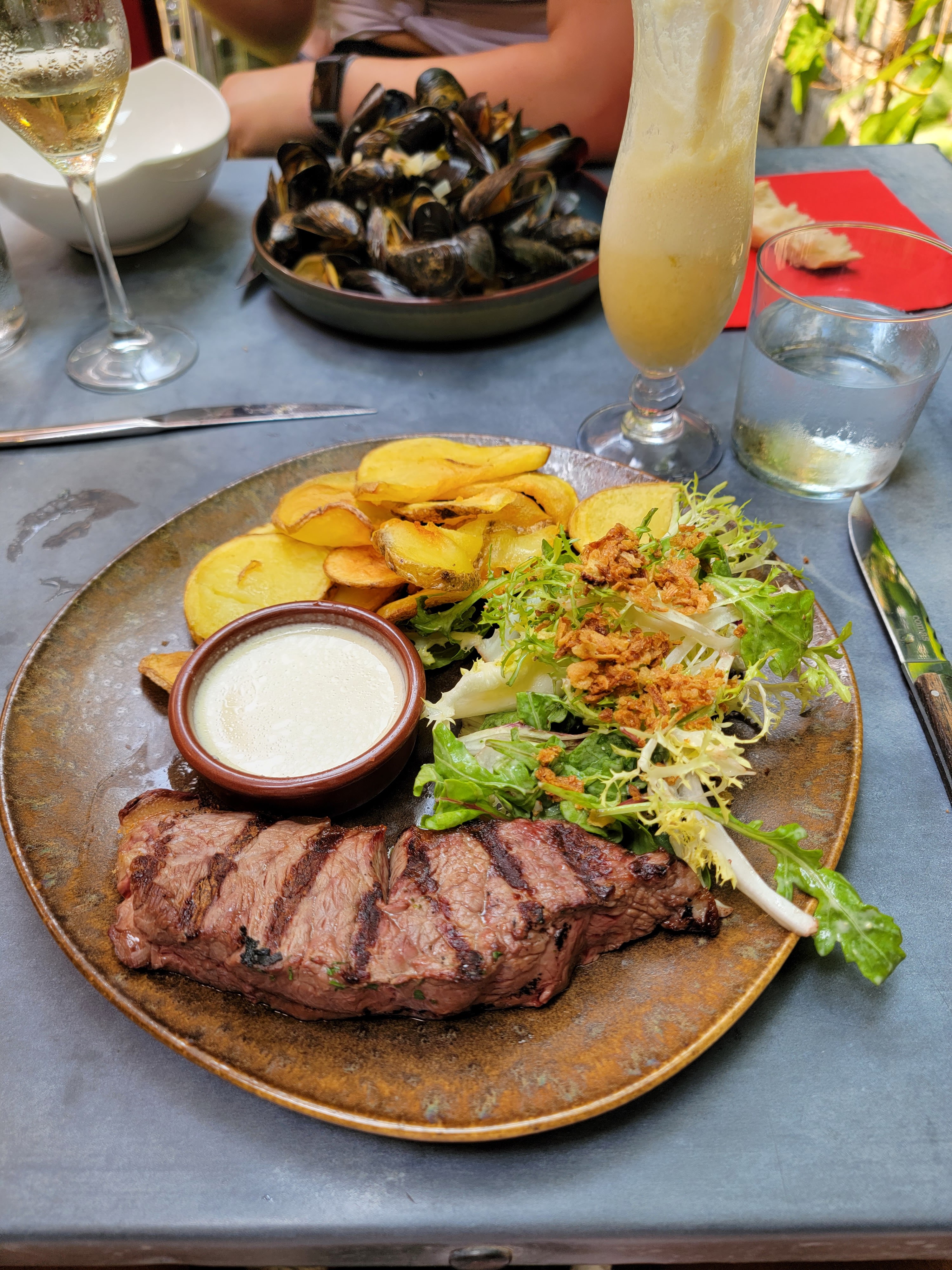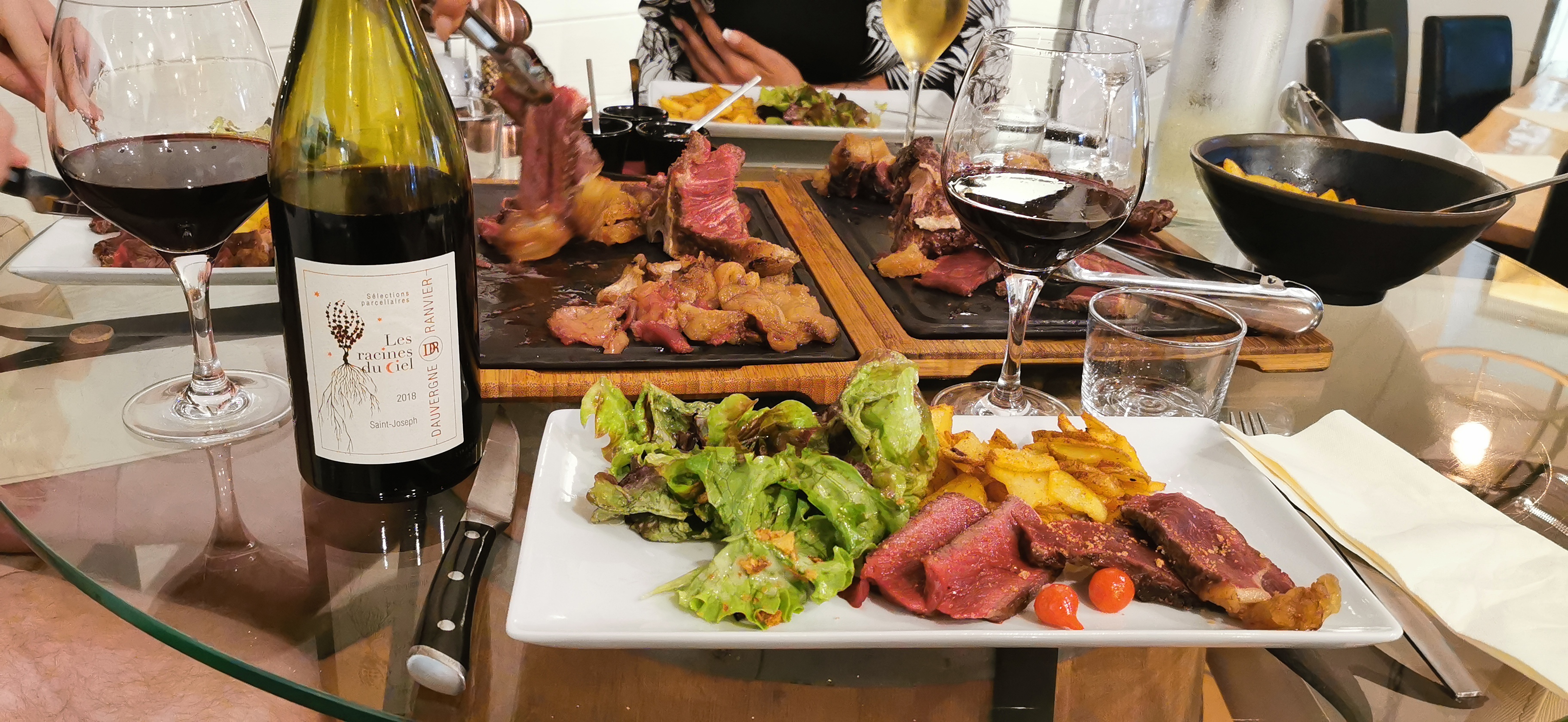 Excellente côte de boeuf, bravo au chef devant les braises!!!! Sur un service peut-être tardif (21h30) et une salle pleine, nous n'avons pas pu apprécié le dessert qui serait arrivé certainement très tardivement. Je rejoindrai un autre commentaire concernant les frites ( une assiette pour 4, c'est peu). C'est dommage, le cadre est sympa.