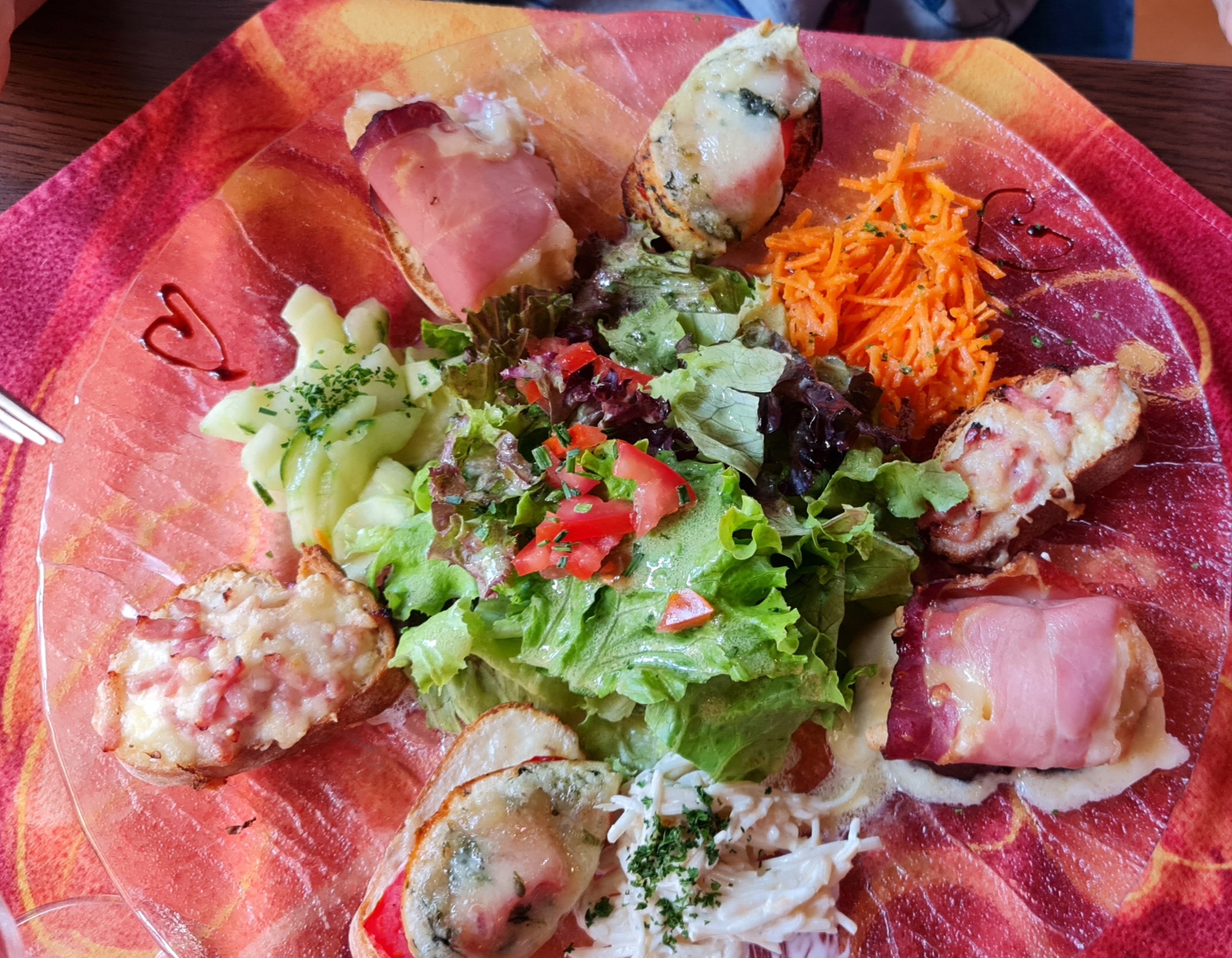 Bonjour. Belle soirée tartes flambées à volonté...avec salade verte et crudités. Rien à redire..trop bonnes ces tartes flambées et super choix..même au MUNSTER..bienvenue en ALSACE.👍👍👍