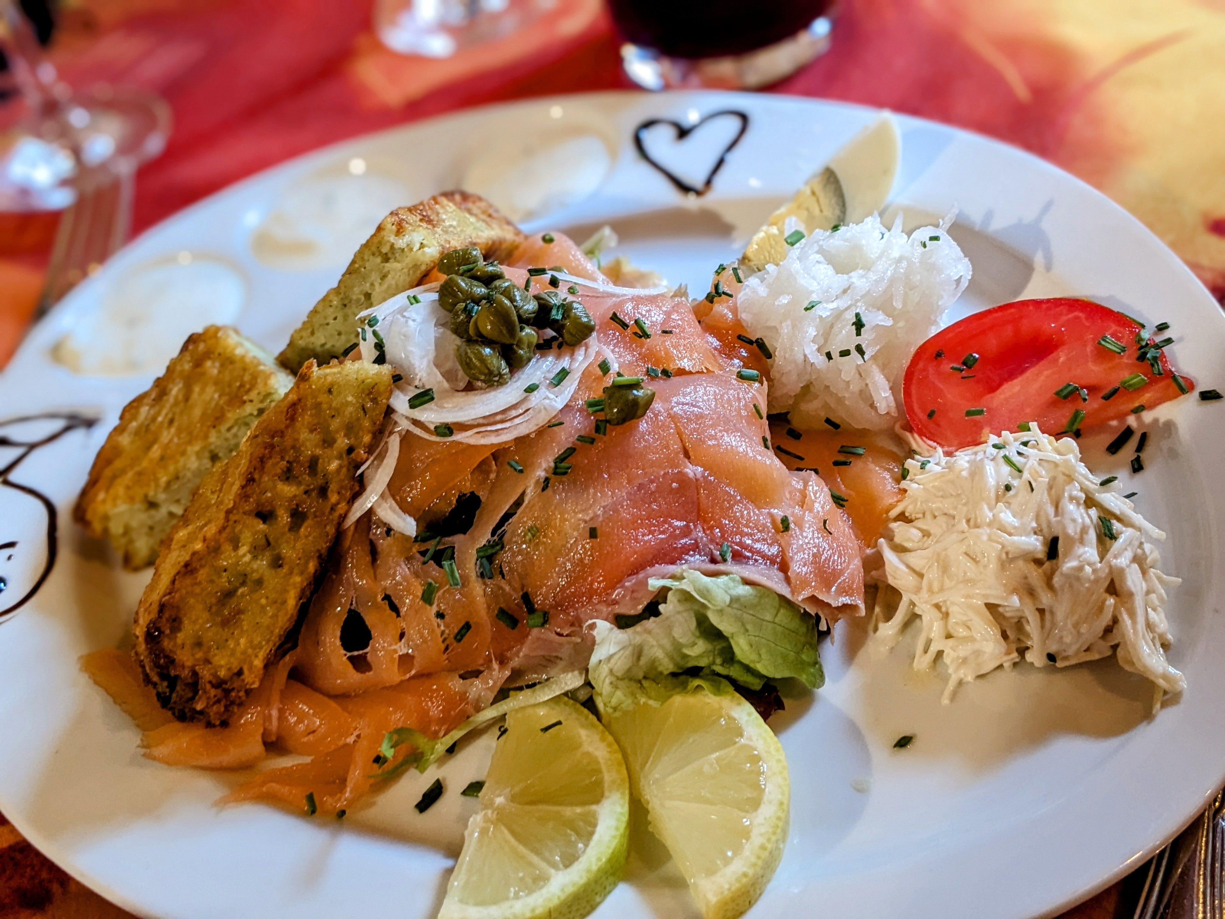 Terasse sans parasols, en plein soleil. Rapé de pomme de terres etait vraiment bien mais le filet de Sandre arrivait sans Spaetzle et sans Salade, comme on avait commandé. La sauce blanc buerré etait une soupe, mais pas une sauce. Même pas une excuse, auprès notre reclamation. Ca fait bien dômmage. Je ne sais pas encore s' il y aurra une 2eme visite pour nous la bas.