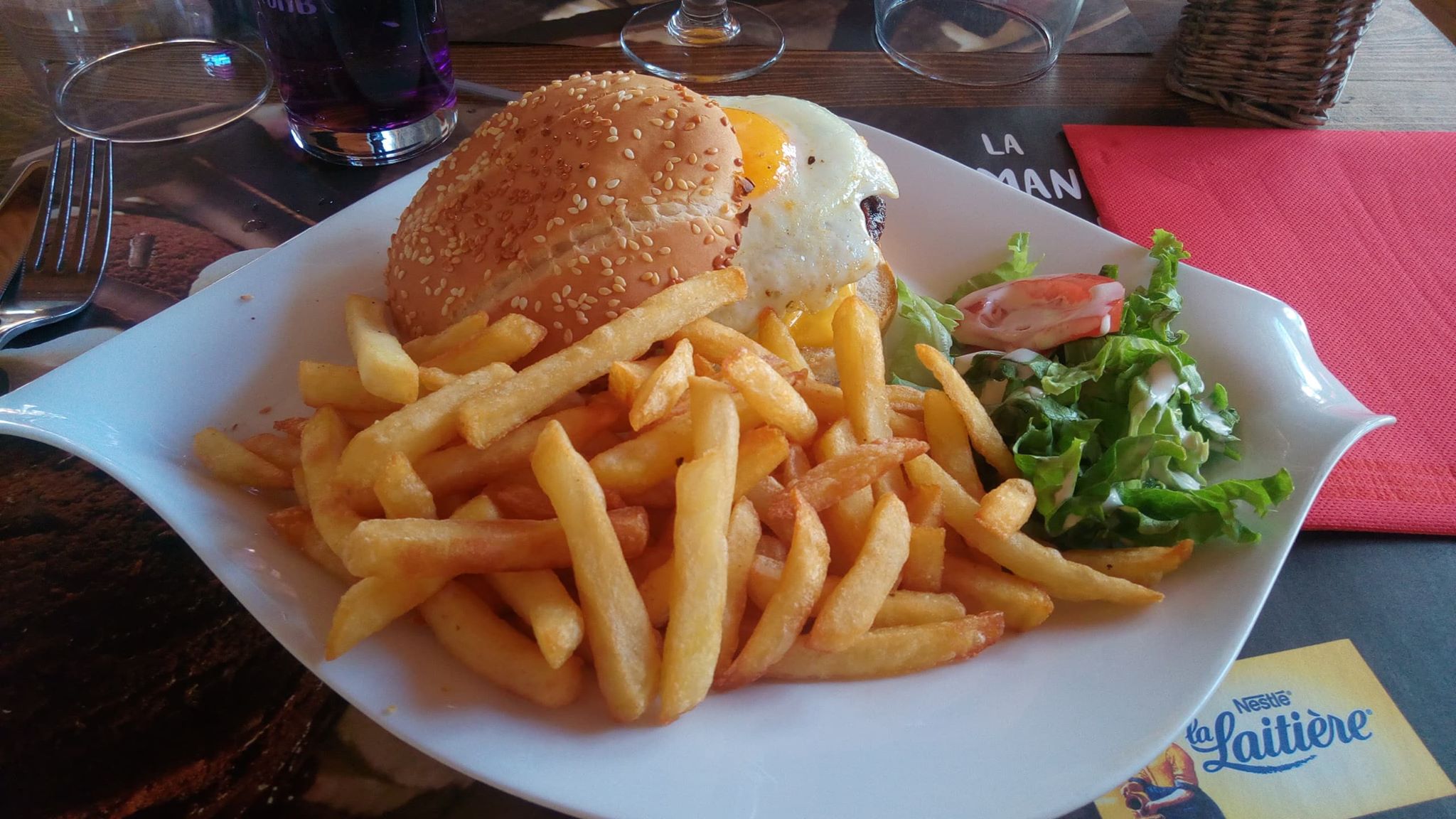 Arrivés à 11h57 , accueil très désagréable. Nous attendons donc 3 minutes puis sommes installés dehors sans nous demander notre avis . Repas peu goûteux sûrement surgelé , sans trop de saveur , salade pleine de nervures immangeables peu assaisonnée , frites surgelées, bon dessert par contre . Très déçus , à éviter