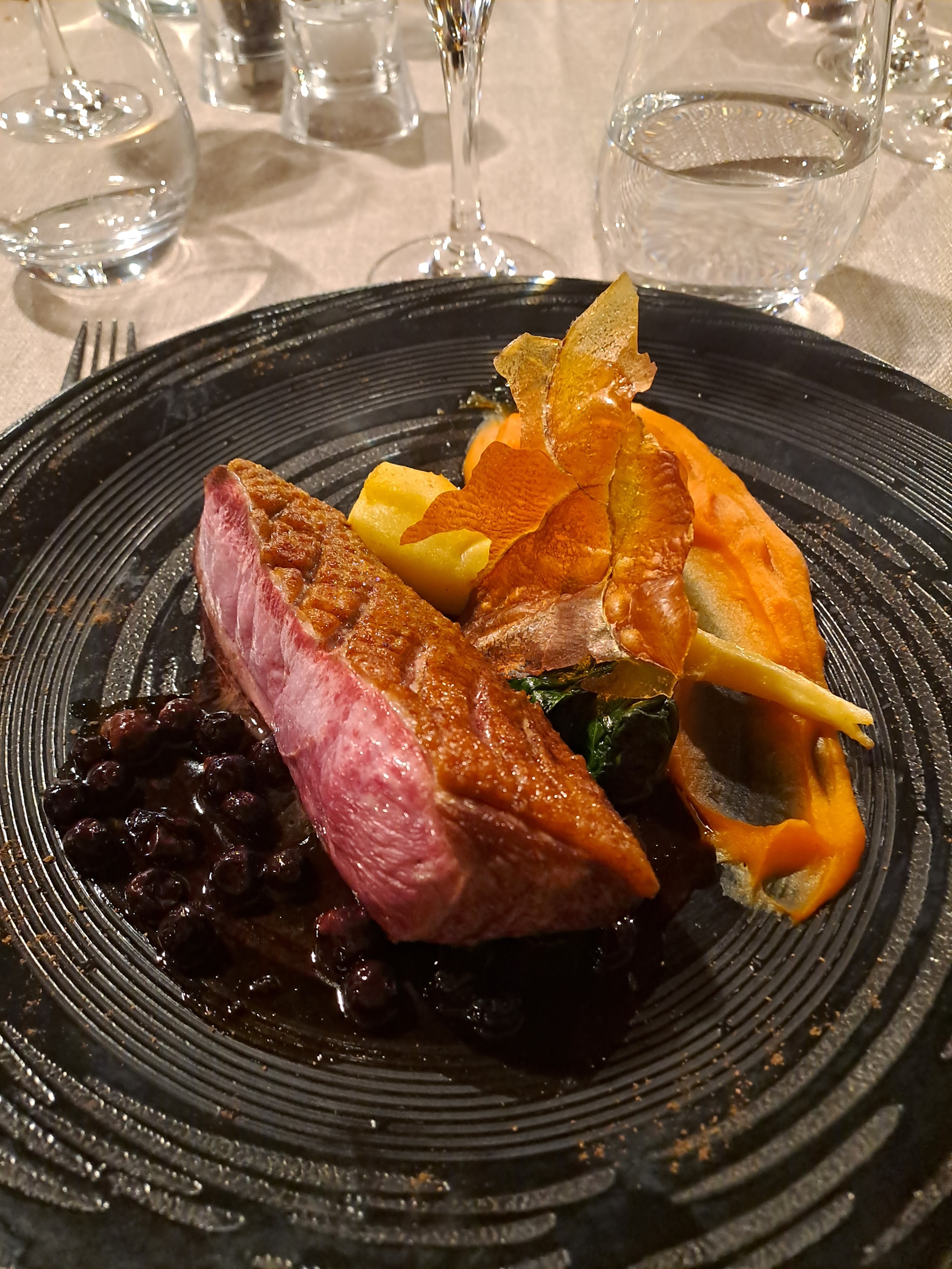 Cuisine excellente ! Viande tendre à souhait (magret), accompagnements délicieux, présentations soignées et appétissantes, un sans faute ! Jolie salle avec une belle flambée dans la cheminée. Seul bémol pas beaucoup de monde ce soir là, on s'est senti un peu seul mais c'est le hasard des réservations..