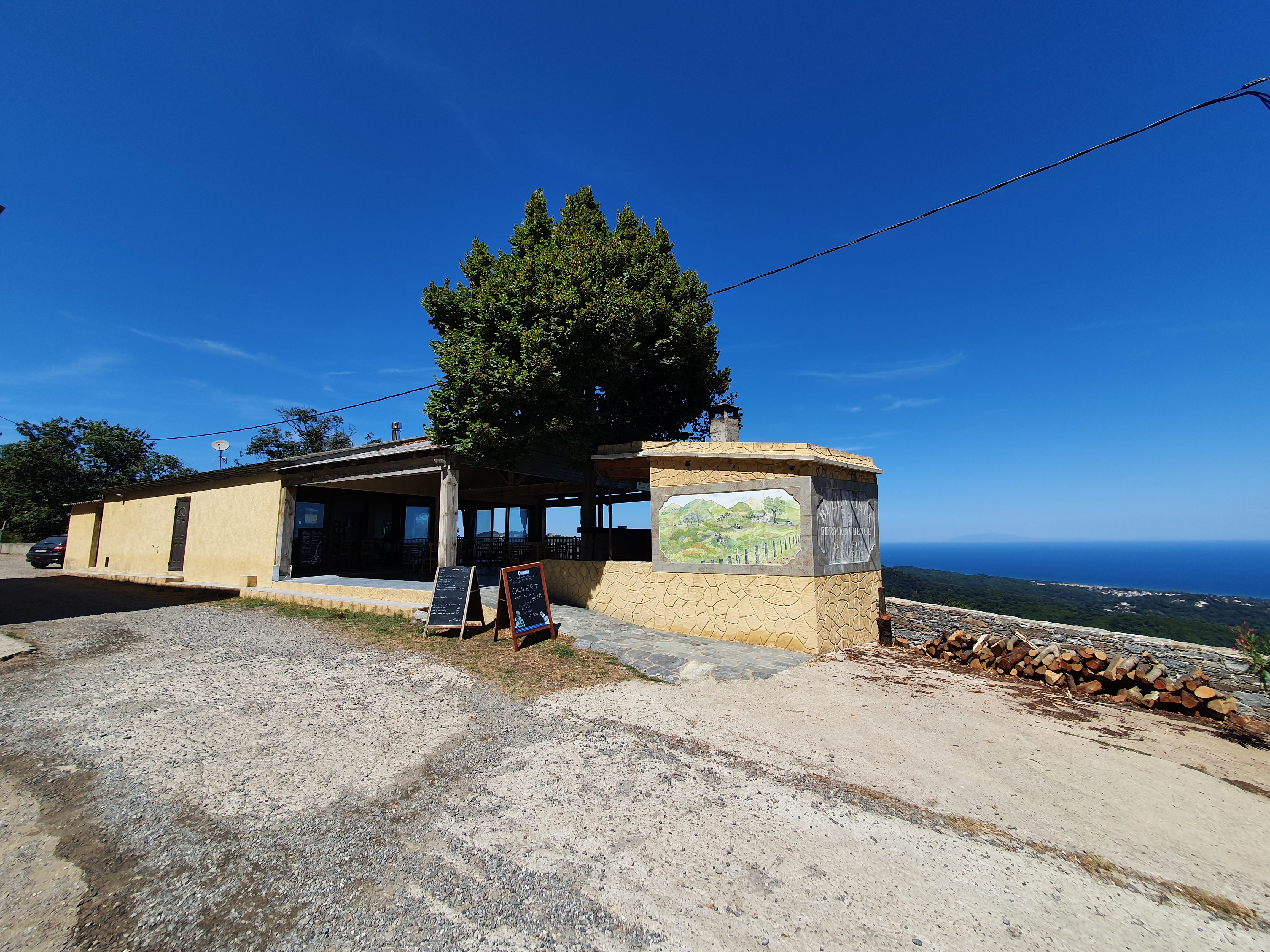 On s'y arrête pour y boire un verre et puis l'ambiance, la vue panoramique et la convivialité font qu'on y reste mangé car on s'y sent très bien. De bons produits dans l'assiette, le sourire et le temps passe lentement, au calme de la montagne avec vue sur la mer ....on est en Corse et cela fait du bien! :-) A noter prix raisonnable Je vous recommande