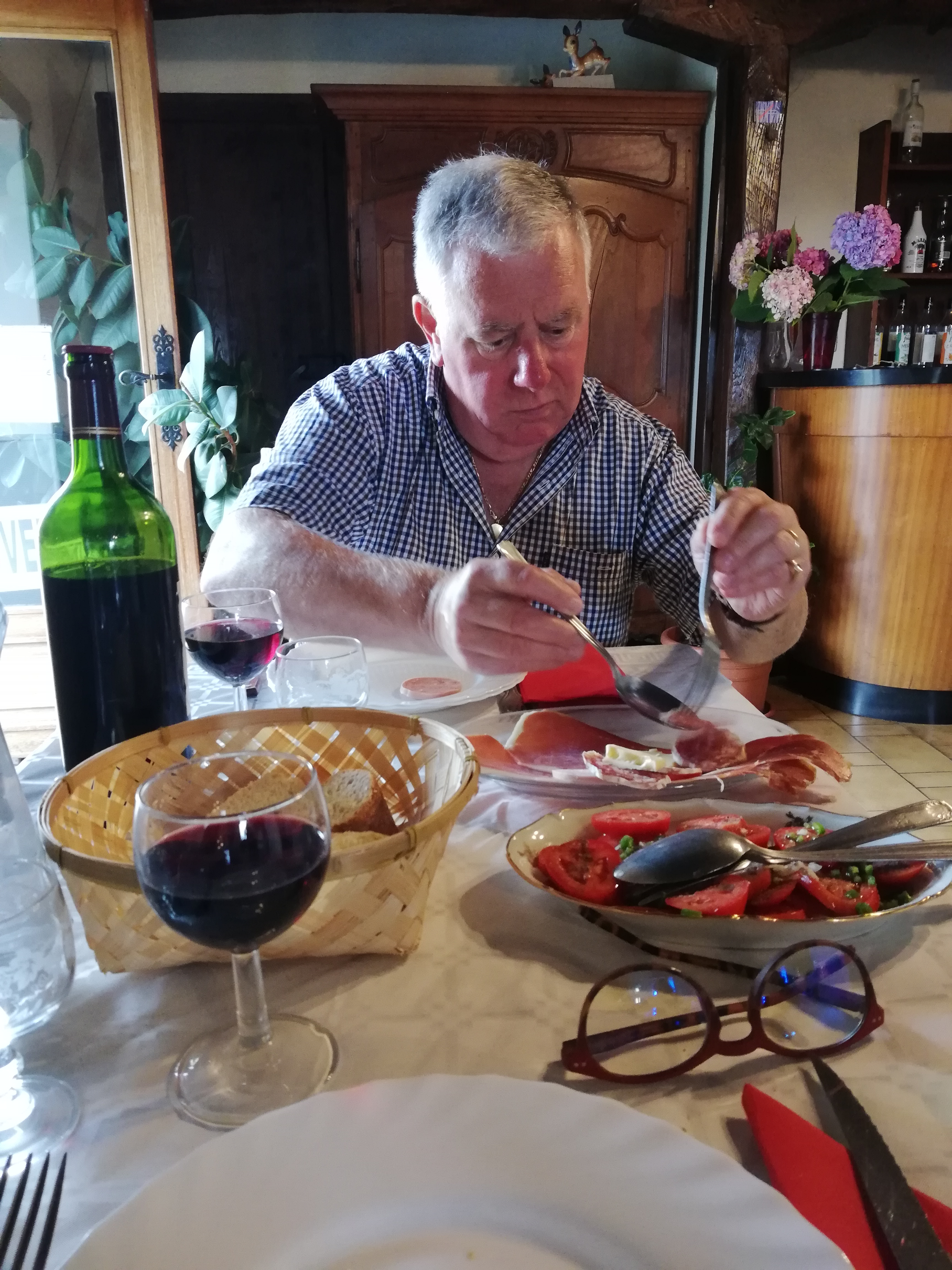 Menu unique composé de produits de la ferme. Pour 17 euros : potage de légumes , assiette de charcuterie, rôti de porc aux petits pois (il nous avait été proposé poulet frites et nous avions demandé des légumes plutôt que des frites), fromage, flan maison. Comme à la maison. Tout ce qu il faut pour entretenir la forme d un randonneur.