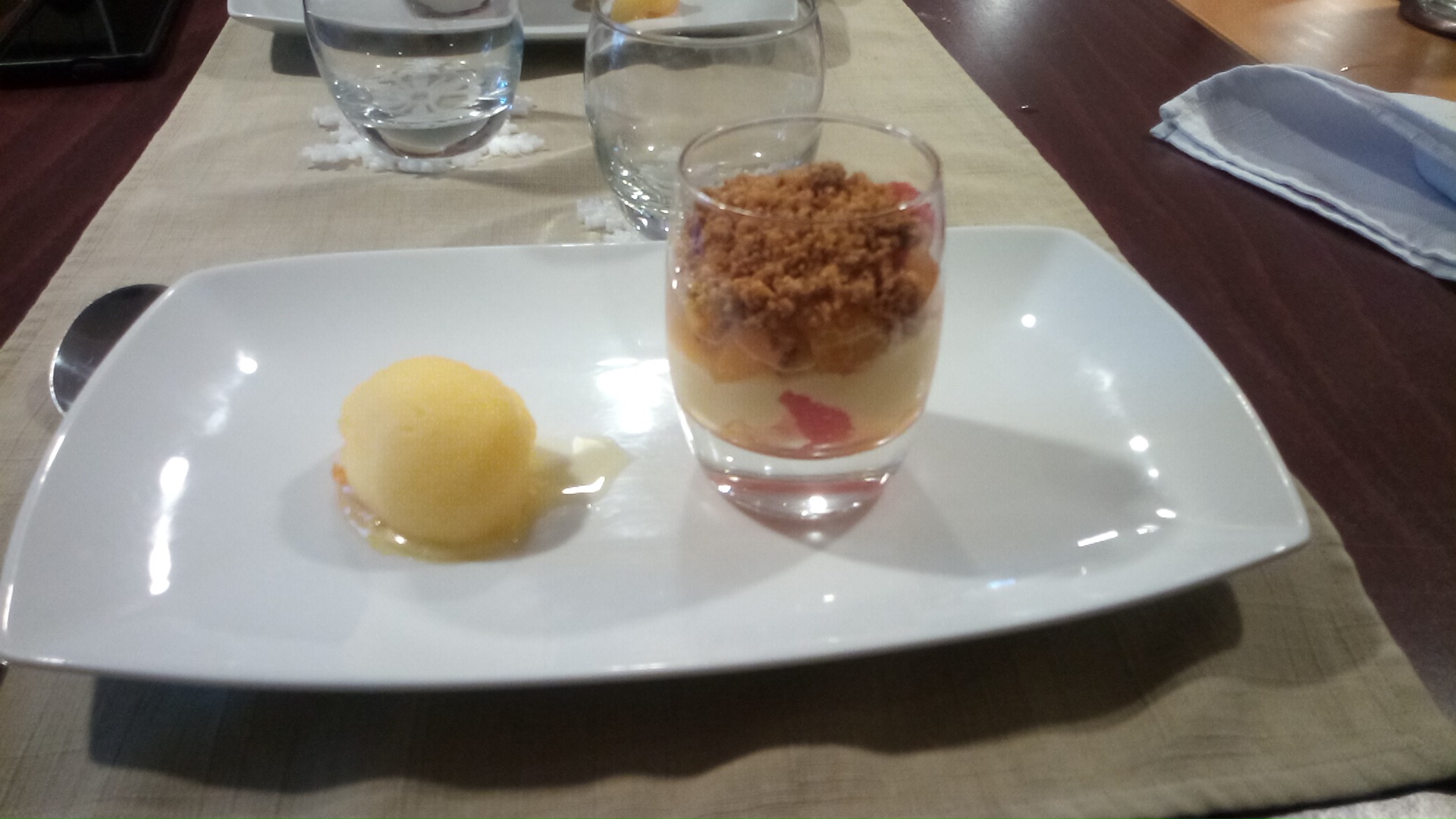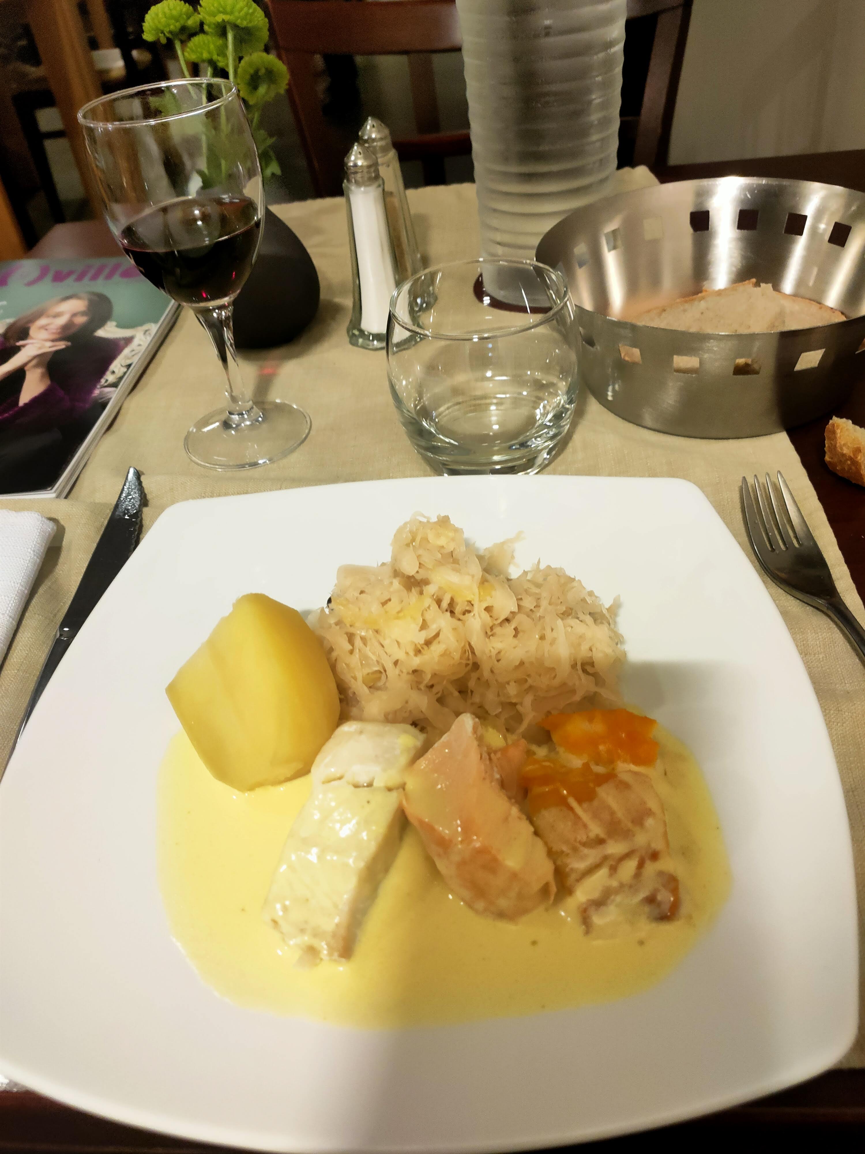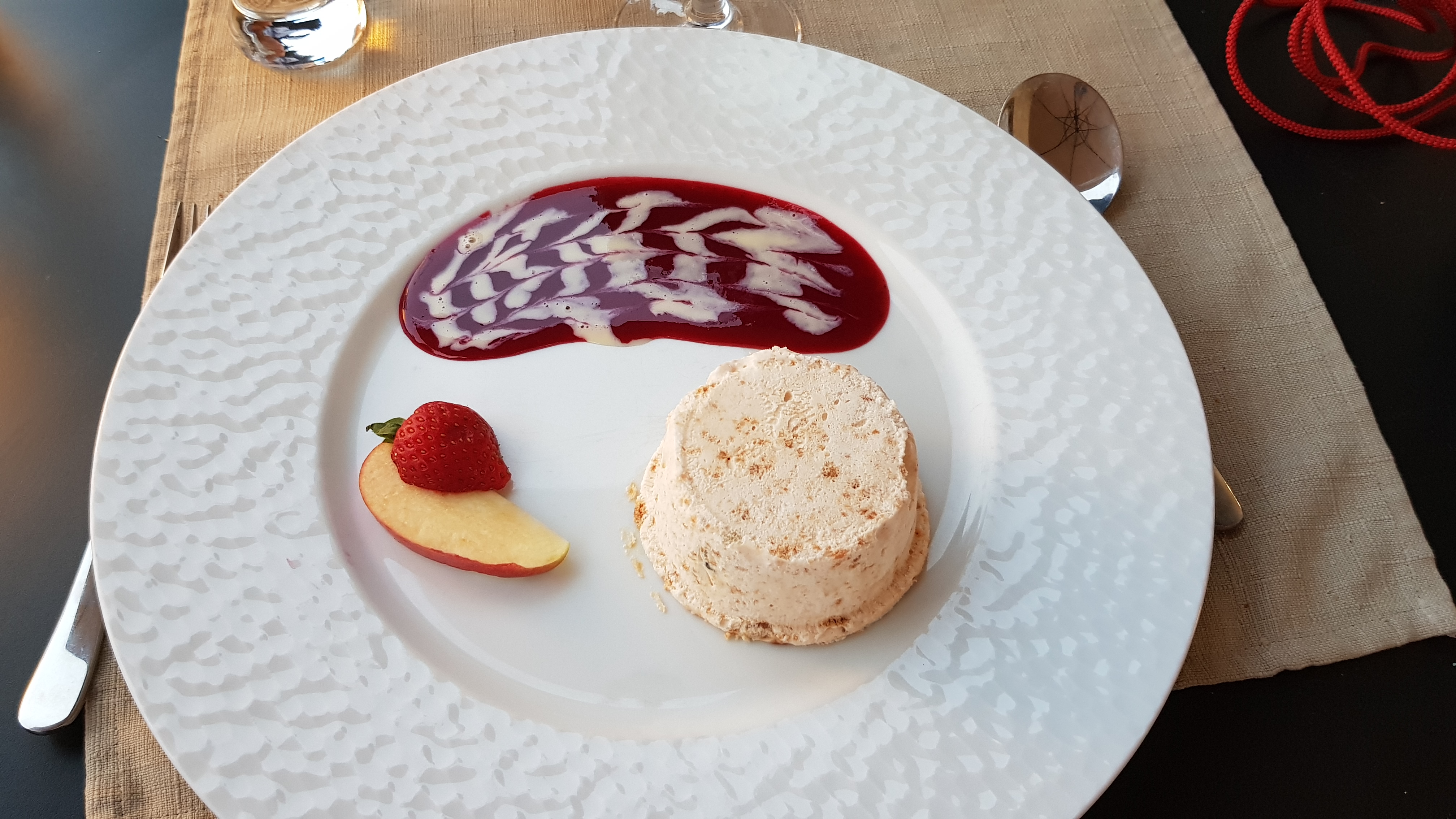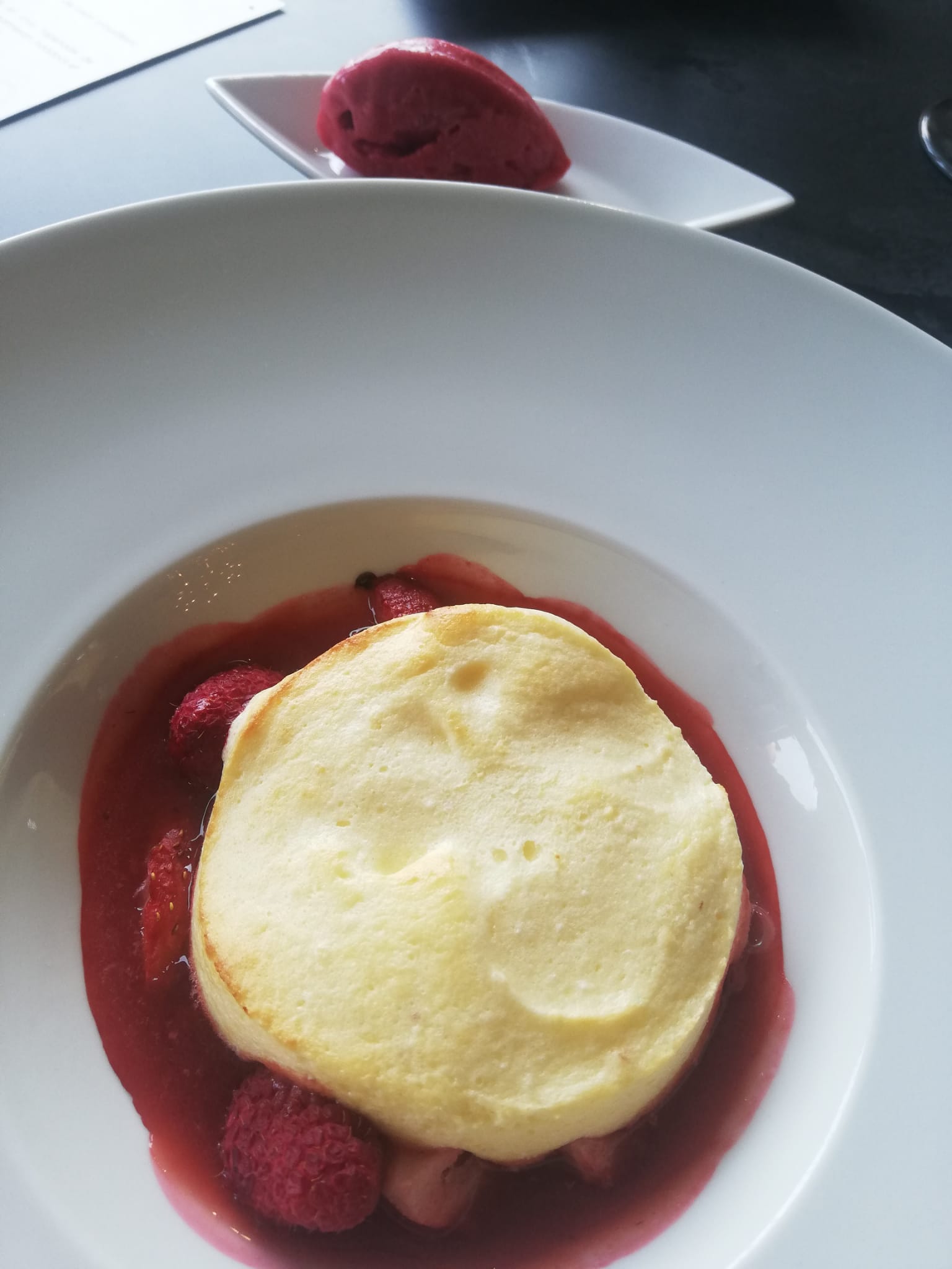 Très bon repas, bien présenté, bien servi. Beaucoup apprécié la formule repas. Voici quelques photos... 1)amuse bouché à la carotte et au cumin 2)fois gras aux framboises 3) volaille avec une sauce au morille ainsi que quelques petites crêpes à la pomme de terre 4)nougat (glace avec des fruits à l'intérieur) avec un coulis de fruits rouges Cordialement