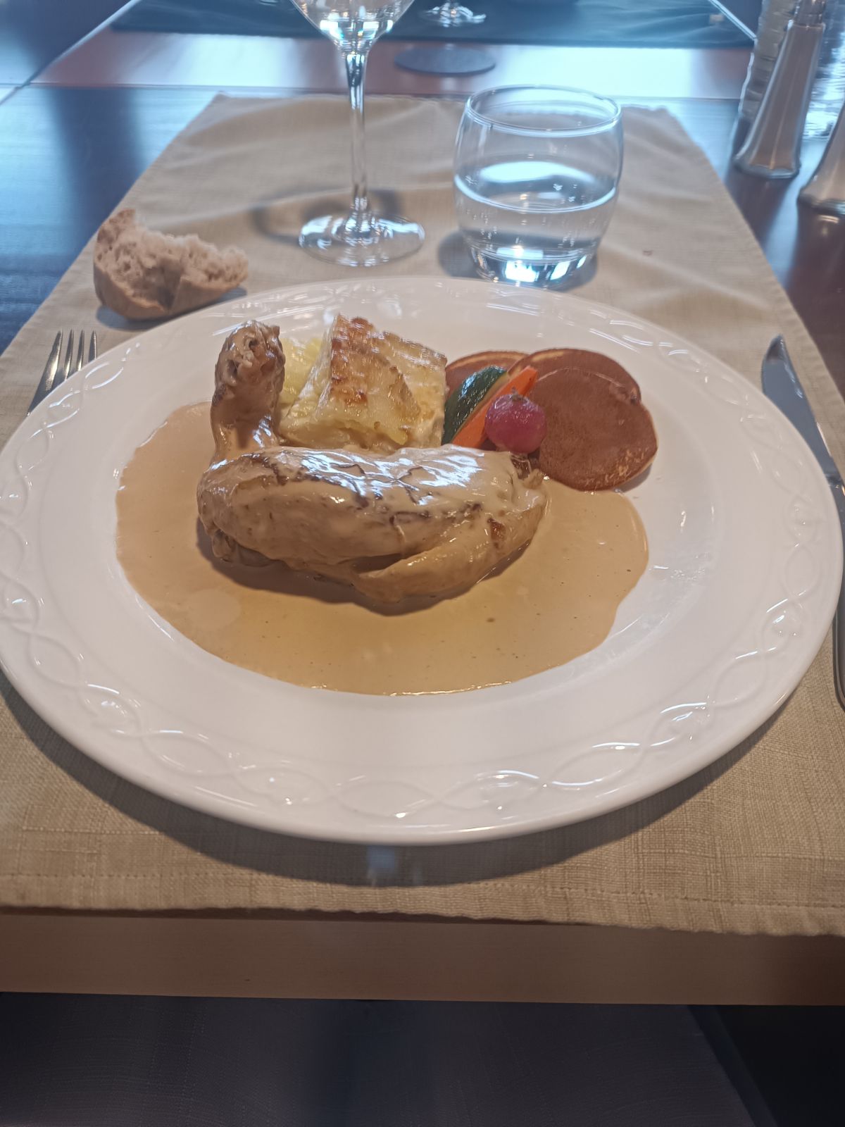 Déçu par le poulet de bresse creme aux morilles. Probablement pas assez cuit car viande élastique. Une addition un peu lourde (95e /pour 2) . Quel dommage, car le cadre et le personnel sont sympas.