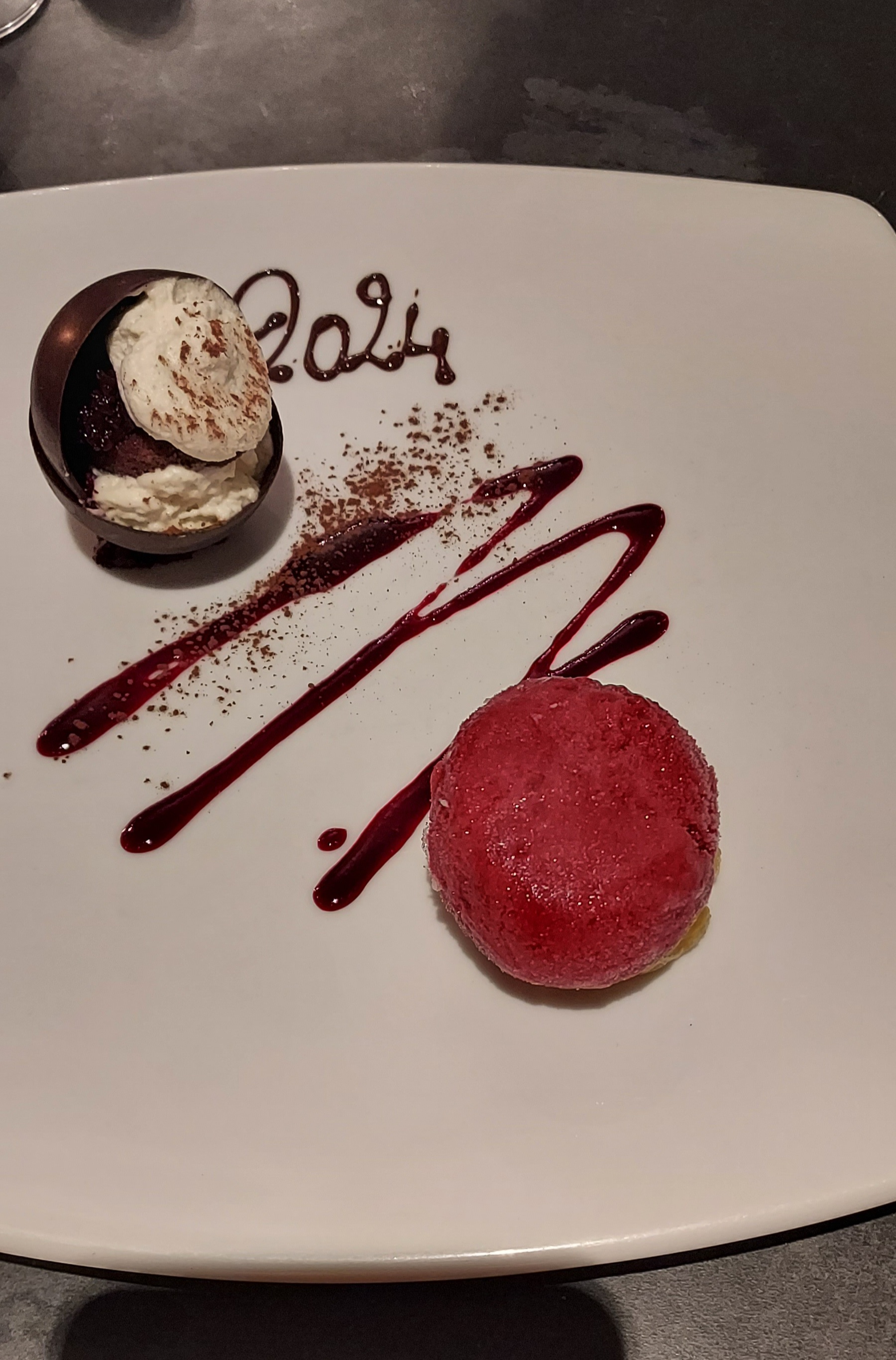 Nous avons découvert que le repas du jour de l'an était centré sur les agrumes. L'apéritif maison était trop marqué sur le goût oranger, ainsi que sur le carpaccio de lotte. Quelques oublis dans le service, dommage. Café assez amer.