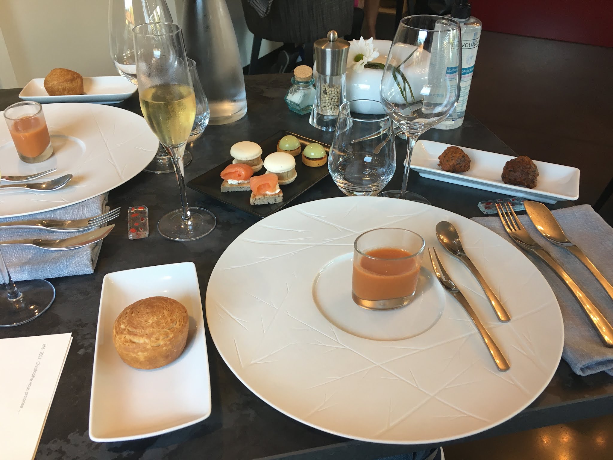 Très beau cadre, personnel très professionnel et très courtois. Nous avons passé un agréable moment lors de notre soirée de St Valentin. Cuisine originale et recherchée. Un très bon macaron de foie gras. Les produits sont de très bonne qualité et l'envie d'innover de la part de l'équipe de cuisine est bien présente. En revanche, une réflexion sur le dressage et quelques techniques de cuissons pourrait être portée de la part du Chef. Exemple : Le macaron de foie gras est très bon et l'idée innovante très bonne, mais le dressage tout en hauteur rend difficile la dégustation, l'idée de 2 macarons moins haut pourrait être une idée afin de permettre, lors de la dégustation, une bouchée mixte foie gras-macaron sans être obligé de destructurer le dressage et de ne manger que le foie gras et être obligé de couper le macaron à côté. Idem pour la Foccaccia de St Jacques fumées au bois de hêtre, pourquoi découper en morceaux cette belle St Jacques et la cacher sous ces légumes croquants ? Idée très bonne mais là encore une fois, réflexion à donner du Chef et de l'équipe pour garder l'idée de cette foccaccia mais mettre en avant l'élément principal de ce plat, la St Jacques ! De plus, réduisez le temps de fumage qui est trop présent et masque le goût de la St Jacques et fait que cette dernière s'en trouve un peu trop cuite ! Dommage ! Que dire du pot au feu de faisan au foie gras poché ? Très bonne idée là encore ! Mais si c'est un pot au feu, pochez vos suprêmes de faisan dans votre délicieux bouillon corsé à la queue de bœuf ! Et pourquoi ne pas habiller ces suprêmes avec de la crépine avant de les pocher ? Ils seraient moins secs, dommage ! Et dernier conseil concernant ce foie gras poché au torchon qui accompagne le faisan, plutôt que d'avoir un écrasé de foie gras déposé sur le suprême, pourquoi pas disposer quelques dés de foie gras dans l'assiette, pochés minute avec le bouillon versé bouillant sur ces derniers lors du dressage ou devant le client en salle par ces serveuses si professionnelles ? Je conseille néanmoins ce restaurant pour la qualité en général et sachez que ma critique n'est que constructive ! Je ne fais que des conseils de professionnel pour des professionnels ! Bravo à tous ! Très belle carte des vins !!!