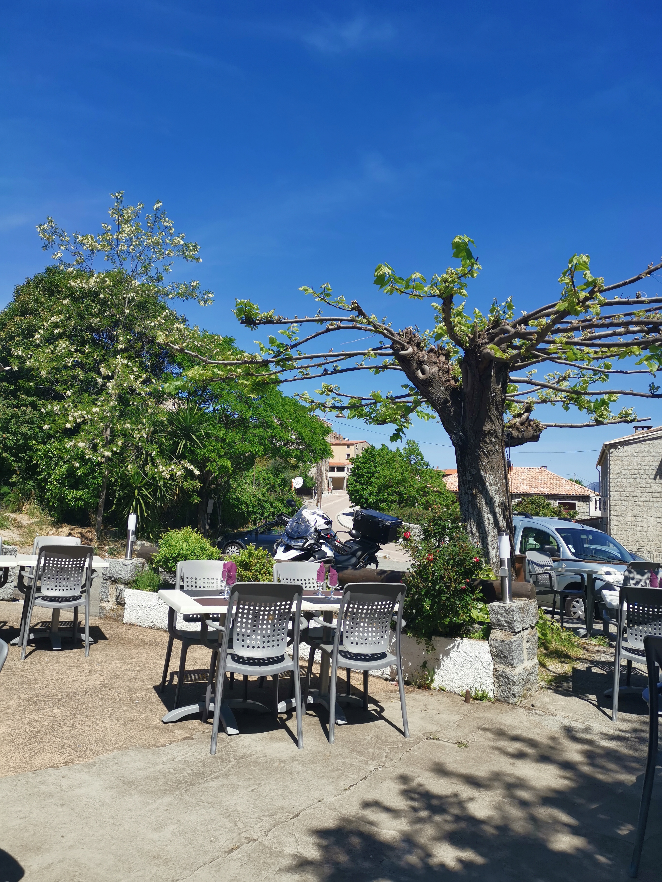 Auberge sympathique avec une belle terrasse ombragée Le personnel est efficace et le service plutôt rapide Les plats sont copieux mais mérite un peu plus d'attention, une guêpe cuite avec la pizza frites noir (sûrement l'huile à changer). Les prix sont dans la fourchette Corse Je recommande