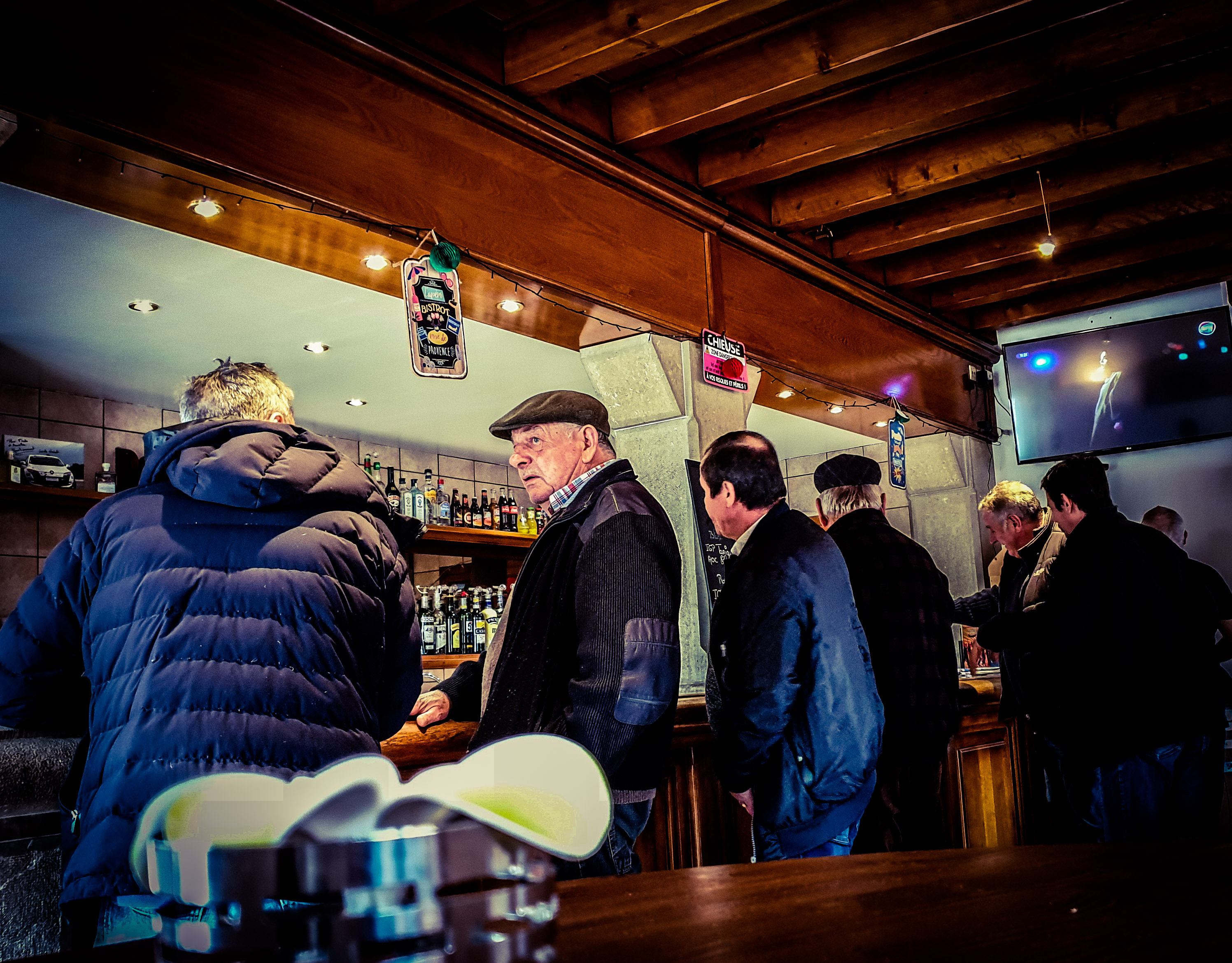 Café provincial, égayé par les voix rauques et pédantes de retraités, d'ex-fumeurs, de montagnards de villages, qui ont tout vu et peu compris. Une humanité habillée de manière anonyme, dont les espoirs et les rêves sont restés dans les tiroirs.