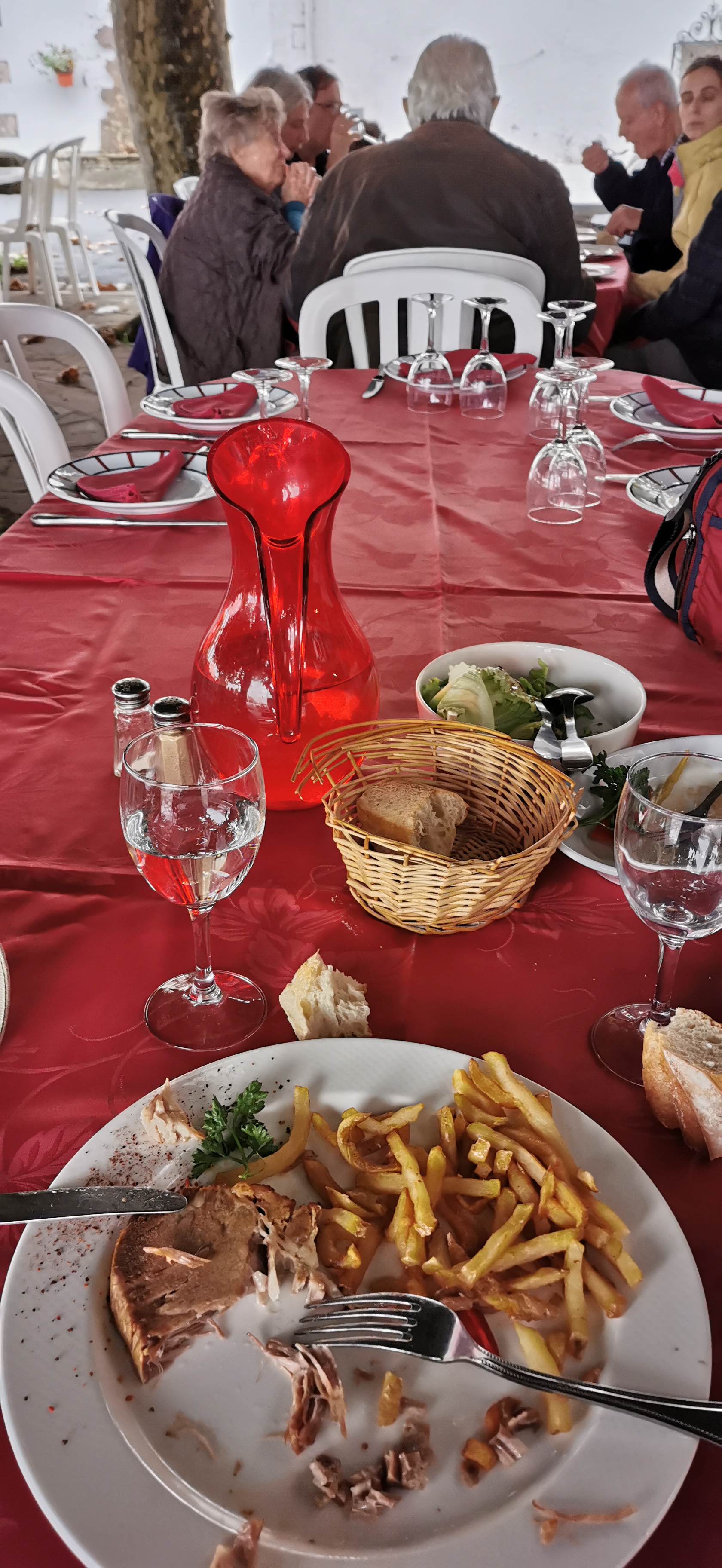 Incontournable, repas traditionnel sous les platanes, omelette aux cèpes et confit de canard ou de porc!