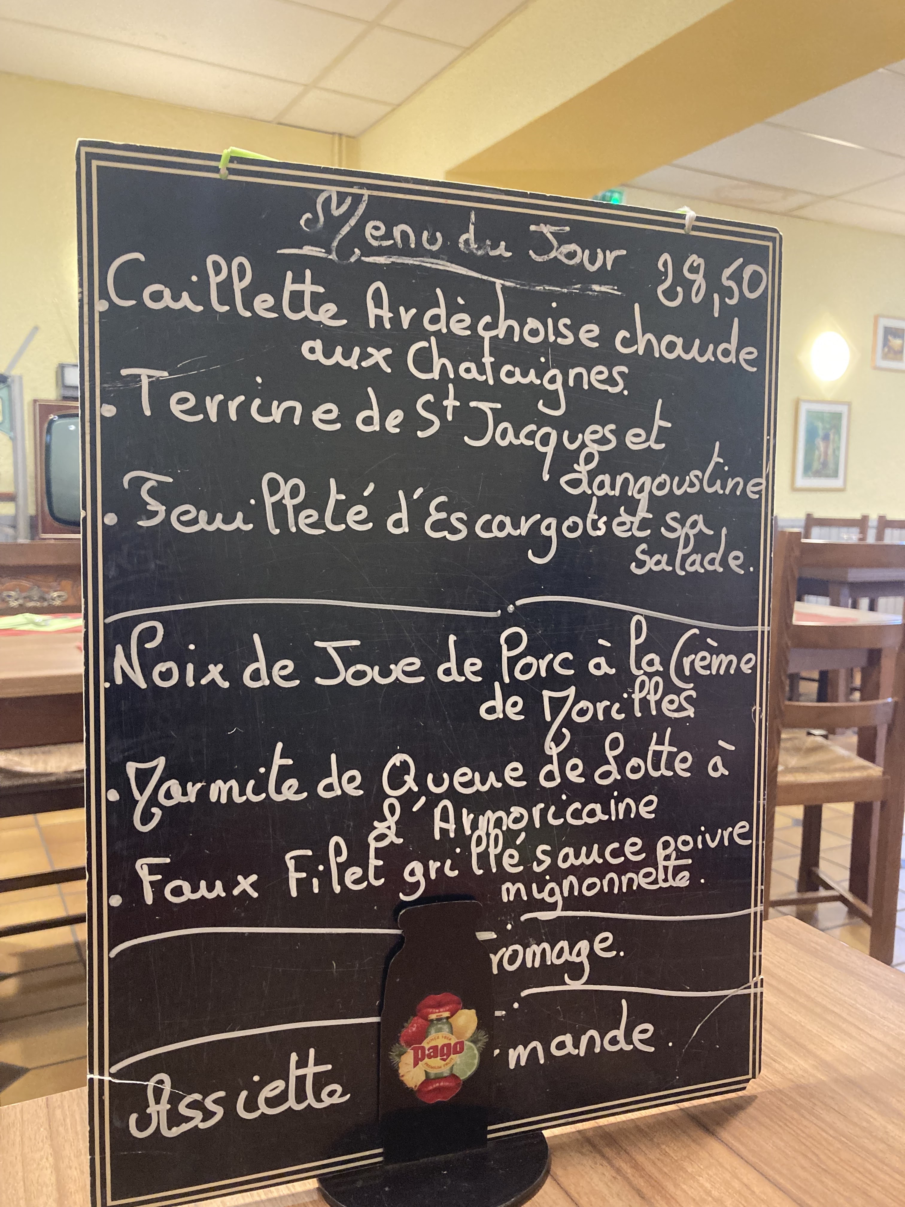 Nous sommes arrivés en retard un dimanche, suite à une douche offerte par la nature (nous sommes motards). Malgré tout, l'accueil a été fort sympathique,le repas excellent , bien servi et entièrement fait maison... pour ma part,ris de veau en salade, pièce de bœuf et pommes de terre nouvelles, plateau de fromages,et café gourmand, rajouter a cela une bière 🍺,un verre de vin rouge 🍷 et un café,,,le tout pour 32€,et cuisiner simplement mais divinement. MERCI ✌️🏍️