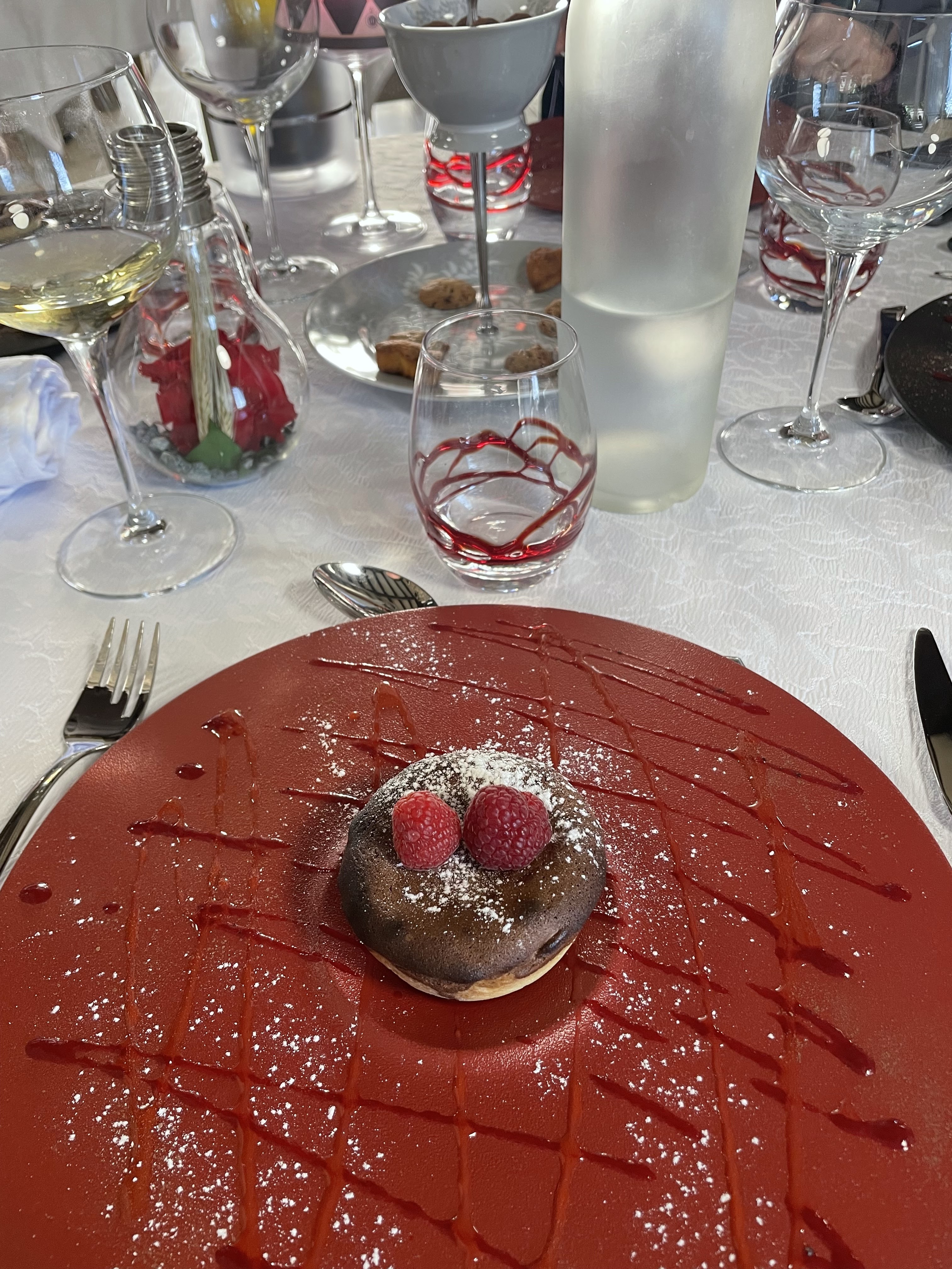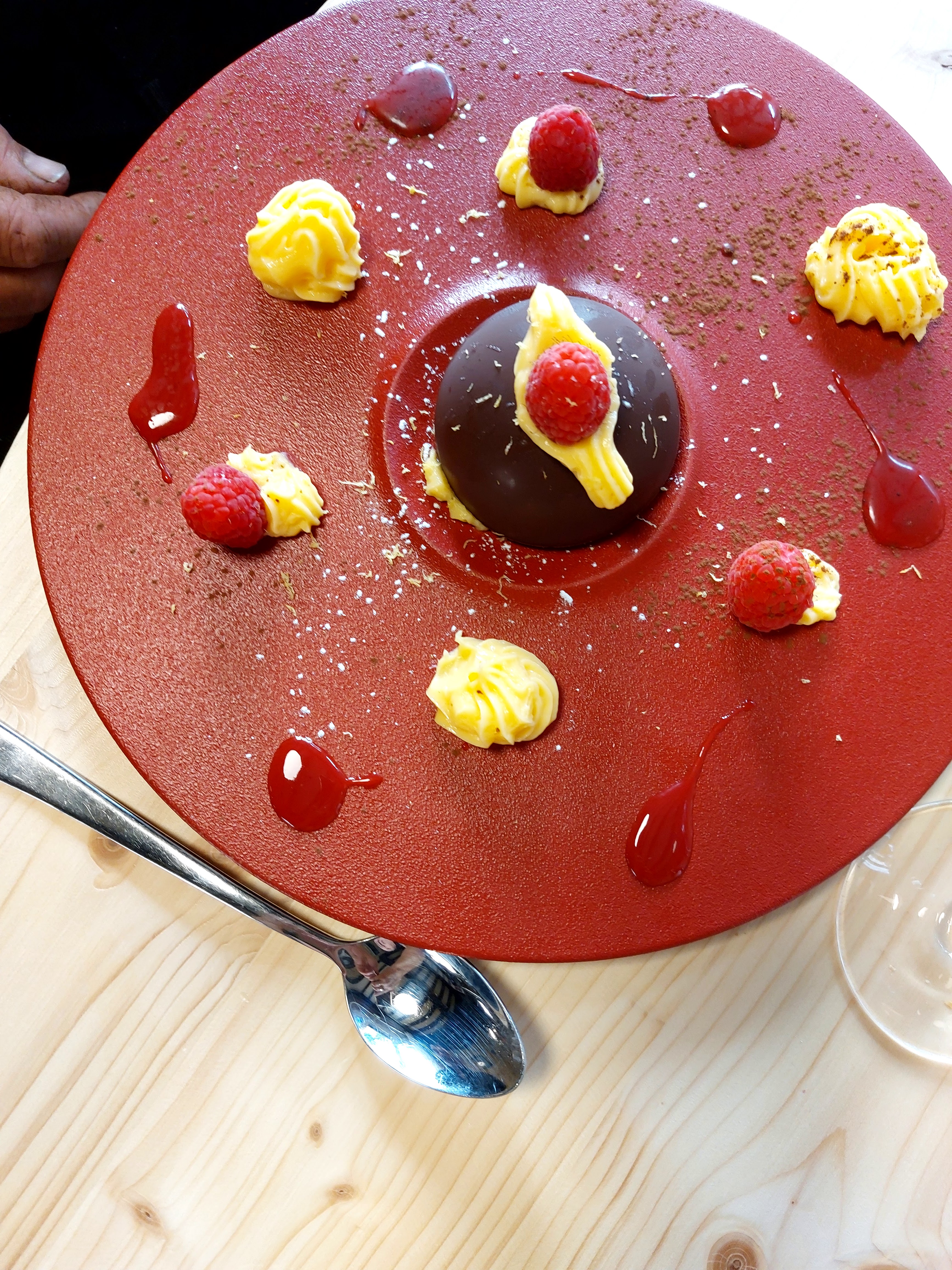 Bel endroit, terrasse très agréable et proche du Château de la Chaix. Nourriture pas mal mais rien de transcendant. Entrée et plat moyen + mais dessert Dôme chocolat passion agréable. Présentation assez jolie mais goût pas a la hauteur de la déco