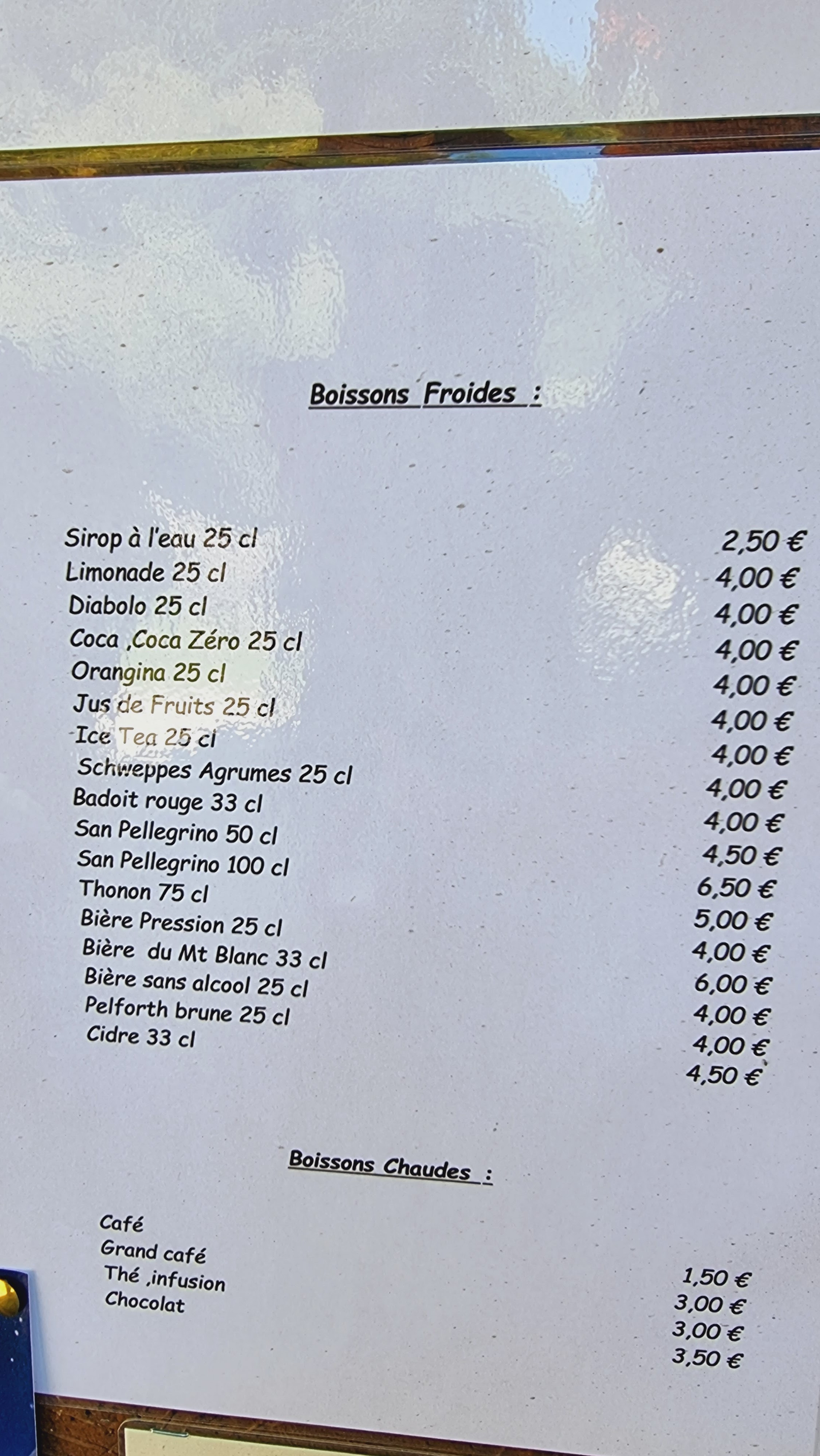 Je préférerai l ancienne gérance avec des plats plus authentiques !Je ne viens pas dans un refuge pour manger des plats revus avec une consonance asiatique !!!Quand aux prix, 12 euros pour 2 bières Blanche du Mont-Blanc en 25 cl 12 euros !!Prendrait on les touristes pour des américains ???
