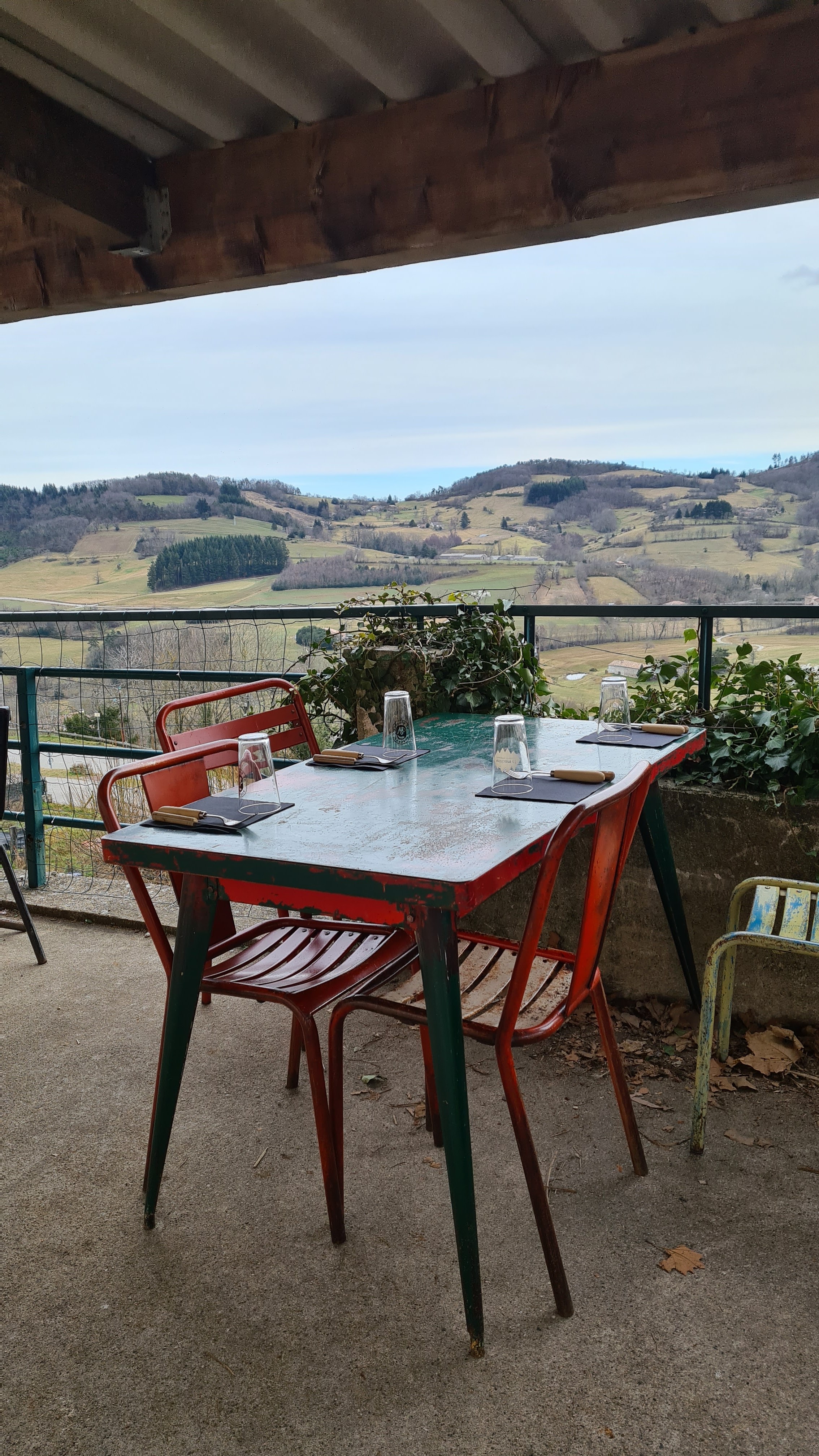 Terrasse couverte très agréable avec une vue panoramique sur les champs et villages alentours , nous avons opté pour les 2 entrées chacun et un dessert. Bonnes prestations, service agréable.