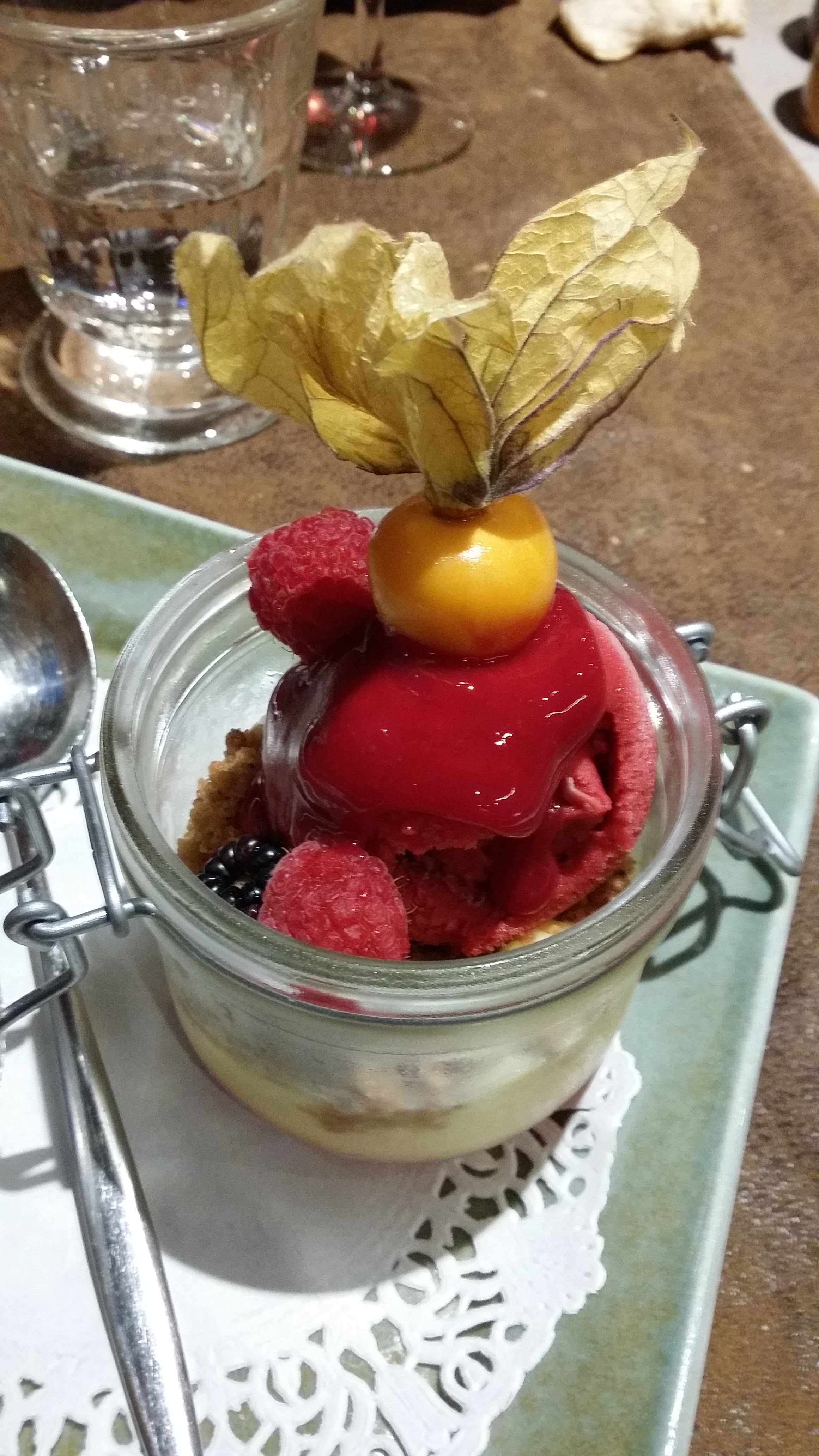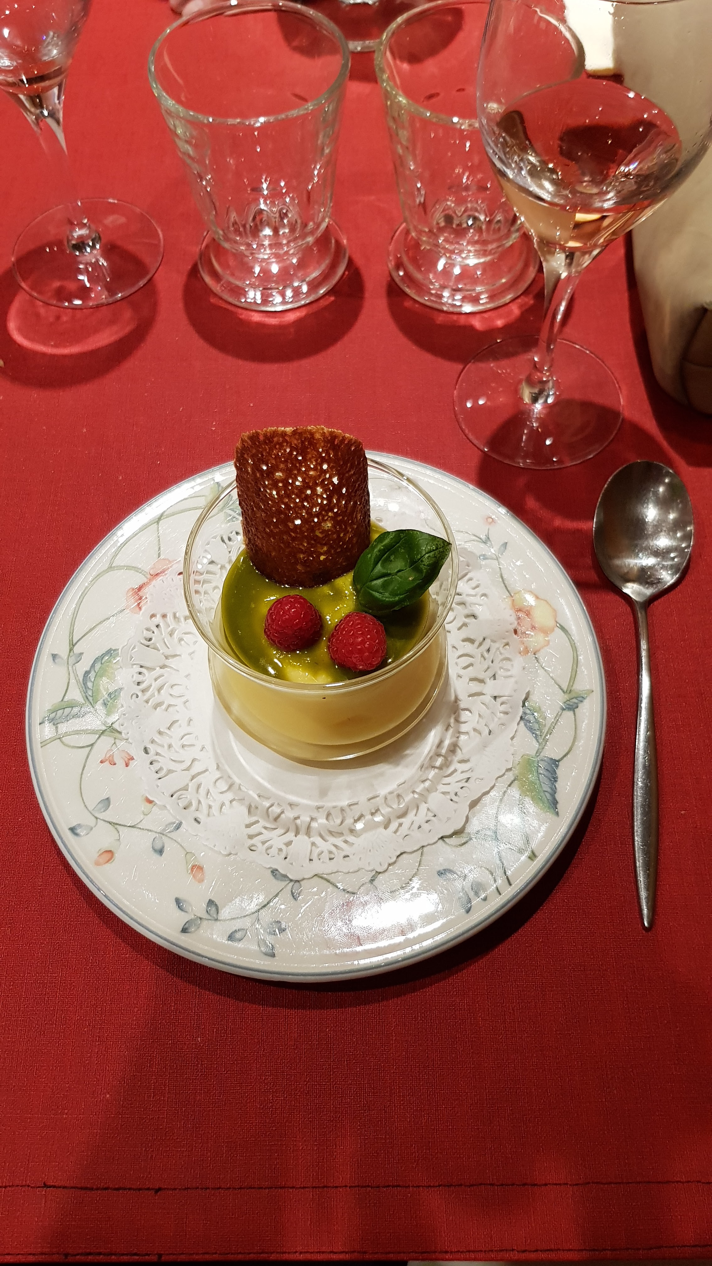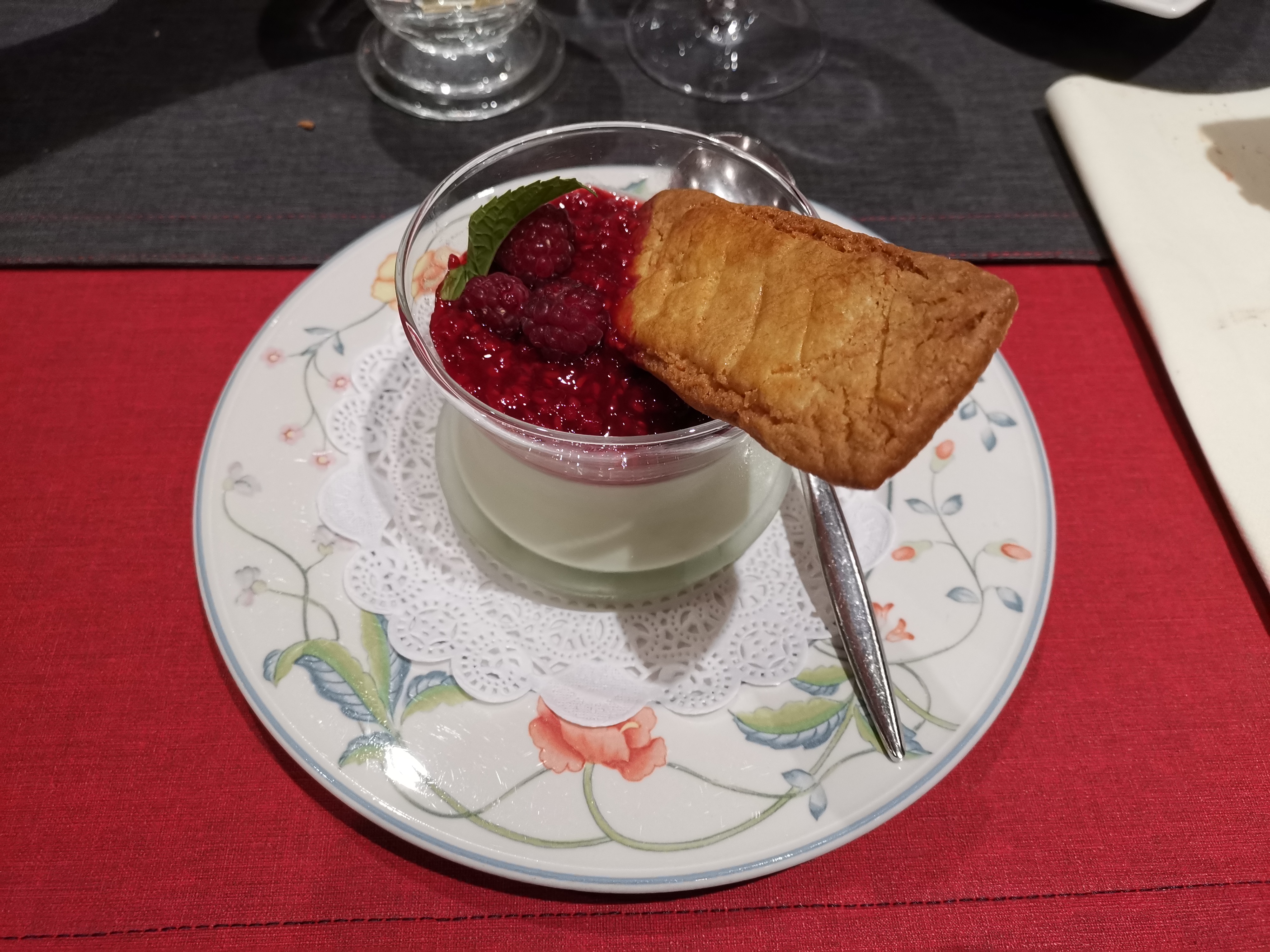 Foie gras & confit de rhubarbe, canette & pêches caramélisées, panna cotta verveine & ses framboises. Un repas succulent et original. Un accueil parfait et des restaurateurs très sympathiques. Une adresse à ne pas manquer !