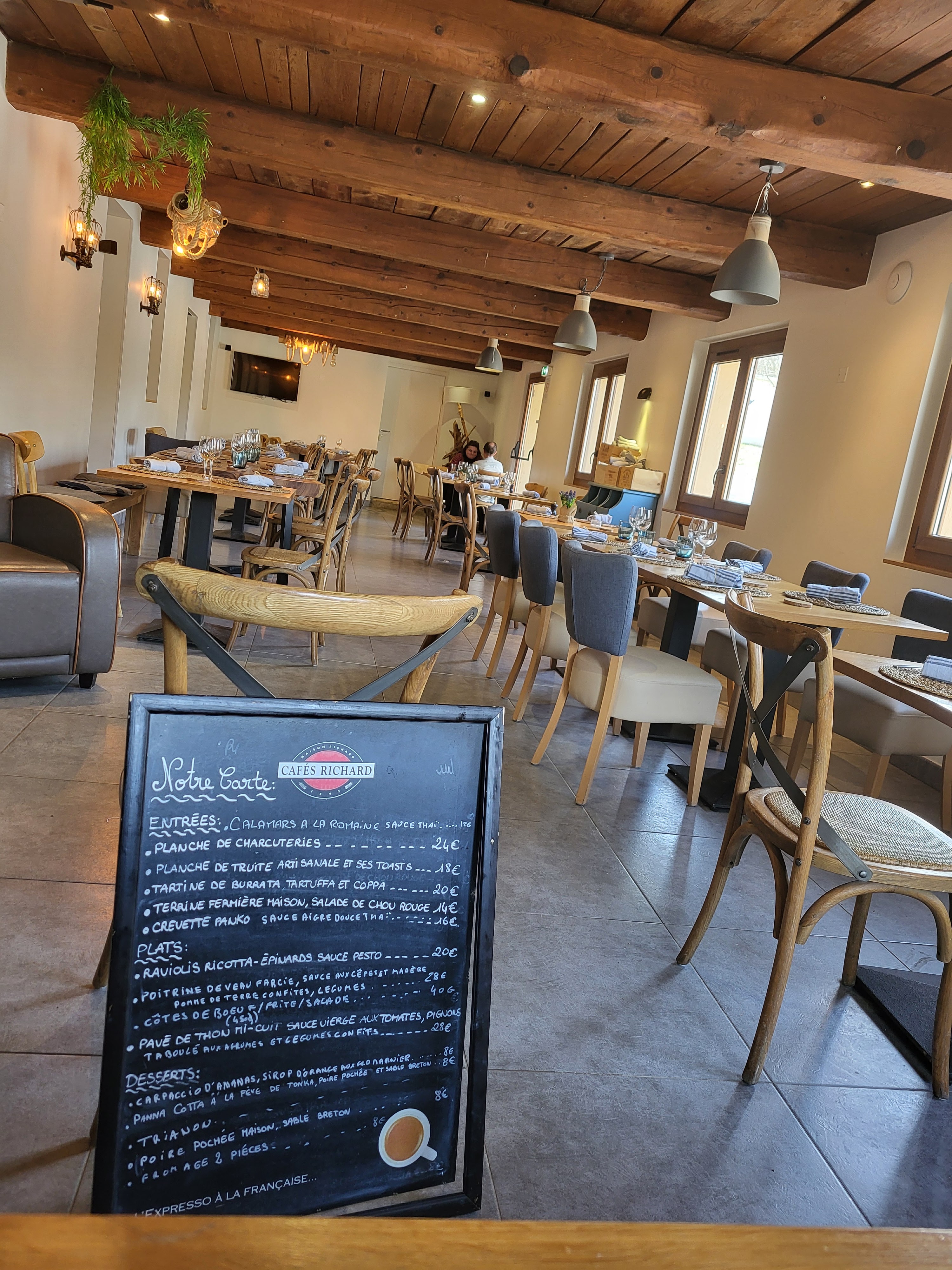 Nous avons été enchanté de l'accueil le cadre merveilleux vu que pas encore de carte un menu du jour avec 3 choix pour l'entrée choix 2 pour plat principal café gourmand excellent et comme je suis allergique à l'ail et que dans les deux plats principaux il y en avait ils m'ont proposé de me faire une bavette et tout ceci pour un prix super abordable 25 € je recommande vivement cette auberge
