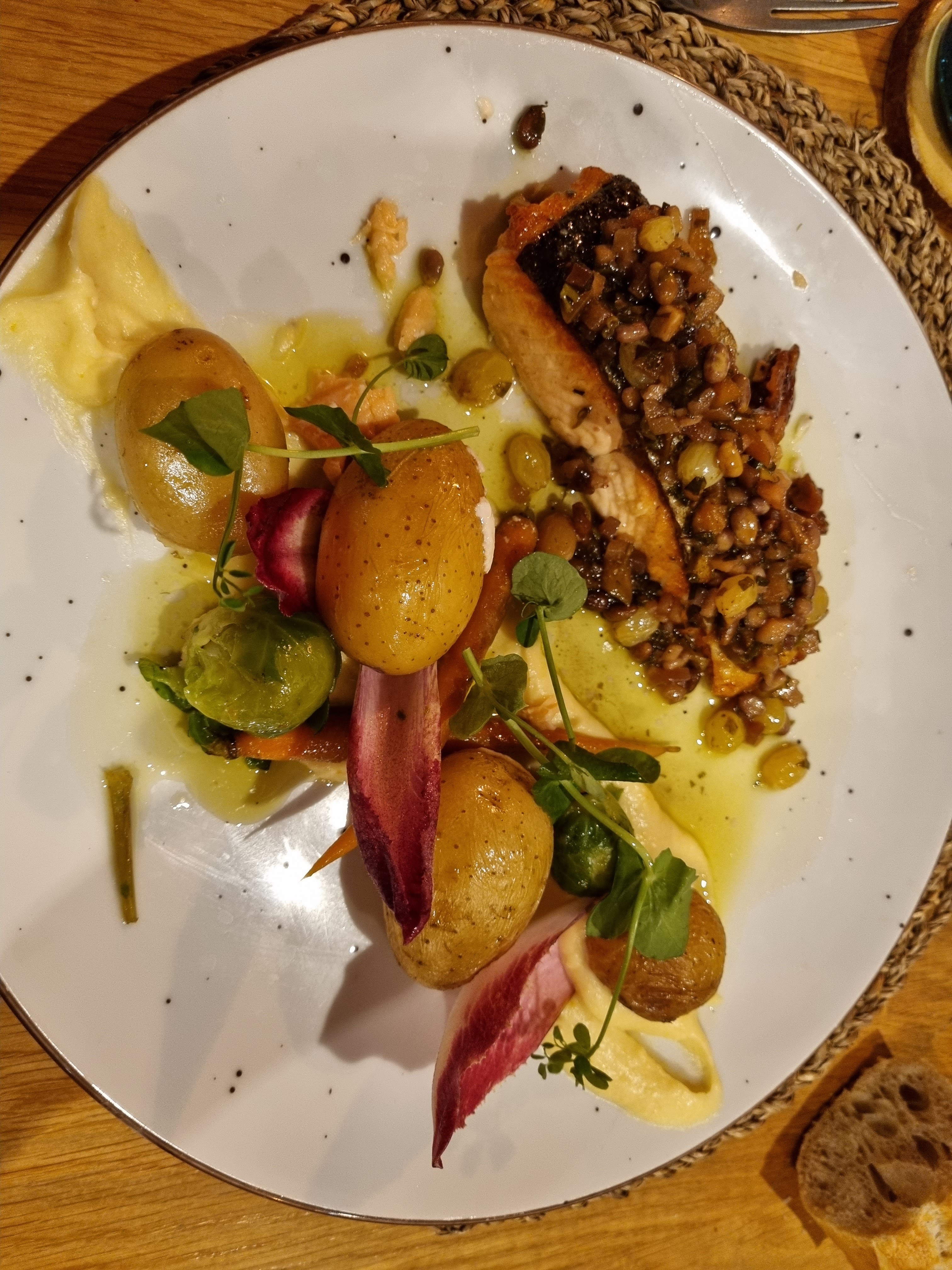 En visite dans les alentours, nous nous y sommes arrêtés sans réservation ce dimanche midi. Personnel très agréable. Nous avons pris un menu à 25€ (entrée - plat - dessert). Assiettes très joliment présentées. Entrées correctes. plat principal filet de truite et purée de chou fleur très bon, saveurs surprenantes. Attention toutefois, les légumes en accompagnement étaient crus - manque de cuisson. Dessert gourmand pas très copieux. En résumé, une Halte déjeuner très sympathique avec quelques petits bémols à corriger. Je conseille.