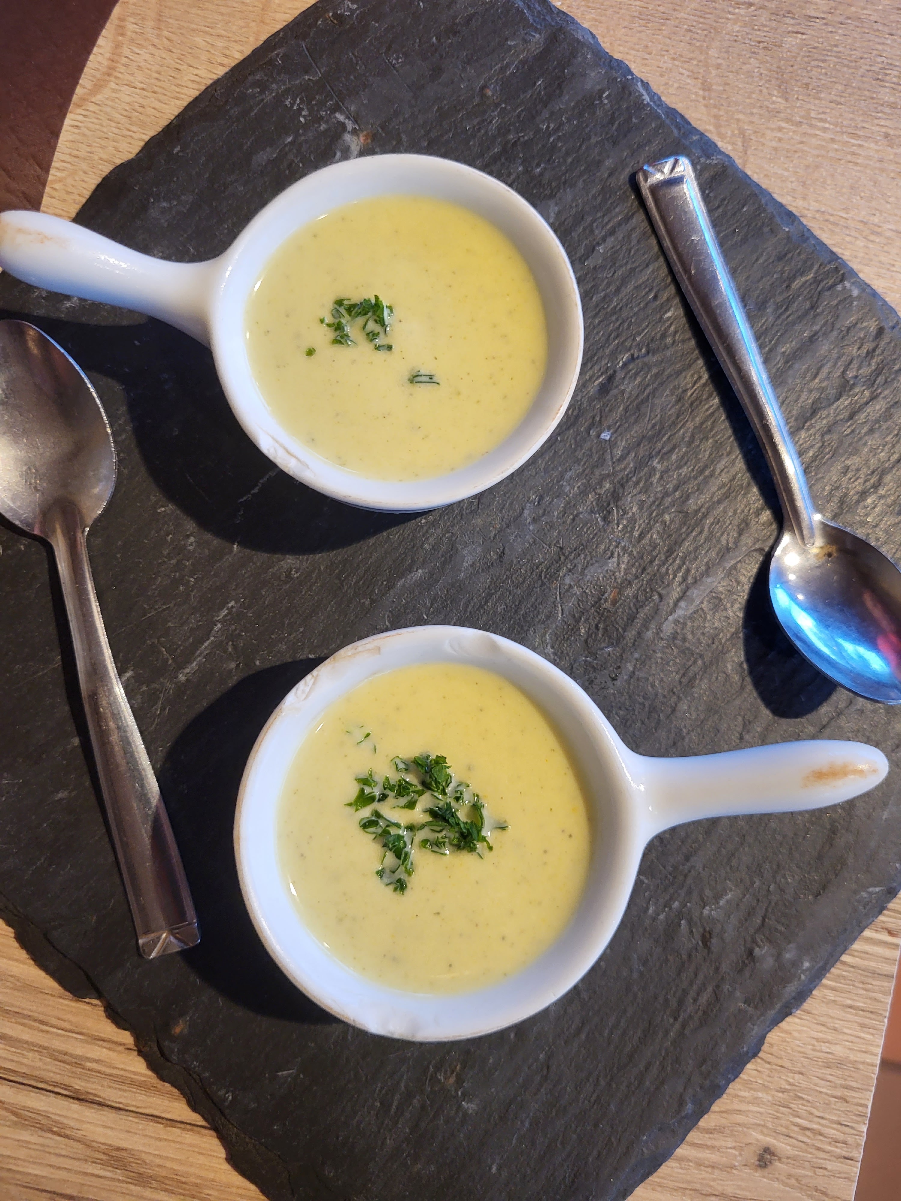 Même si nous n'en avions pas discuté et qu'il n'y avait qu'une seule serveuse présente, nous étions quand même autorisés à venir manger. Accueil très sympathique. Ils se sont excusés à leur arrivée que cela n'arriverait pas si vite, mais il n'y avait aucun signe de cela. En entrée, nous avons reçu une délicieuse soupe froide de courgettes. En plat principal, un très gros et délicieux steak de surlonge avec sauce au poivre, frites et laitue. En dessert un plateau de fromages et un tiramisu. Le plus gros tiramisu que j'ai jamais vu. Bon restaurant et intérieur chaleureux.
