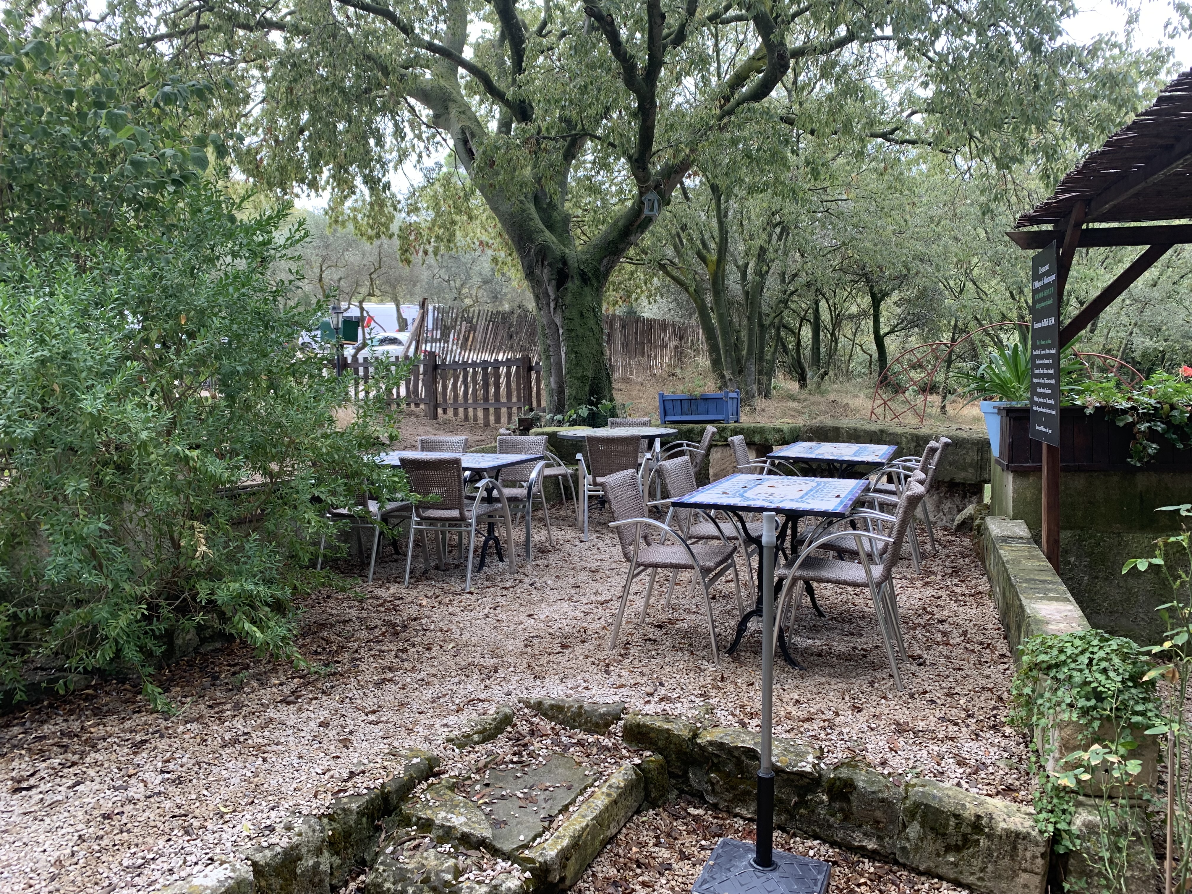 Une terrasse ombragée agréable qui invite à faire une pause. Nous y avons pris un goûter avant de visiter l'abbaye de Montmajour: crêpes, glaces. Grand choix de parfum pour les glaces. L'accueil est agréable. Une carte affiche des spécialités Camargaises pour le midi. L'établissement était fermé à la fermeture de l'abbaye.