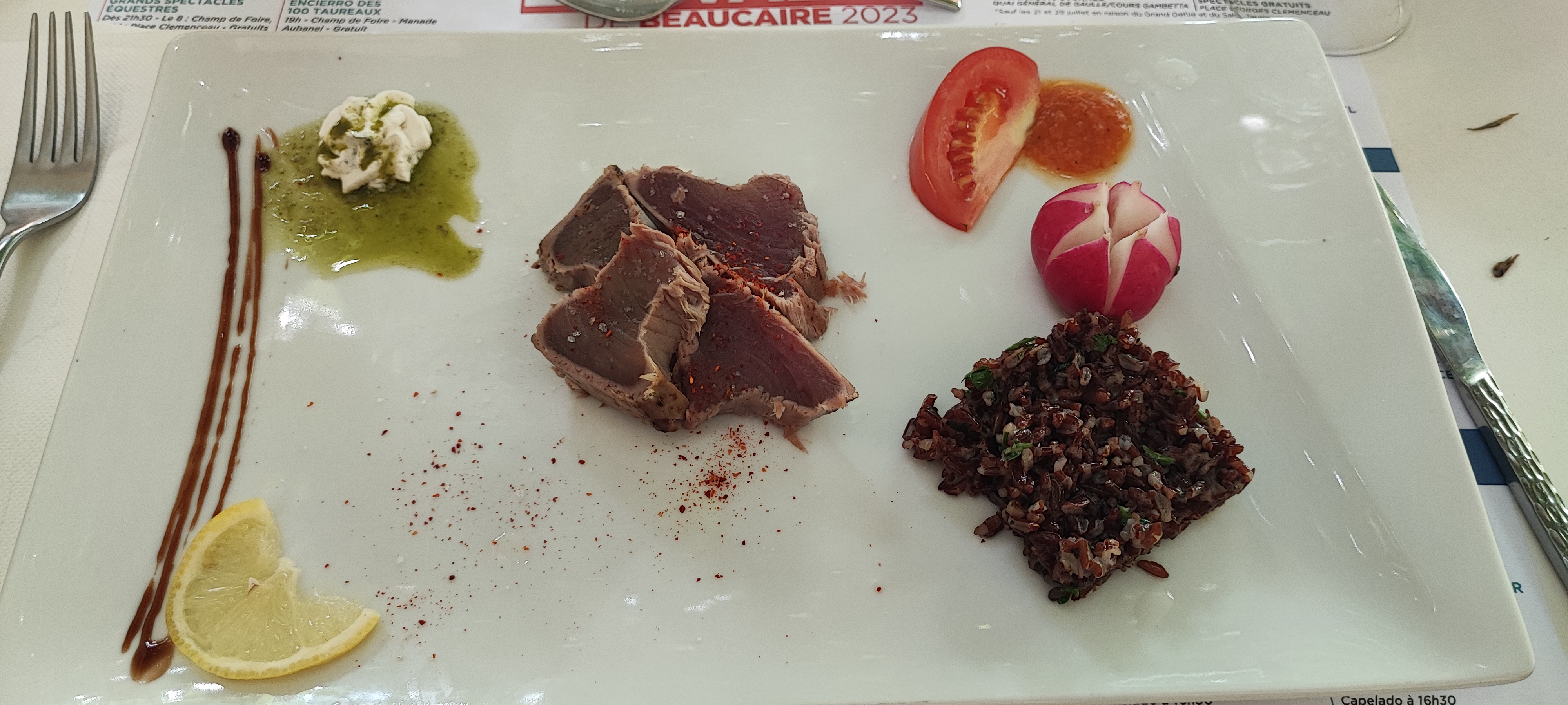 Cadre verdoyant, environnement calme. Très bon accueil. Restauration de qualité, depuis l'entrée (Tataki de thon au piment d'espelette), au plat (Pluma de cochon noir), au dessert (Tiramisu au café). Très bonne découverte. Nous avons passé un très bon moment. Bonne adresse à Beaucaire. Merci beaucoup.