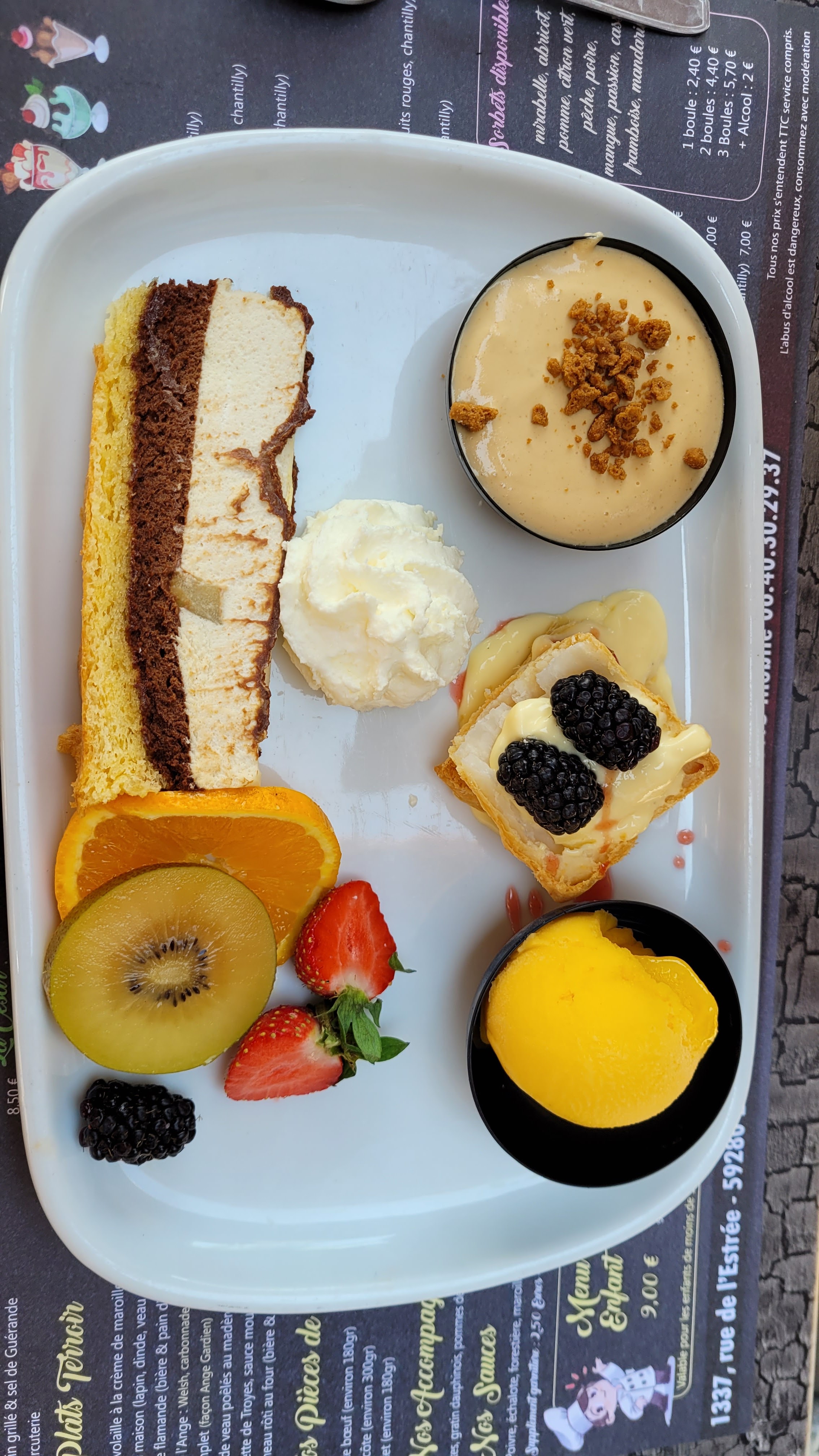 Ce restaurant à un très joli cadre mais aussi un grand choix de plats consistants à la fois sur une ardoise qui change régulièrement et sur un set de table et bien sûr de très bons desserts avec un patron très gentil ainsi que son personnel