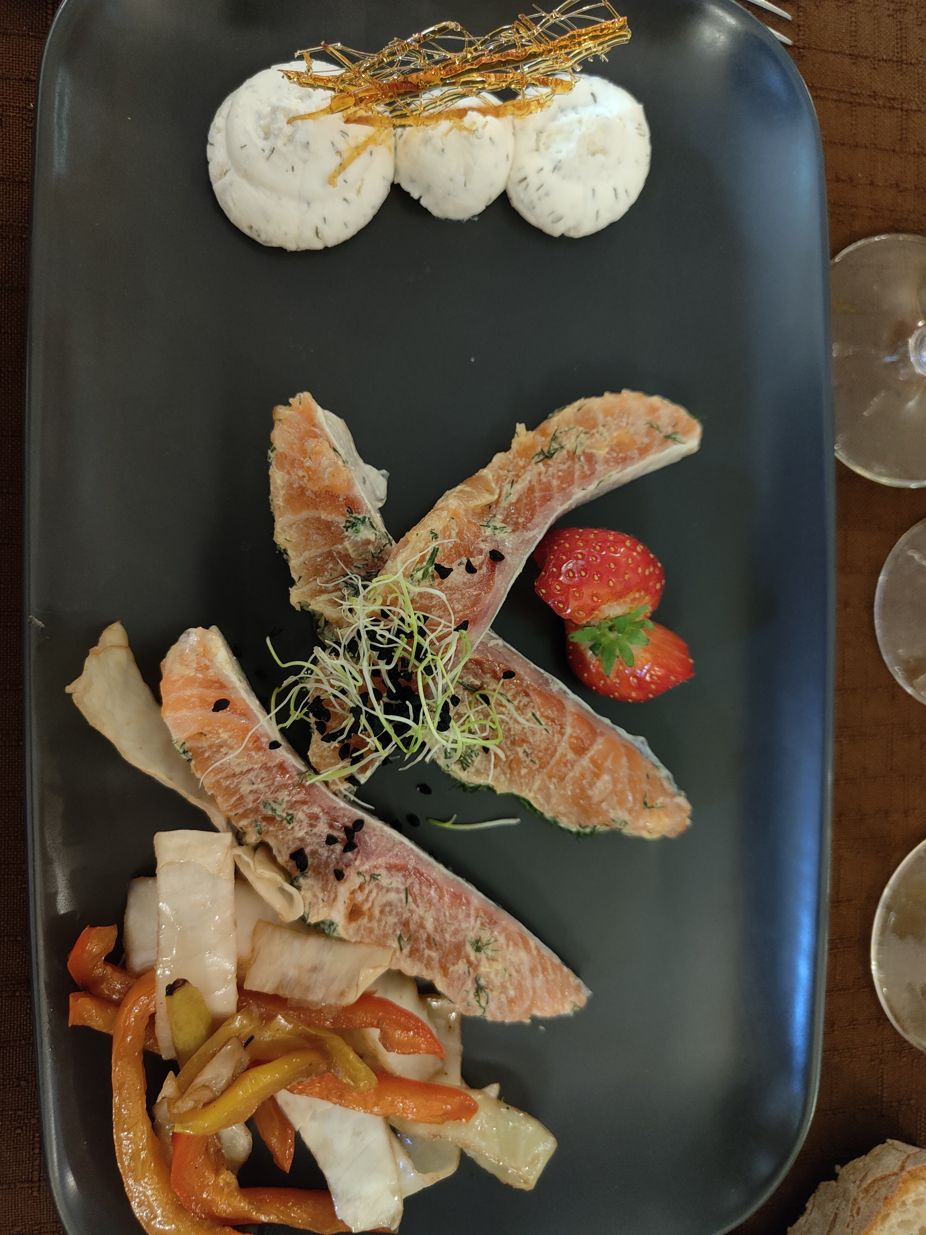 Bon repas mais sans plus. Très bien pour les saint jacques sur velouté de courgettes. Les escargots en cassolette sont copieux mais sauce et assaisonnement fades. Filet de bar, petits légumes de qualité moyenne, je doute que le poisson soit frais (probablement surgelé). Fromage standard. Dessert chou au fruits frais, le chou est sec, pas aéré et donc décevant. Le colonel est cependant au top, servi avec fruits frais et meringues probablement maisons. Un plus pour le service et le vin.