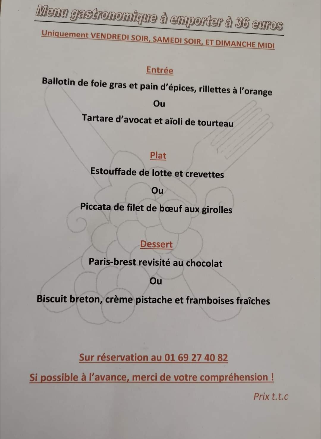 Ce mois ci, le restaurant propose des plats à emporter à 12 euros. Le week end, menu gastronomique à 36 euros. Des patrons très sympathiques qui essayent de s en sortir malgré le covid. Restons solidaires, une cuisine française très très bonne. Je recommande les yeux fermés.