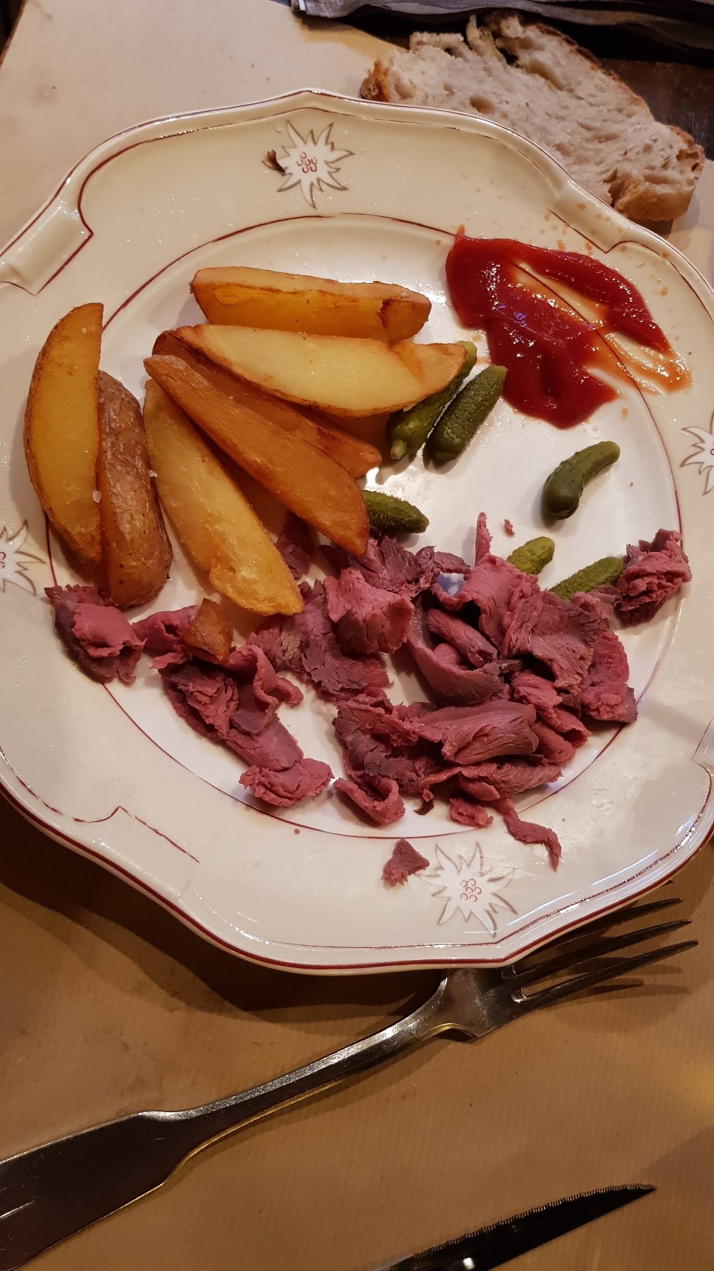 Sommes arrivés un peu tard (14h30) dans l'après-midi, donc pas de choix sinon de la charcuterie, un accueil pas sympa. Le problème n'est pas là, quand j'ai vu l'assiette de charcuterie (très grasse) j'ai cru que c'était pour une personne, nous étions 2, on nous a facturé 3 assiettes, idem pour une banale salade verte. Nous avons laissé un pourboire de 4 € pour les remercier de nous avoir mal accueilli et quitté la table assez rapidement ( avant les autres clients) pour ne pas abusé de leur temps. Nous avons fait confiance et donc pas vérifié la facture. Nous avons été bien entubé.