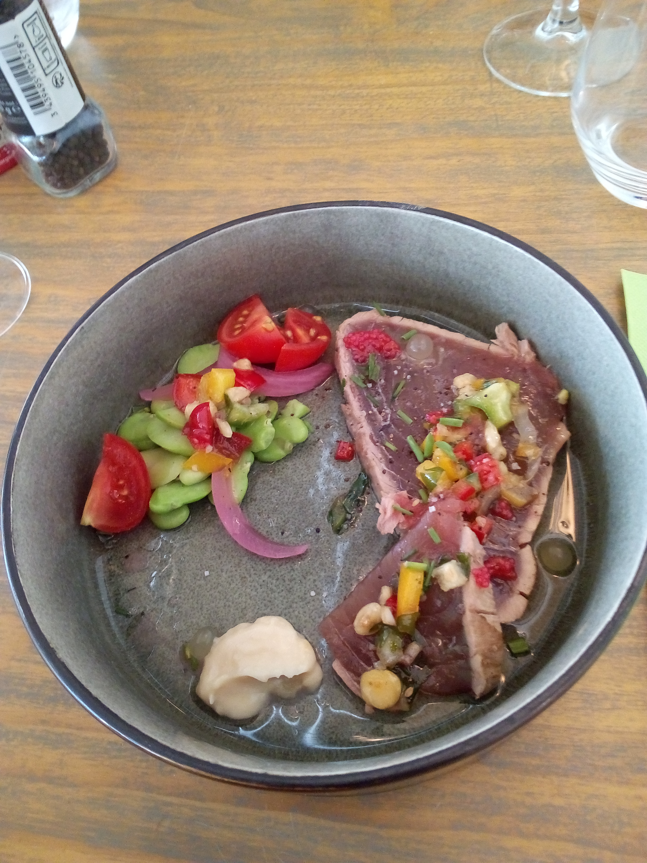 De l'entrée au dessert tout s'enchaîne, de très belles présentations, raffinées et gouteuses le thon au sésame avec ses petits Légumes, une merveille .Nous avons été servis par la propriétaire, très agréable jeune dame dynamique, à l'écoute puis nous avons rencontré le chef cuisinier, son mari, humanité et simplicité. Cette auberge ouverte depuis presqu'un an ,vous transportera à tous moments de la journée et le soir, sous la terrasse ombragée, un véritable moment de détente et de plaisir pour les papilles...bon appétit !