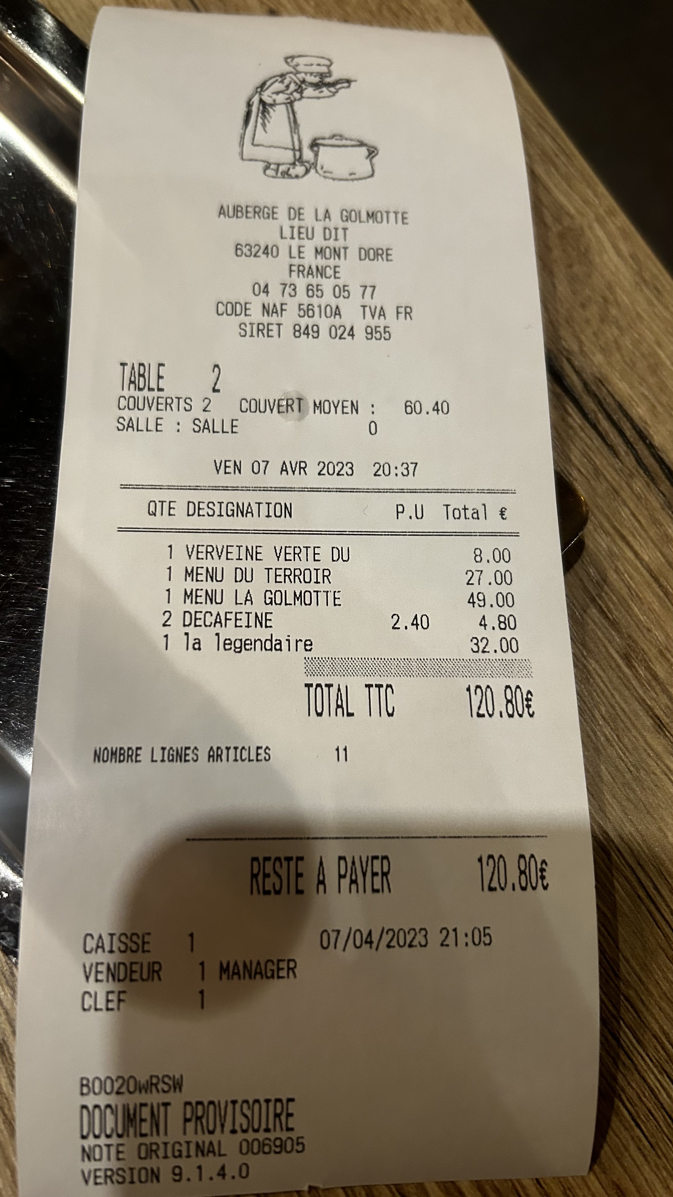 Que dire ?? C est délicieux de l entrée au dessert un vrai régal Un conseil réservez à la Golmotte quand vous serez près du mont dore Bravo au chef