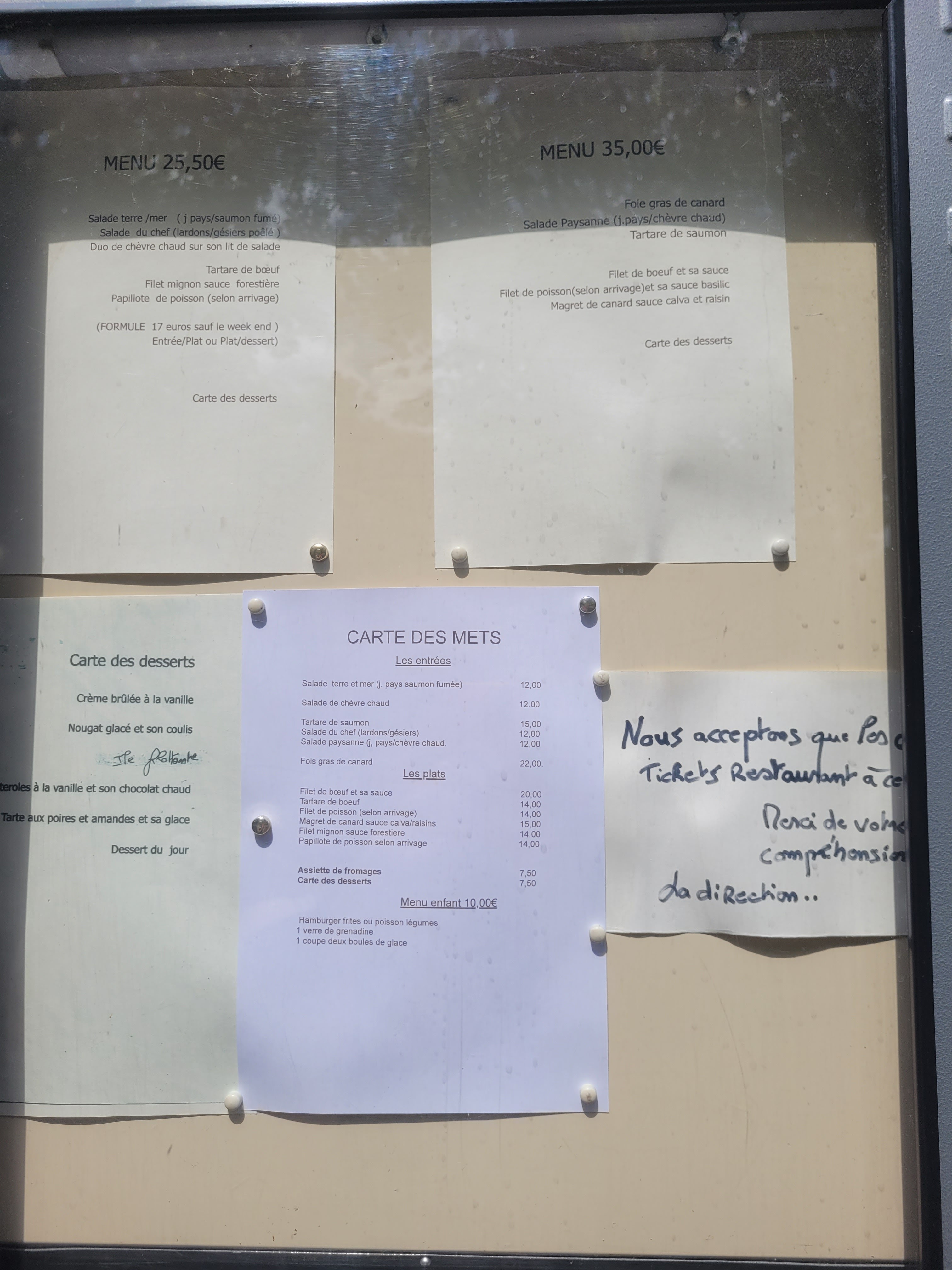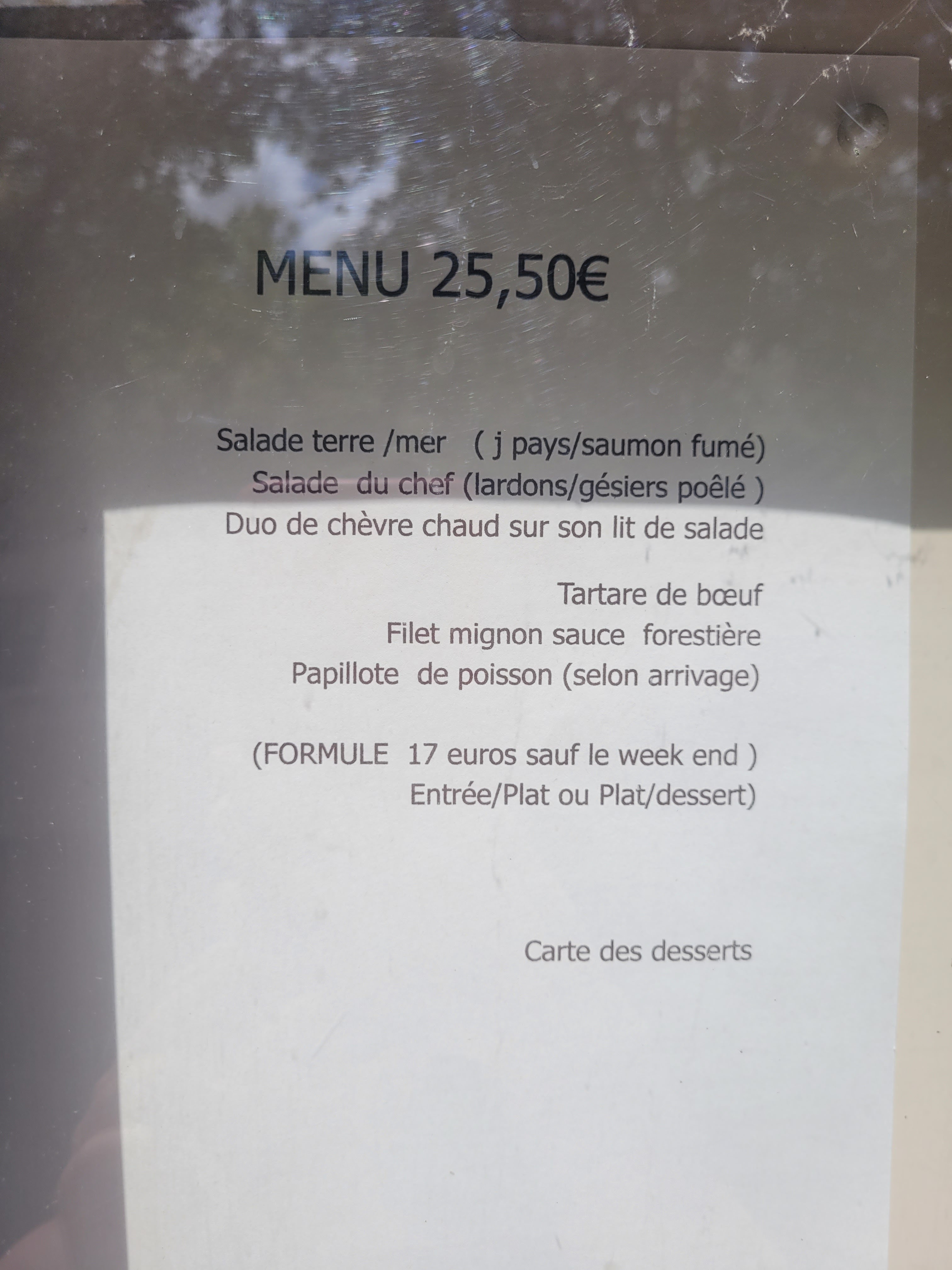 Le repas était vraiment mauvais; pas une seule fois la serveuse nous a demandé si tout allait bien , ceci dit ... je pense qu elle connaissait la réponse... Feuilleté apéritif mou, viande sèche , le morceau de boeuf servi avec des navets ( seul accompagnement...) poisson desséché et recouvert de sauce pour cacher la misère.... bref, je ne saurais pas dire ce qui m a plut dans cet endroit ! Remarque, rien qu à la lecture de la carte et son état....😒 nous avions qu une envie.. déguerpir ! Menu à 35€ , qui pour moi, ne vaut même pas 15 €! À bannir !!