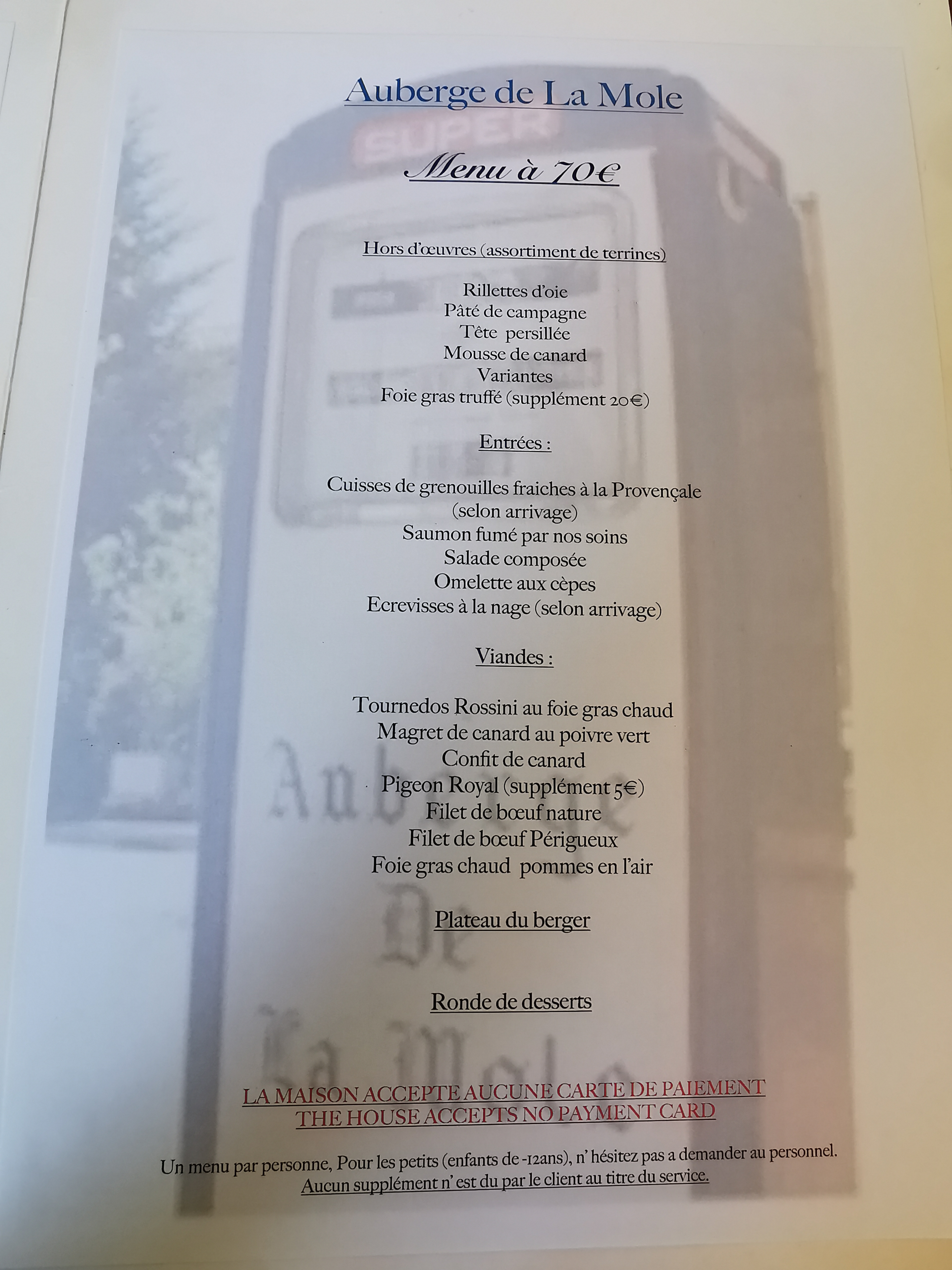 Une belle et bonne adresse festive et généreuse et depuis longtemps ! ... Superbe ! Nous avons rencontré cette année la 3° génération, 1er dîner sous le grand-père (années 70), puis restaurant cogéré par sa fille et son fils et maintenant la petite-fille (en salle) et son mari (en cuisine). Tradition respectée et transmission réussie dans un cadre agréable, convivial et discret. Une cuisine française, bourgeoise, de qualité, une restauration traditionnelle qui fonctionne bien et de longue réputation. Sur la route principale entre Bormes et St Tropez, les habitués dégustent les pantagruélique (régime et petit appétit s'abstenir) menus proposés (entrées, plats - dont 3 ou 4 viandes au choix, salade, plateau de fromages et desserts) à 33€ le midi (40€ avec le tournedos Rossini) et 55€ le soir, dans une belle ambiance comme au bon vieux temps. Produits de saison, frais et bien cuisinés, exemples : terrines (extra, faites maison et à volonté : persillé, mousse de foie, rillettes, pâté de campagne, … accompagnés d'un énorme bocal de cornichons, petits oignons blancs et légumes vinaigrés), foie gras maison, cuisses de grenouilles, langoustines à la nage, omelette aux cèpes, pommes de terre aux truffes, tournedos Rossini, magret de canard au poivre vert, confit de canard, filet de bœuf nature, filet de bœuf Périgueux (accompagnement, gâteau de pommes de terre à la sarladaise et aux truffes), poêlé aux pommes, crème aux œufs, poires au vin, mousse au chocolat, pruneaux confits (desserts à volonté), … j'en passe et des meilleurs ! Tout est bon à l'Auberge de la Mole. Carte des vins à couper le souffle (choix, niveau et prix). Accueil et service extra. Un restaurant à fréquenter, la fidélité de la clientèle en témoigne d'ailleurs. Nous reviendrons, longue vie à la 3° génération ! Nota : réservez dans la TB salle à l'arrière du restaurant et l'Auberge ne prend pas les cartes bancaires.
