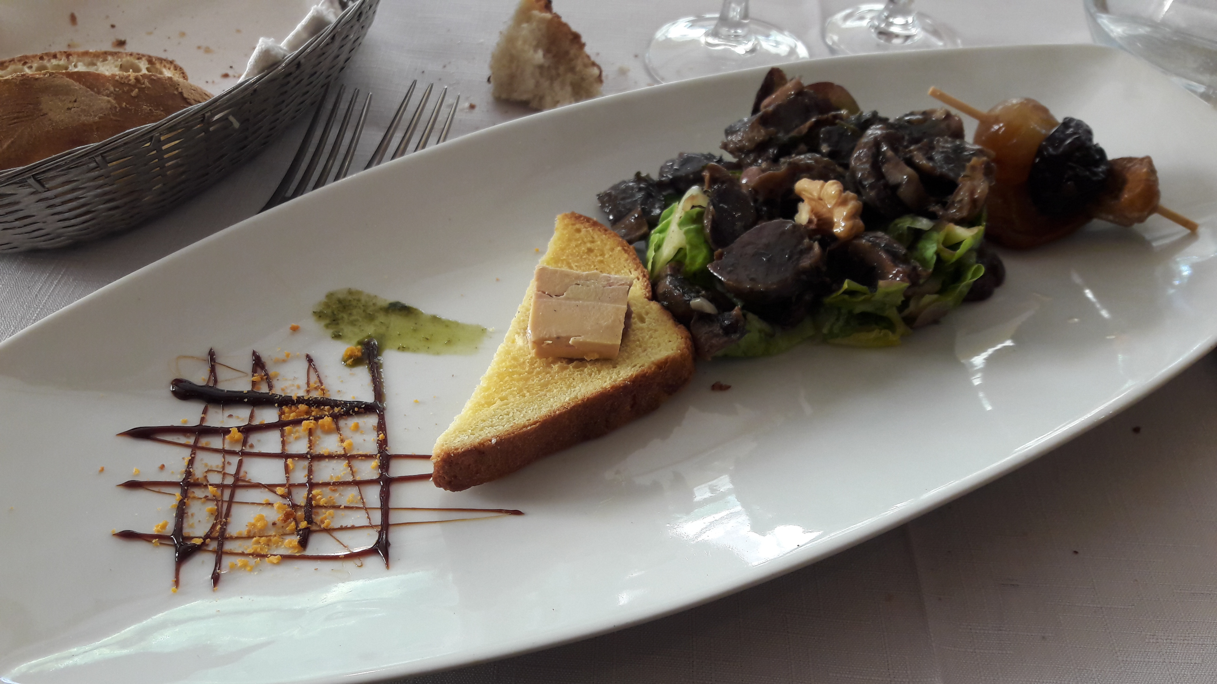 Cabécou, duo de foie gras, ris de veau, ballotine de poulet fermier, mousse au chocolat et pruneaux. Le tout excellent.
