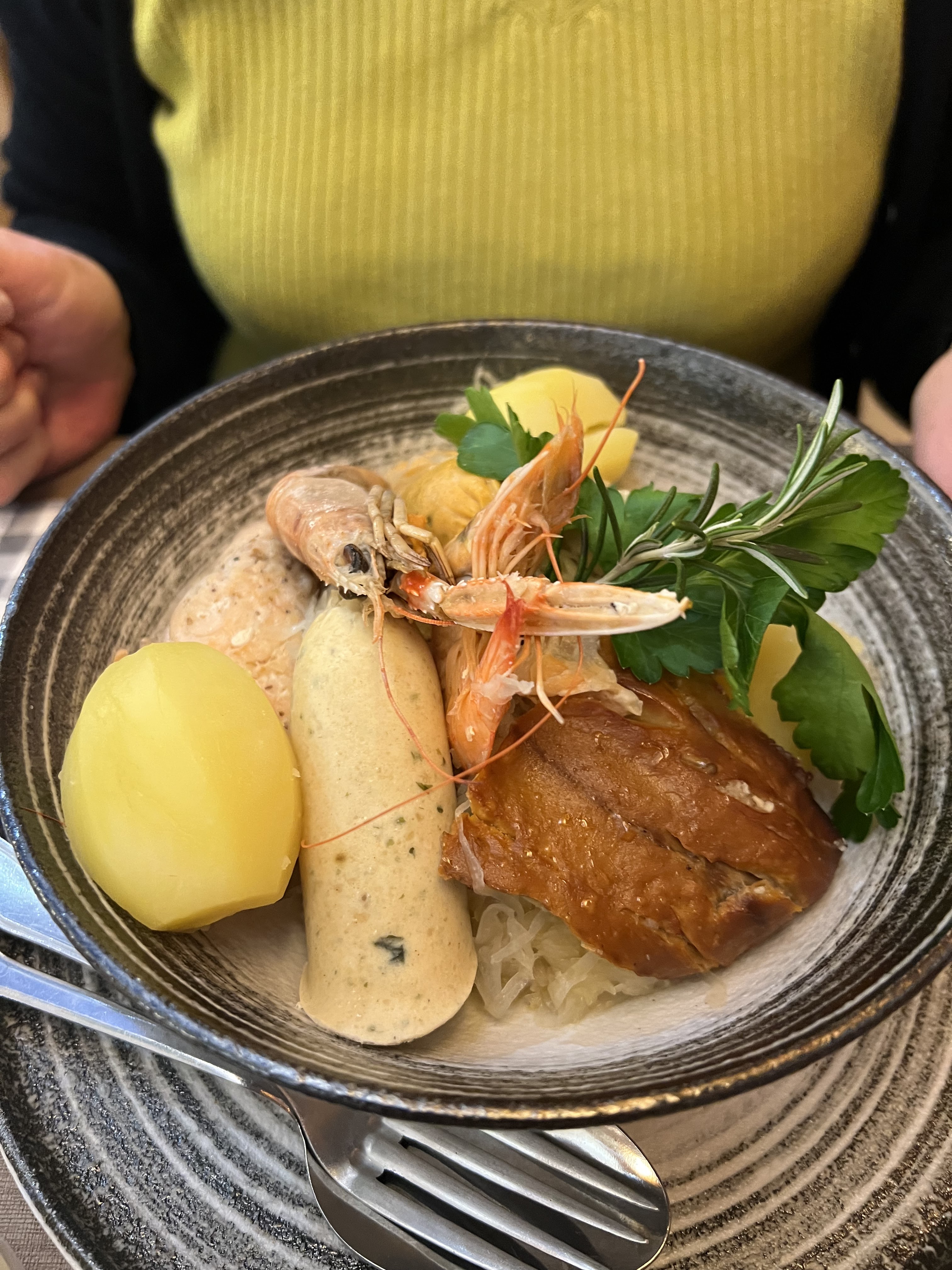 On s’est régalés ! Jolie déco de Pâques , accueil souriant et sympathique , service rapide , plats très joliment présentés et TRÈS bons ! Je recommande le steak rossini et la choucroute de poisson. Les desserts = originalité dans la déco