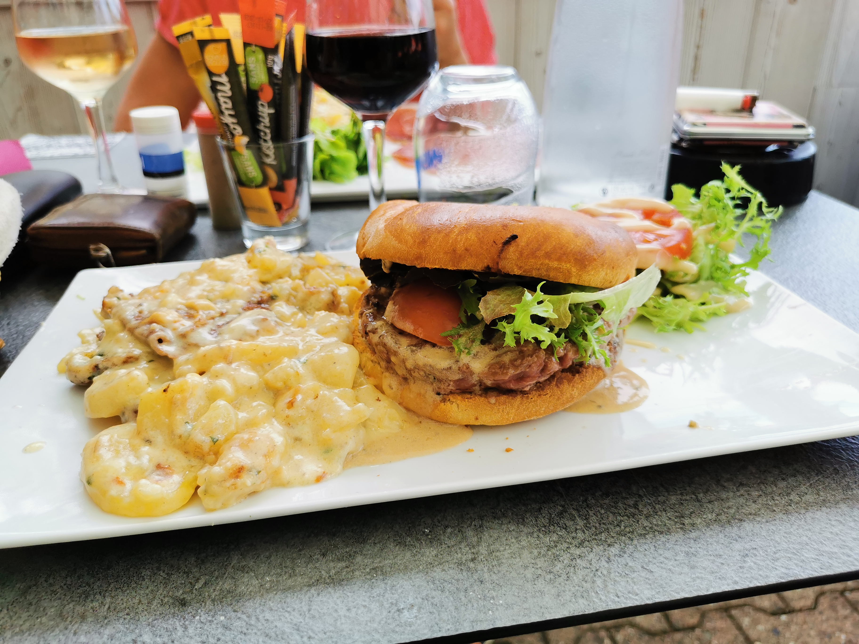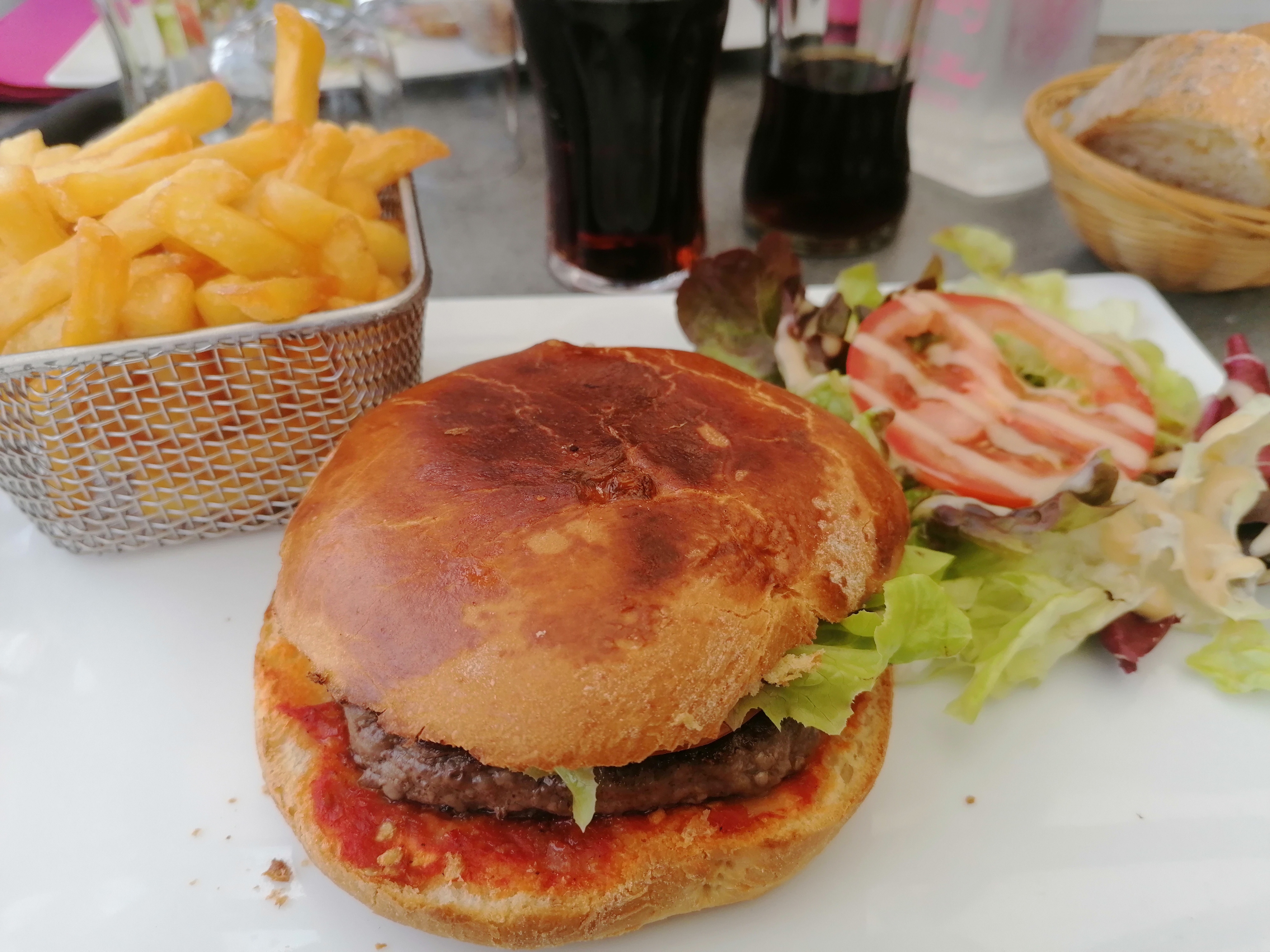 Malgré la chaleur nous avons apprécié le hamburger auvergnat servi avec de délicieuses frites et le hamburger du patron avec un truffée excellente De plus le lieu est magique À recommander