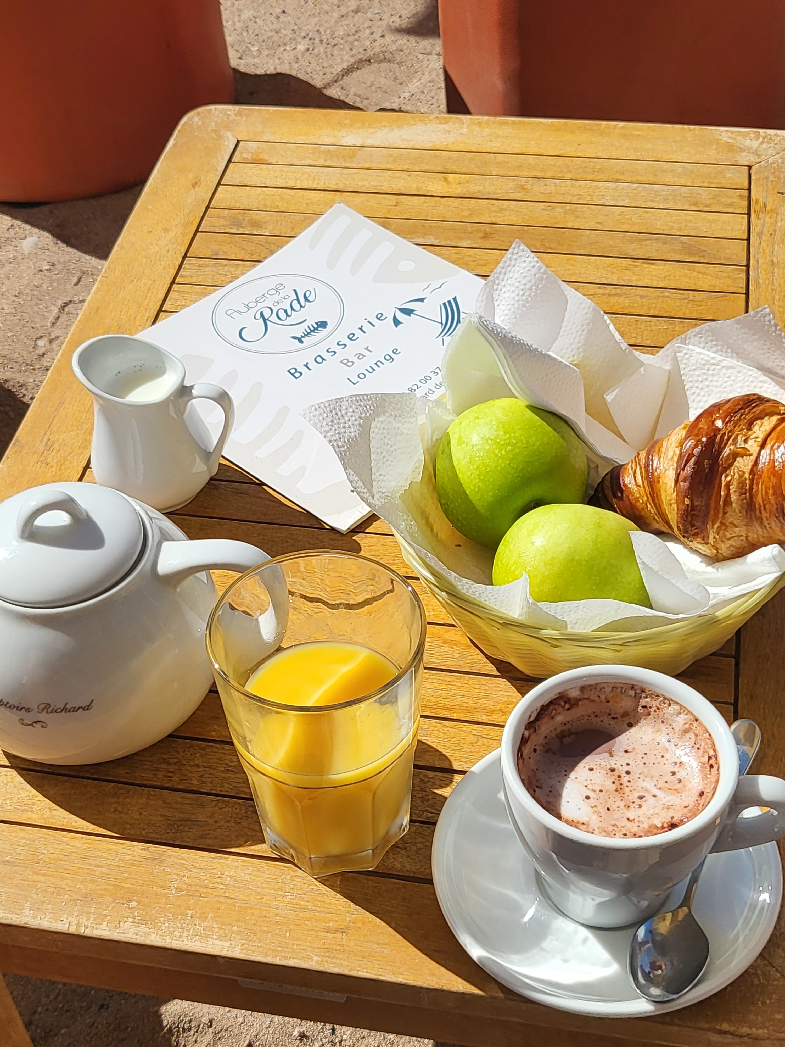Nous avons été ce matin prendre un petit déjeuner. Nous étions 4 personnes. La carte indiquait pain beurre confiture ou viennoiseries. Jus d’orange et fruits . Nous demandons des viennoiseries il n’y en avait pas .et nous réclamons le fruit comme indiqué sur la carte . Le serveur nous dit qu’il n’y a pas de fruit compris dans la petit déjeuner . Alors pourquoi le mettre dans la carte et pourquoi mettre viennoiseries puisqu’il n’y en avait pas non plus ??? Et évidemment le sourire et la sympathie de la serveuse et du serveur ( ou patron je ne sais pas ) nous a égayé la journée . Ns faisons de l’humour évidemment si cela peut les faire sourire un tout petit peu .a 10.50€ le petit déjeuner c’est drôlement cher