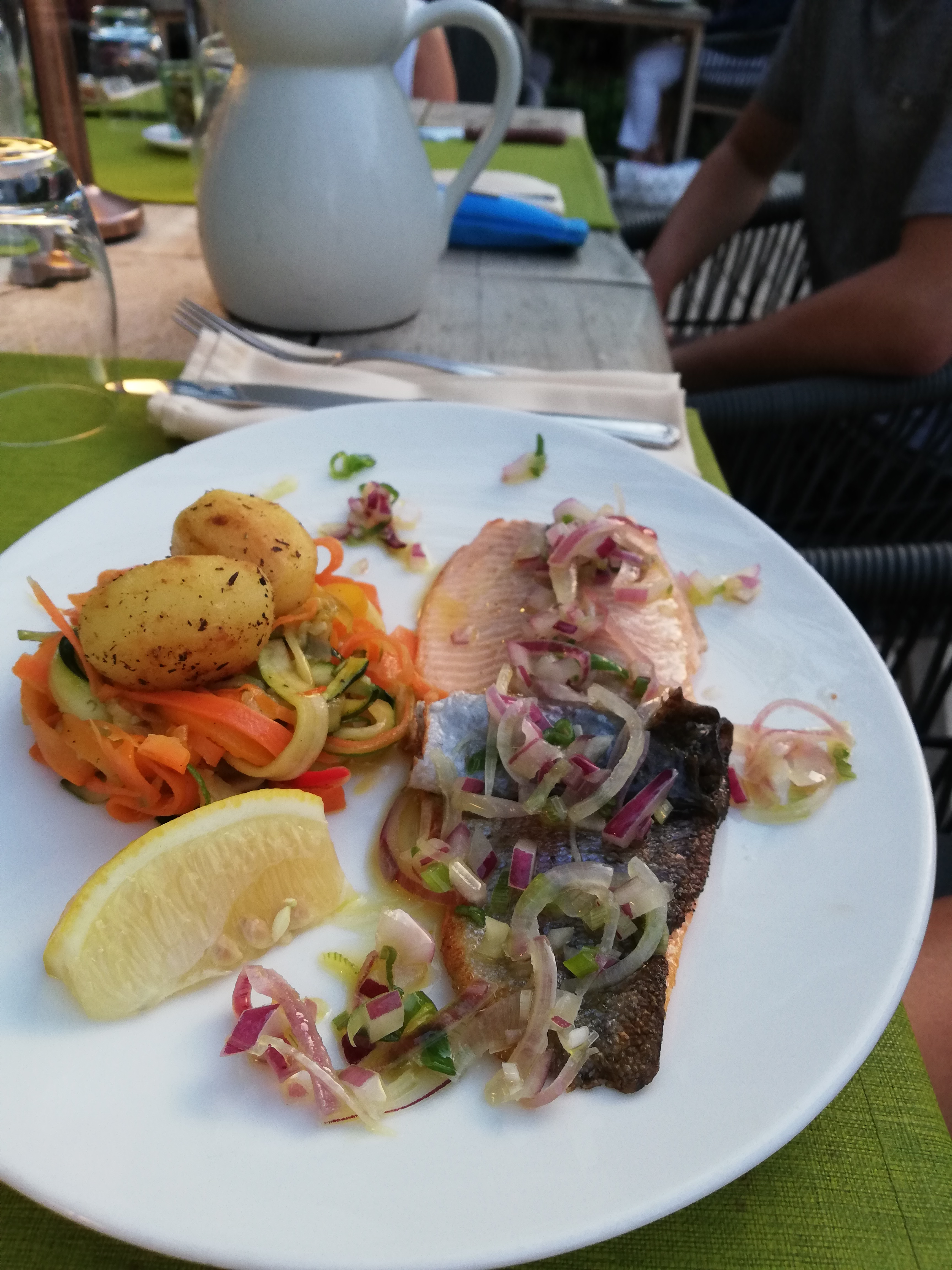 Cadre charmant, jolie carte. Les plats étaient bons mais un peu salés à notre goût.