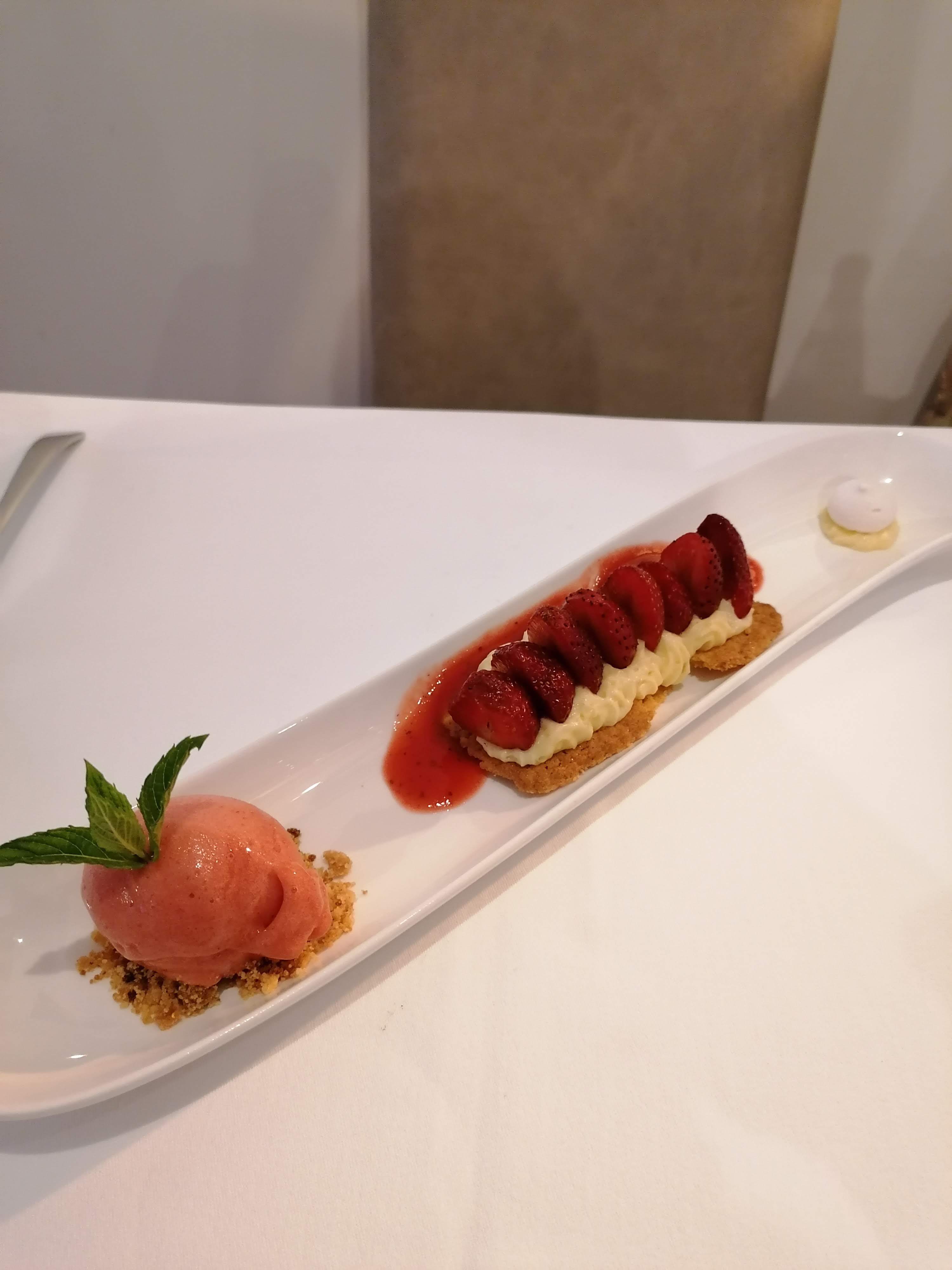 Délicieux menu du marché, composé d'une salade coque et homard, d'un filet de saint pierre sauce agrumes et d'une variation de fraises 🤩
