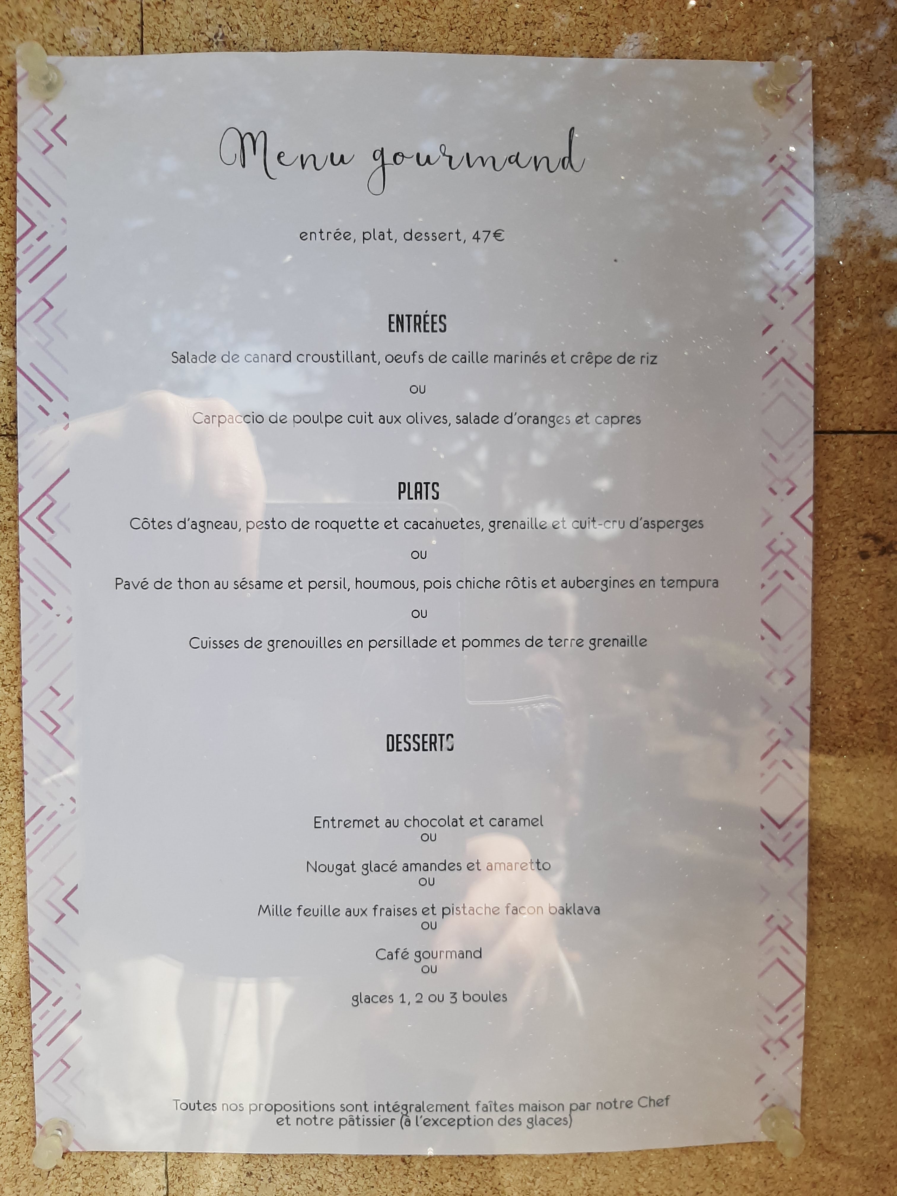 Rien de bien a part la vue et 1 service pro... 1 plat seul calerait a peine 1 enfant....pourtant prix exorbitant 20 euros 2 mini bout de viande et mini gratin 🤔foutage de gueule ! Poulet en croûte sans goût et basique avec mini purée de brocoli Bref ça a bien changer depuis un années.. .honteux !a bannir