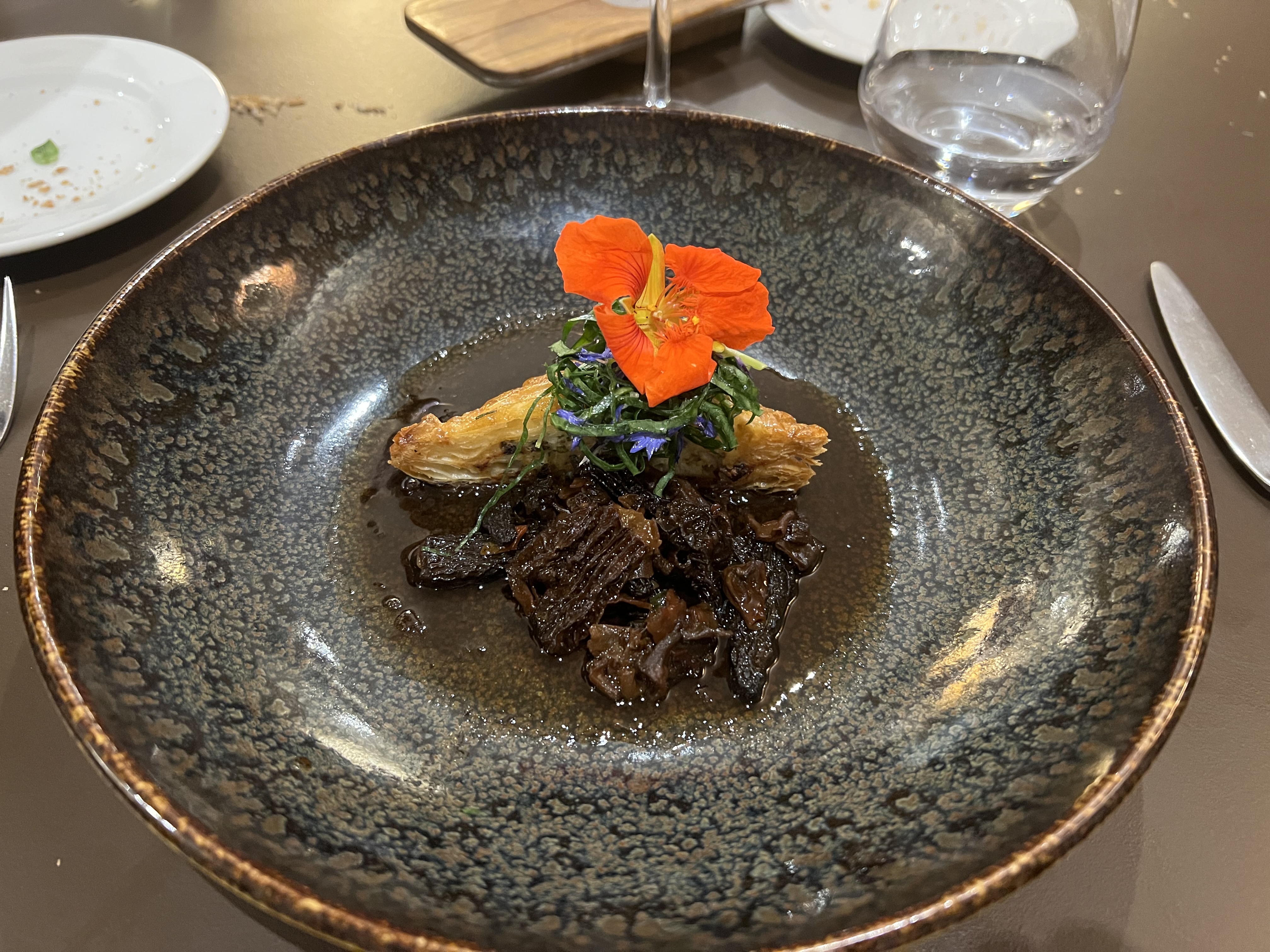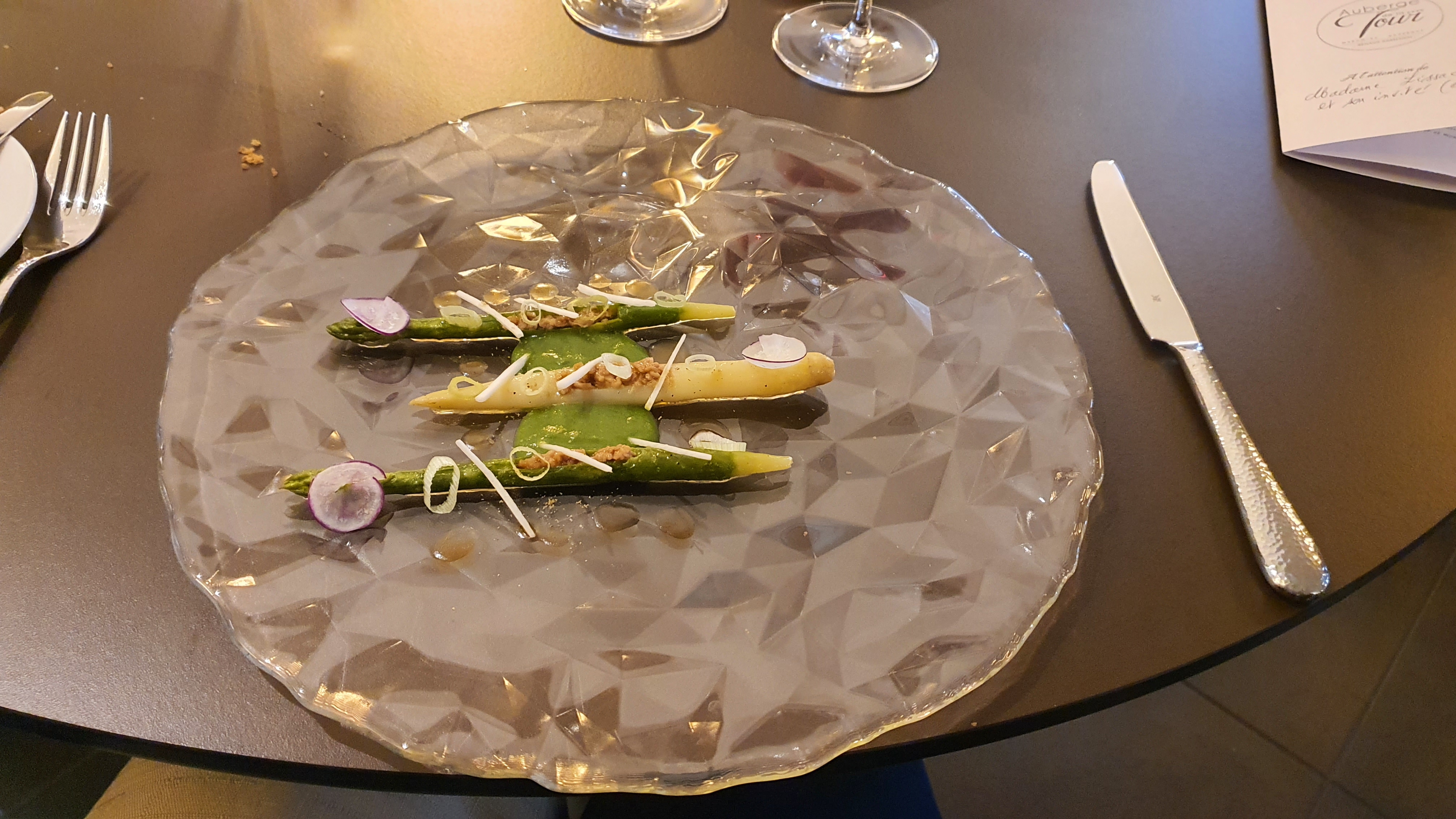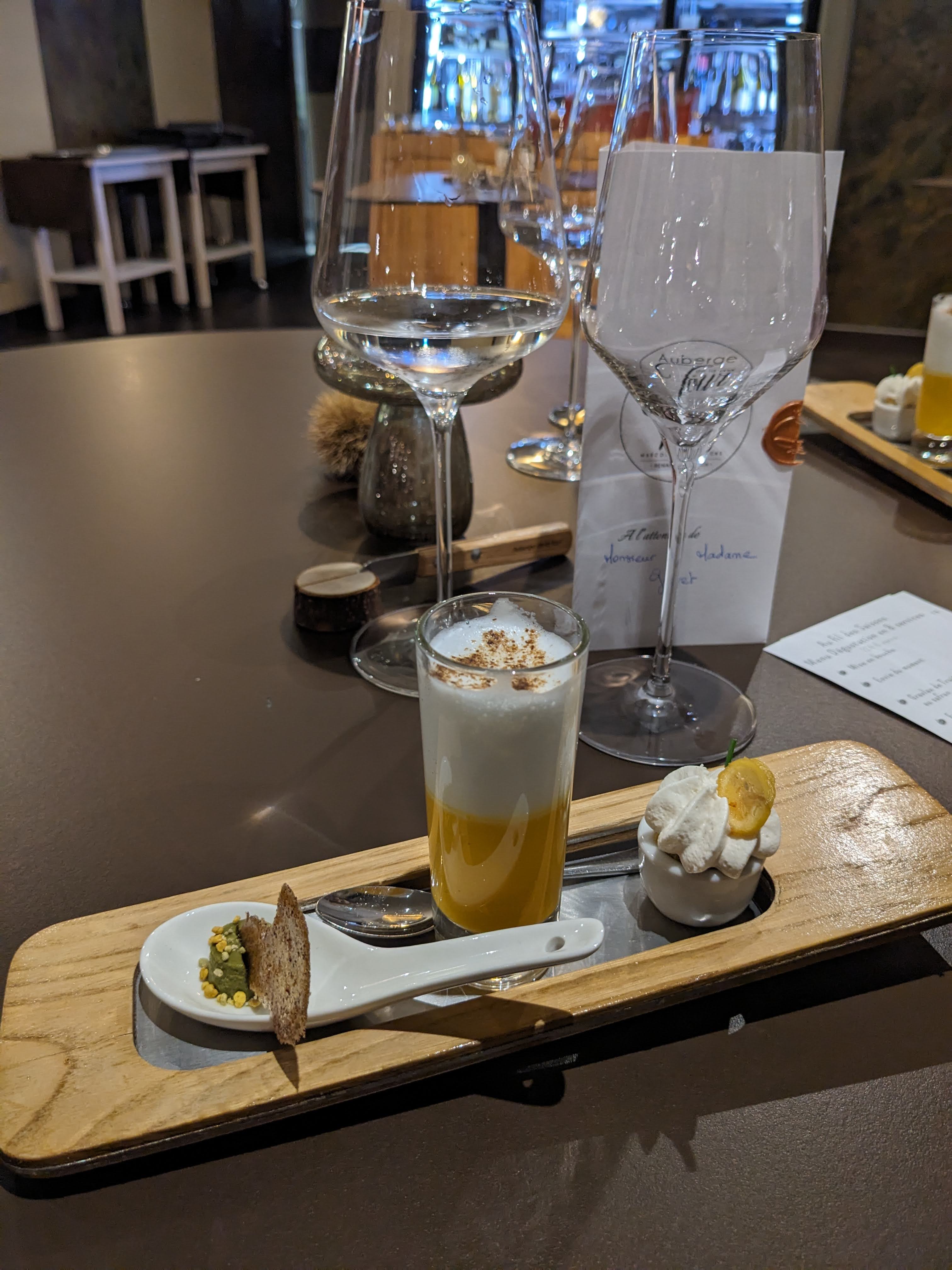 Expérience un peu contrastée. Les plats sont bien exécutés et joliement présentés nous faisant découvrir quelques spécialités régionales. Les bouillons délicieux (cela faisait très longtemps que je n'en avais pas savourés d'aussi goûteux), le plateau de fromages bien fourni avec des fromages locaux, viandes et poissons cuits parfaitement. En revanche, le dessert constitué de pommes et de céleri était très clivant (certainement un choix assumé du pâtissier): mon mari l'a beaucoup apprécié alors qu'au contraire je l'ai détesté. Le goût du céleri était trop prononcé pour moi et malheureusement pas assez contrebalancé par l'acidité des pommes.