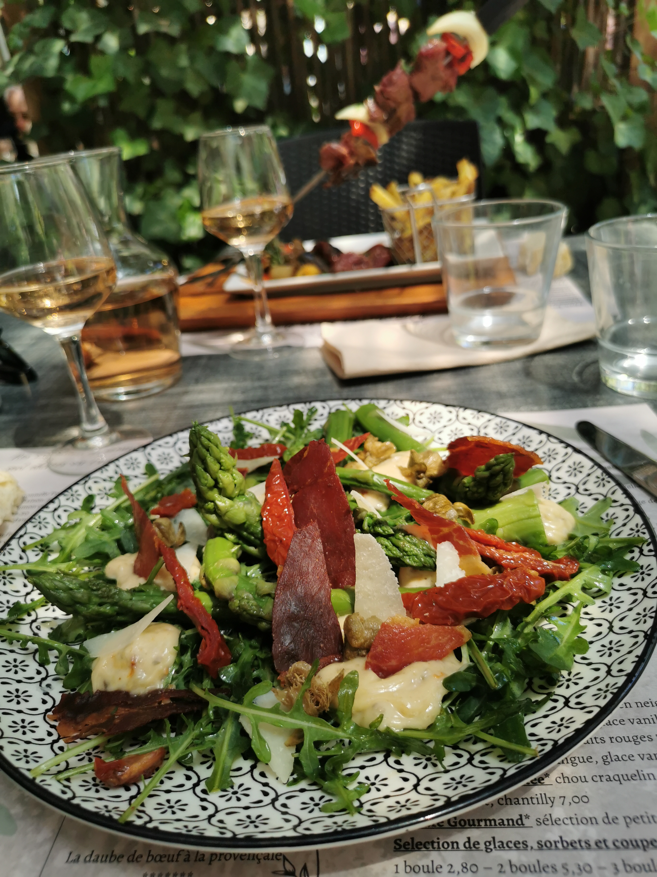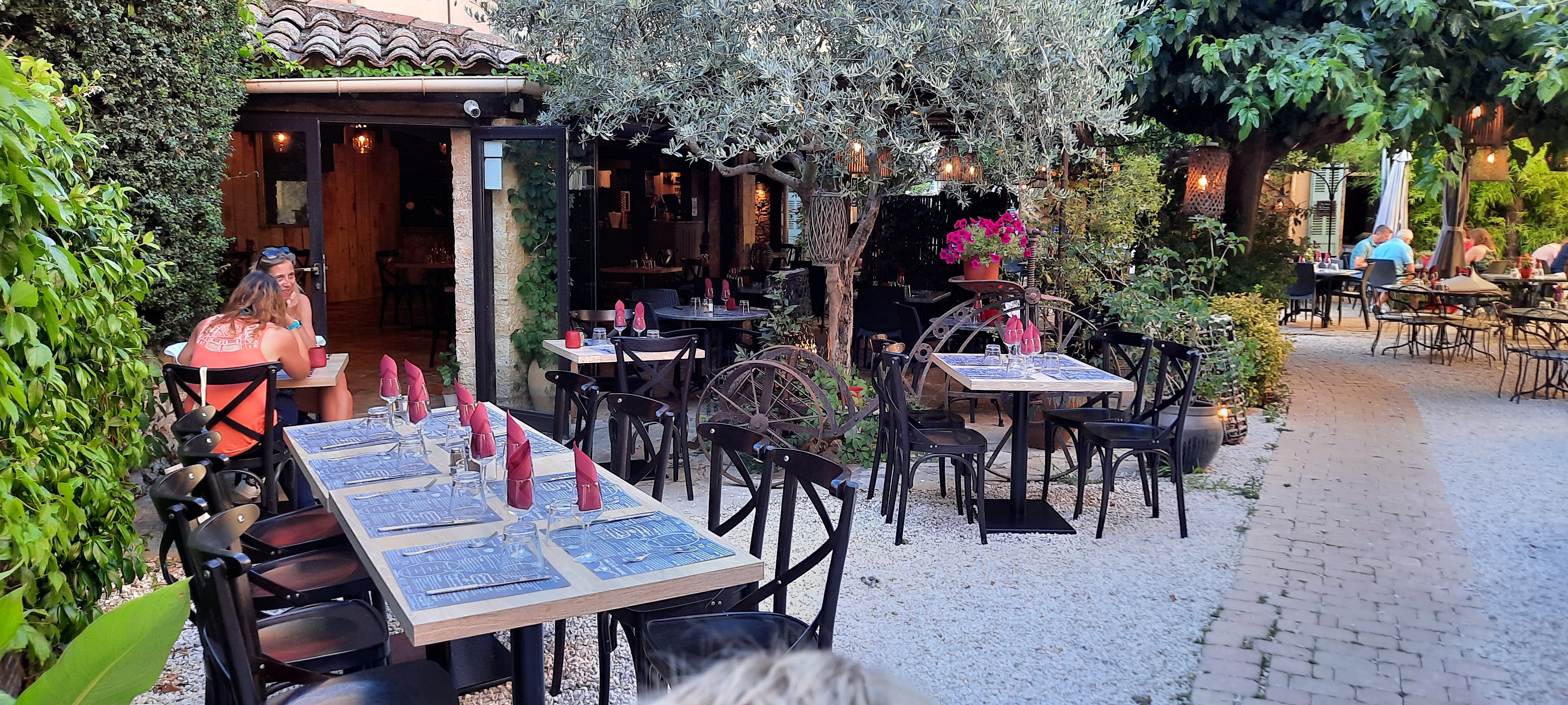 Une terrasse provençale et ombragée nous accueille, nous avons réservé notre table et un personnel jeune et souriant nous installe. Tout en dégustant notre apéritif, nous choisissons dans le choix proposé carte variée et menus 22 et 25€ Nous sommes servis rapidement meme s il y avait 20mn d attente pour les os à moelle. Alors moi ce qui m a épaté c est de voir cette ribanbelle de jeunes serveurs, qui pendant tout le service a courru de la cuisine aux tables avec un professionnalisme impressionnant et sans jamais se départir du sourire. Bravo aux jeunes responsables qui gèrent parfaitement ce lieu sympathique, mon seul souhait est que tout ce petit monde doit rétribué à sa juste valeur avec éventuellement une prime de fin de saison!! 😋😋