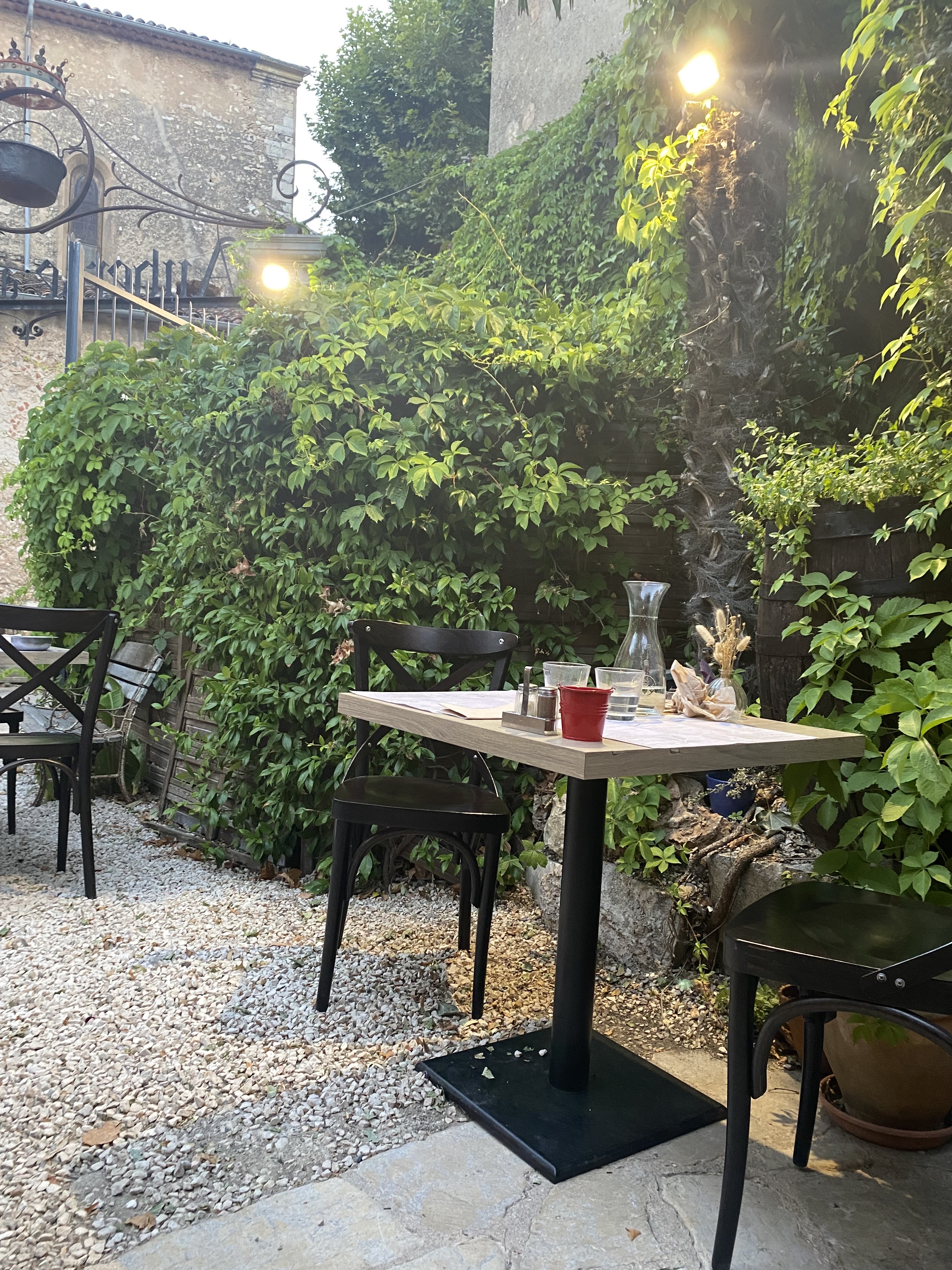 Bel endroit. C'est une cours intérieur en face de l'église. C'est joliment arboré Beaucoup de monde Deux services le soir, a 19h et 21h. Fortement conseillé de réserver durant l'été