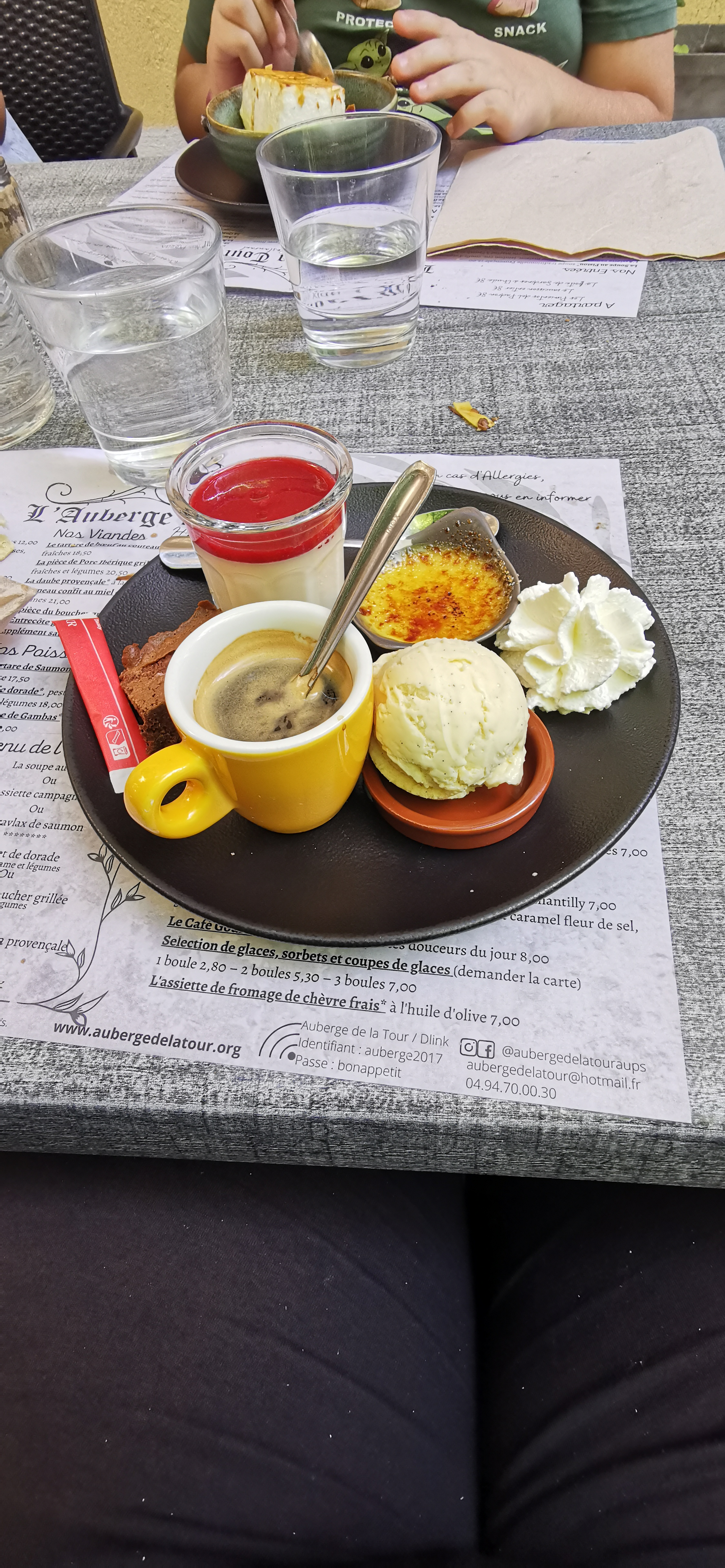 Accueil avec Covid malheureusement ! Très bon accueil les serveuses sont bien équipées. Nous étions avec les masques quand nous sommes arrivés mais je constate que les gens n'en ont rien a faire un peu décevant puisque le covid court toujours. Mais bon parlons restaurant très bon accueil avec gel et hôtesse d'accueil . Nous avons eu une table privilège ! Dans un coin tranquille bon service et plat bien copieux. Une entrée campagnarde que nous avons partagé avec mes filles et pâte au pesto assiette copieuse menu enfant avec de bon nuggets et brochettes de gambas un délice! Restaurant recevant très bien les humain et les chien! Miss Maisy a eu un bon steak haché dans le menu enfant nous sommes parties 3 jours à sillans la cascade et j'ai oublié le repas de Miss Maisy ! Ouh mauvaise mère !! Hi hi hi. Elle a adoré son steak merci aux serveuses pour leur gentillesse et leurs sourires. Desserts moelleux crème anglaise et chantilly super bon et profiteroles revisitées Auberge de la Tour un vrai délice à tomber par terre ! Ce que je n'ai pas fait!😂 Le restaurant nous a été recommandé par la maison d'hôtes Longo Mai à Sillans la cascade une fabuleuse et paisible chambre d'hôtes. La réservation au restaurant a été faite par la maison d'hôtes. Bien pratique.