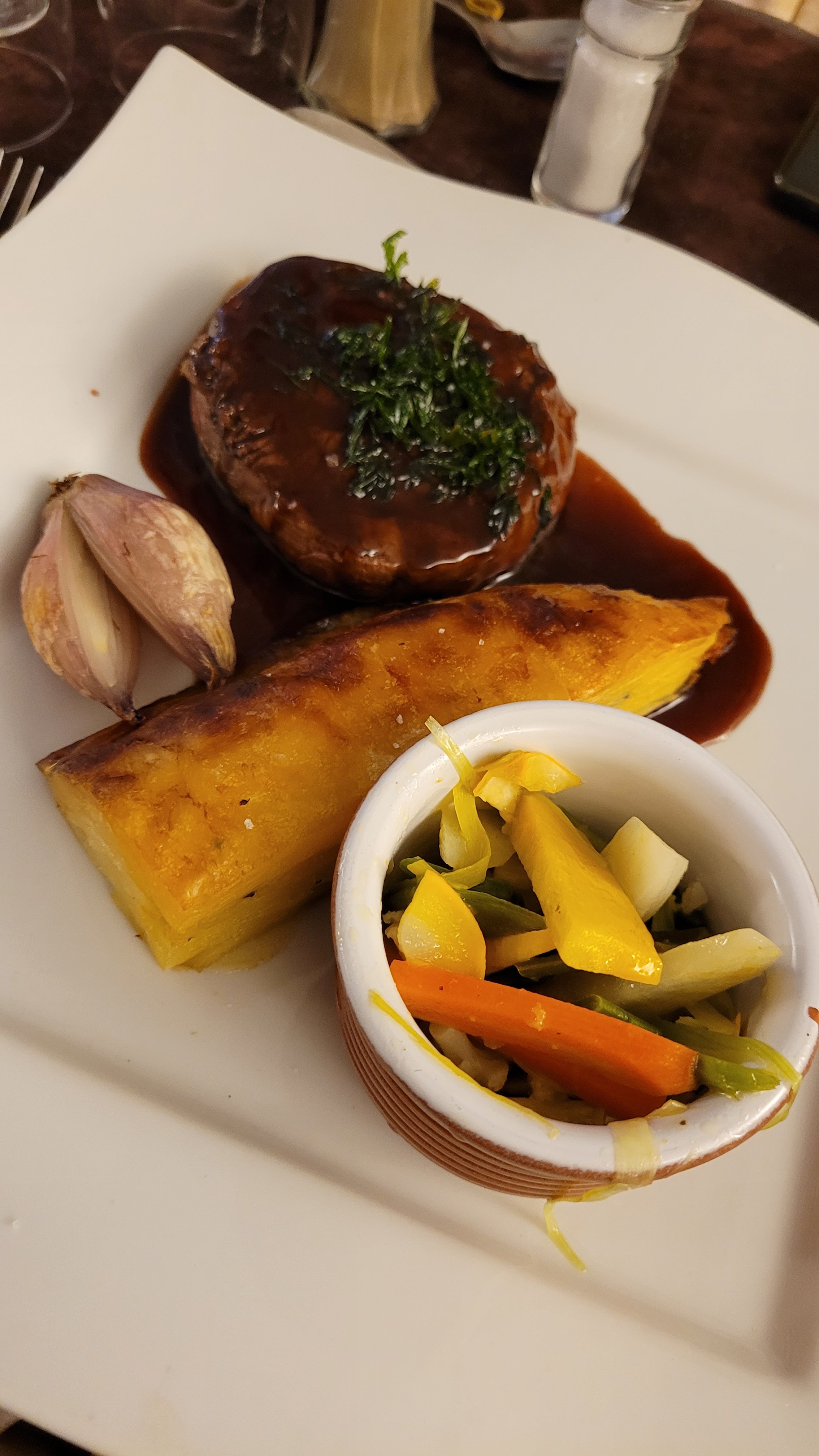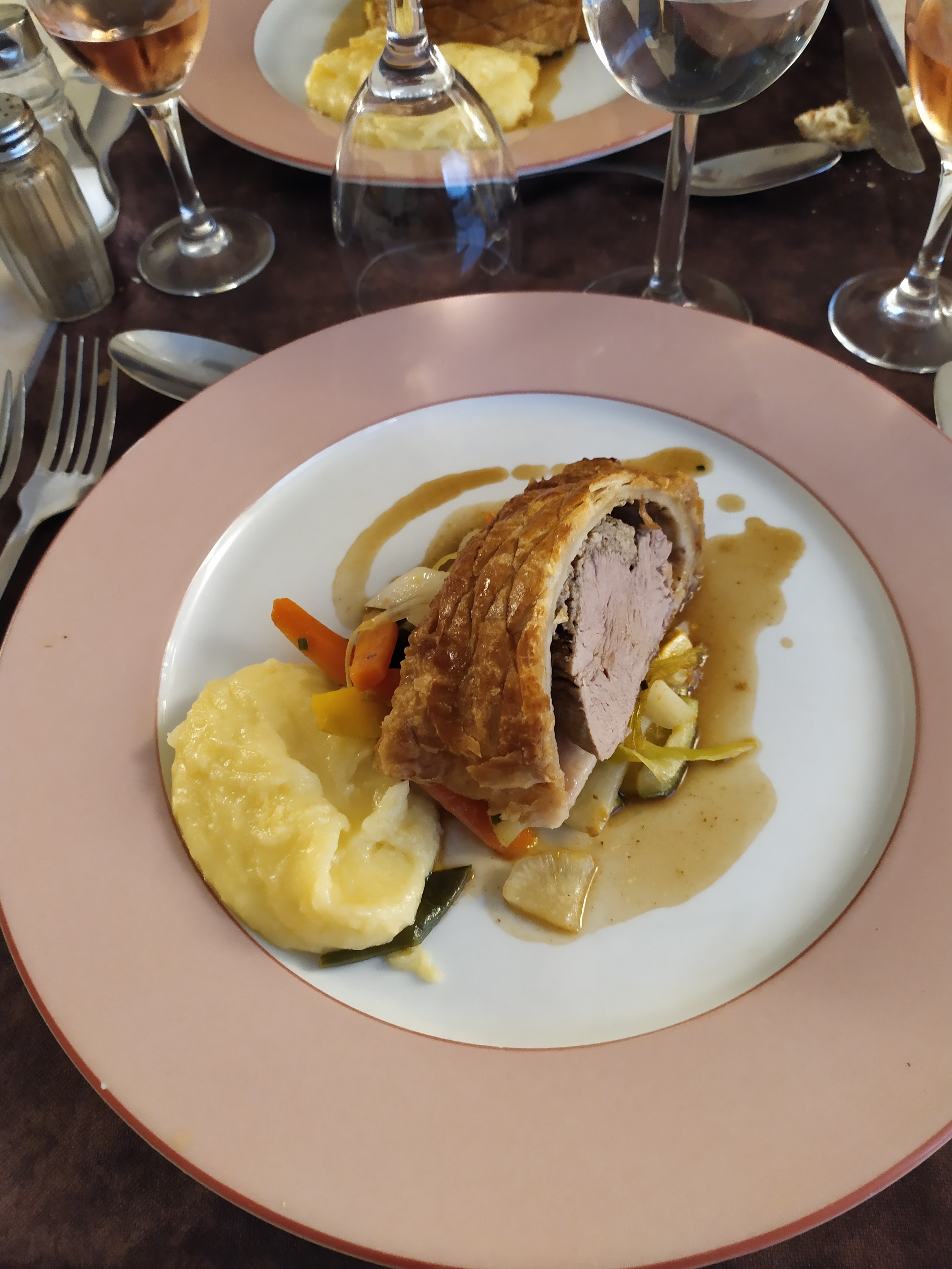Sublime repas,mise en bouche,tourte de cèpes, roulé d'échine de cu noir, avec ça farandole de légumes de saison ,purée,plateaux de fromages ,multiples desserts aux choix .vin des milles pierres . café. Service ,personnels très accueillant.