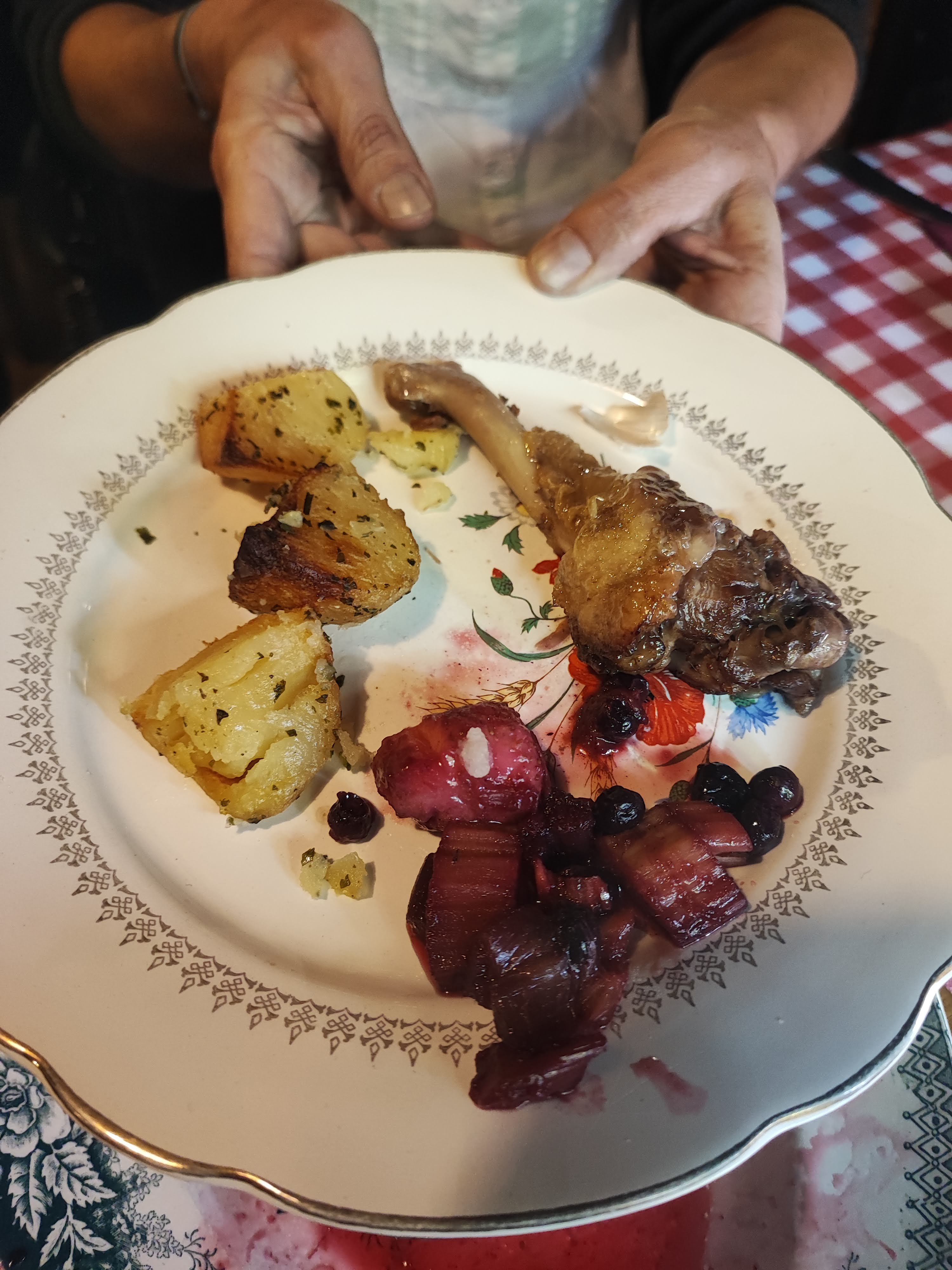 Trés accueillant repas du jamais vu servi dans de l'ancienne vaisselle comme chez mémé fleur à déguster soupe à l'ortie à refaire