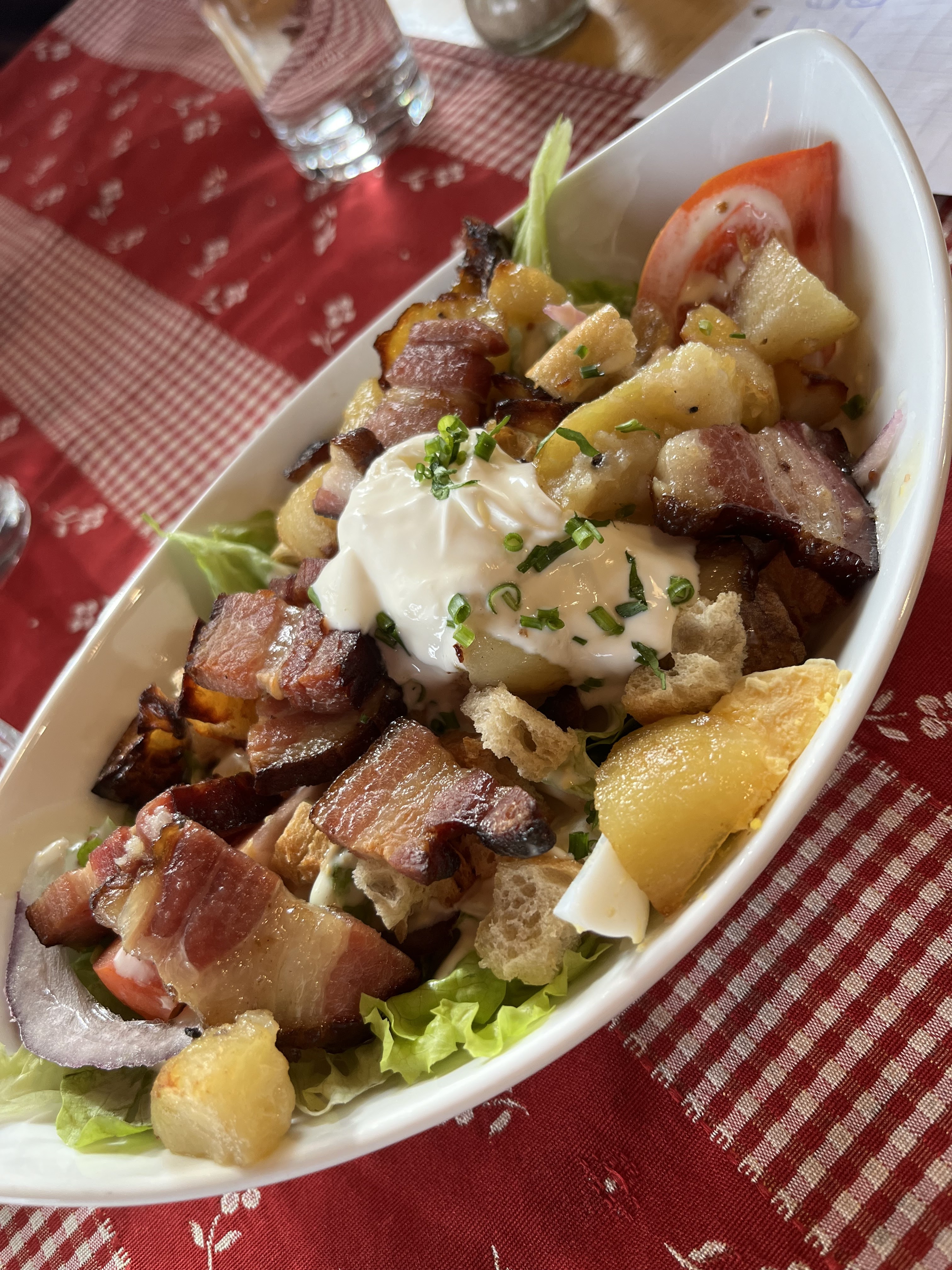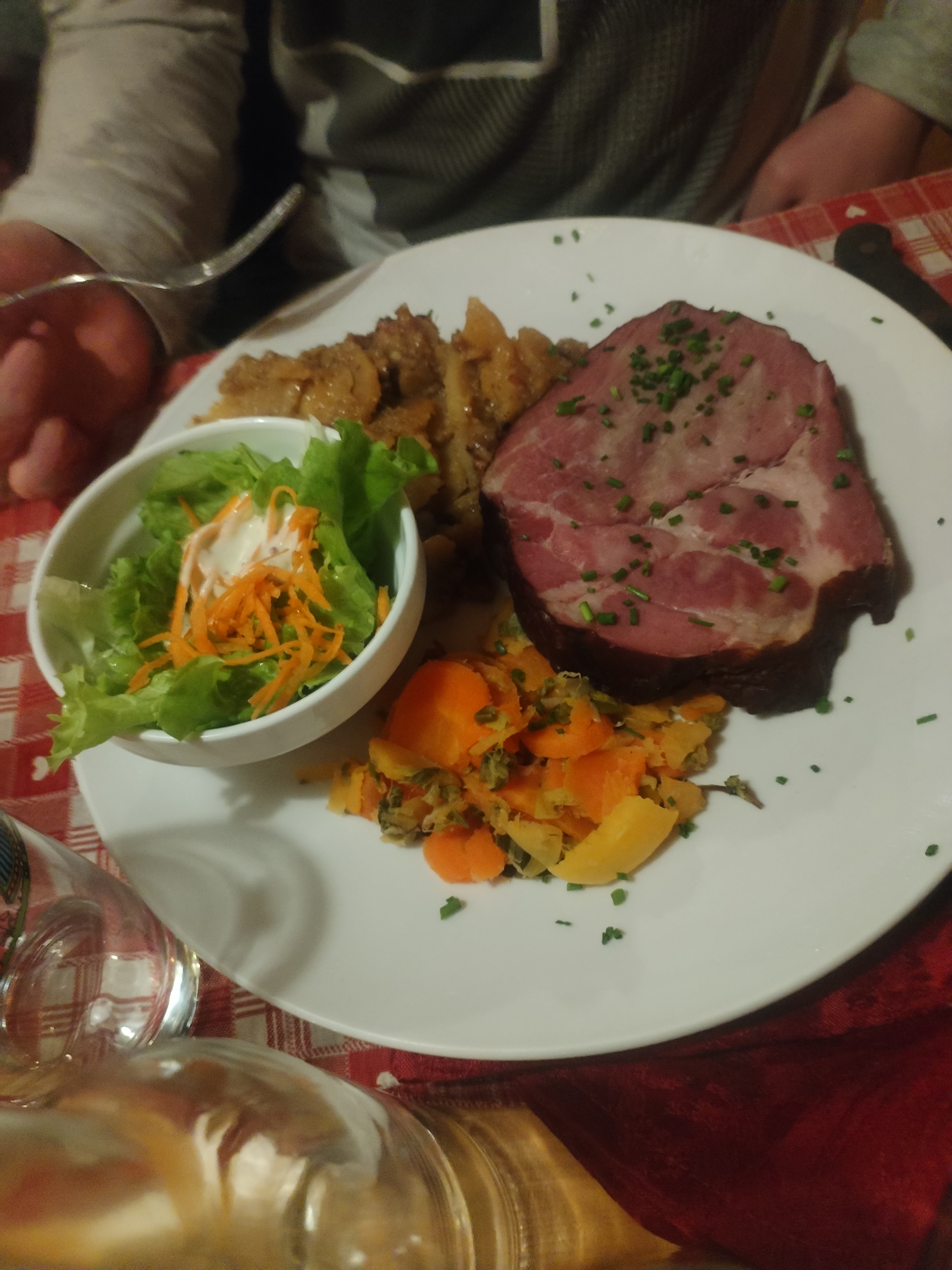 La nourriture était absolument horrible. Nous avons pris une soupe à l'oignon en entrée. Cela avait le goût de quelques oignons jetés dans de l’eau salée pendant 20 minutes. Il n'y a eu aucune caramélisation. Le plat principal était une patte arrière cuite lentement. Tout le repas était totalement dépourvu de sel ou d’autres épices. 2 des pommes de terre les plus fades possibles et quelques tranches de carottes aléatoires qui avaient un goût pire que des légumes en conserve... La salat verte était composée de 3 morceaux de laitue... Elle n'est vivante qu'à cause de l'emplacement et de l'hôtel. Une parodie complète. Je préfère conduire en ville ivre ou simplement ne pas manger du tout plutôt que de manger ici à nouveau. Congelé aurait été mieux.