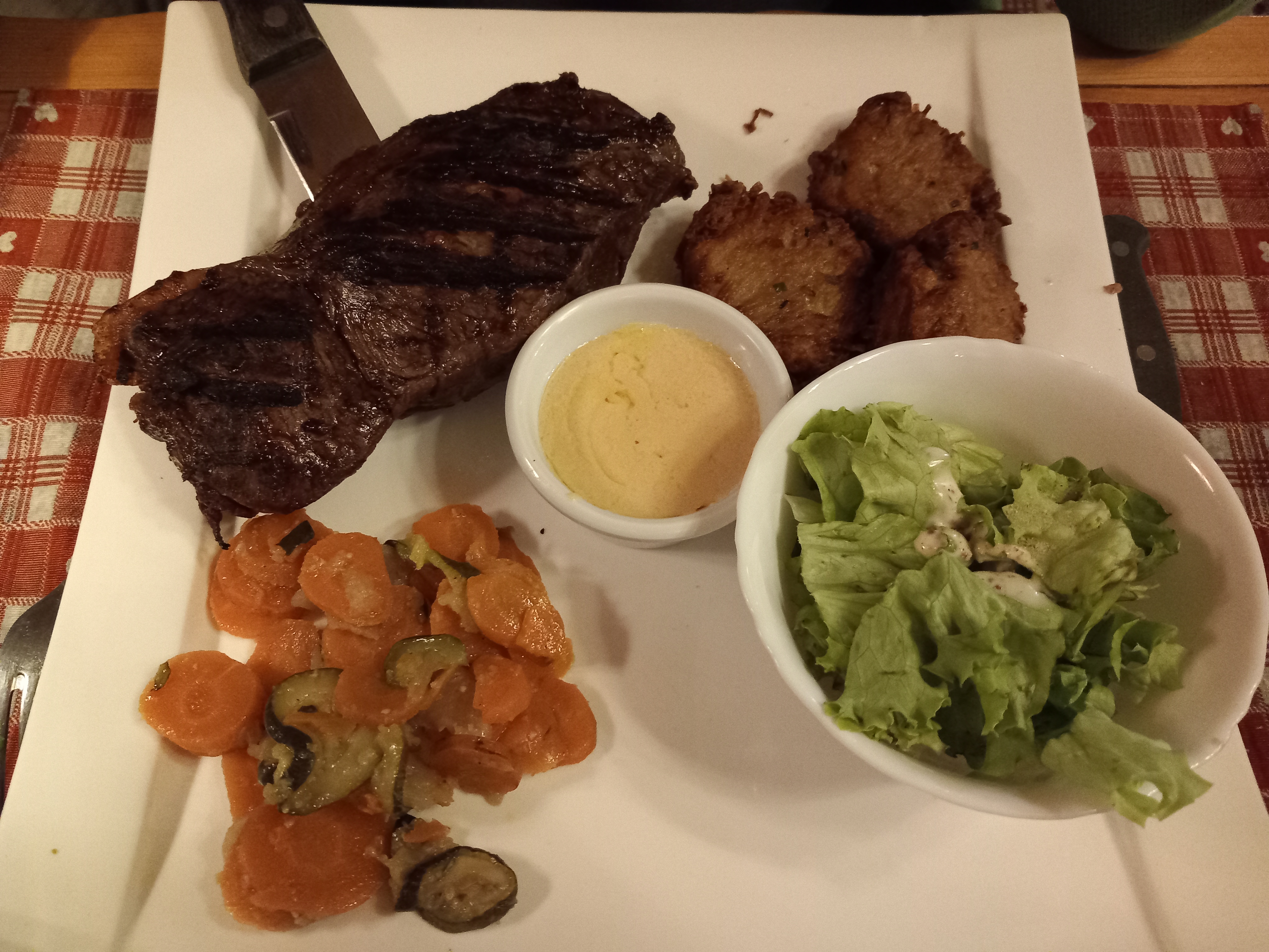 Nous étions venu à 4. L'un d'entre nous a commandé un faux Filet de boeuf cuisson bleue. Il a été servi froid. Ce qui a paru normal au serveur. En plus celui-ci était plein de nerfs et immangeable. Compensation en fin de repas un dessert gratuit. Un morceau de viande a 30 euros immangeable ce n'est pas normal surtout à ce prix. L'accompagnement laissait aussi à désirer carottes et navets cuit à l'eau sans assaisonnements