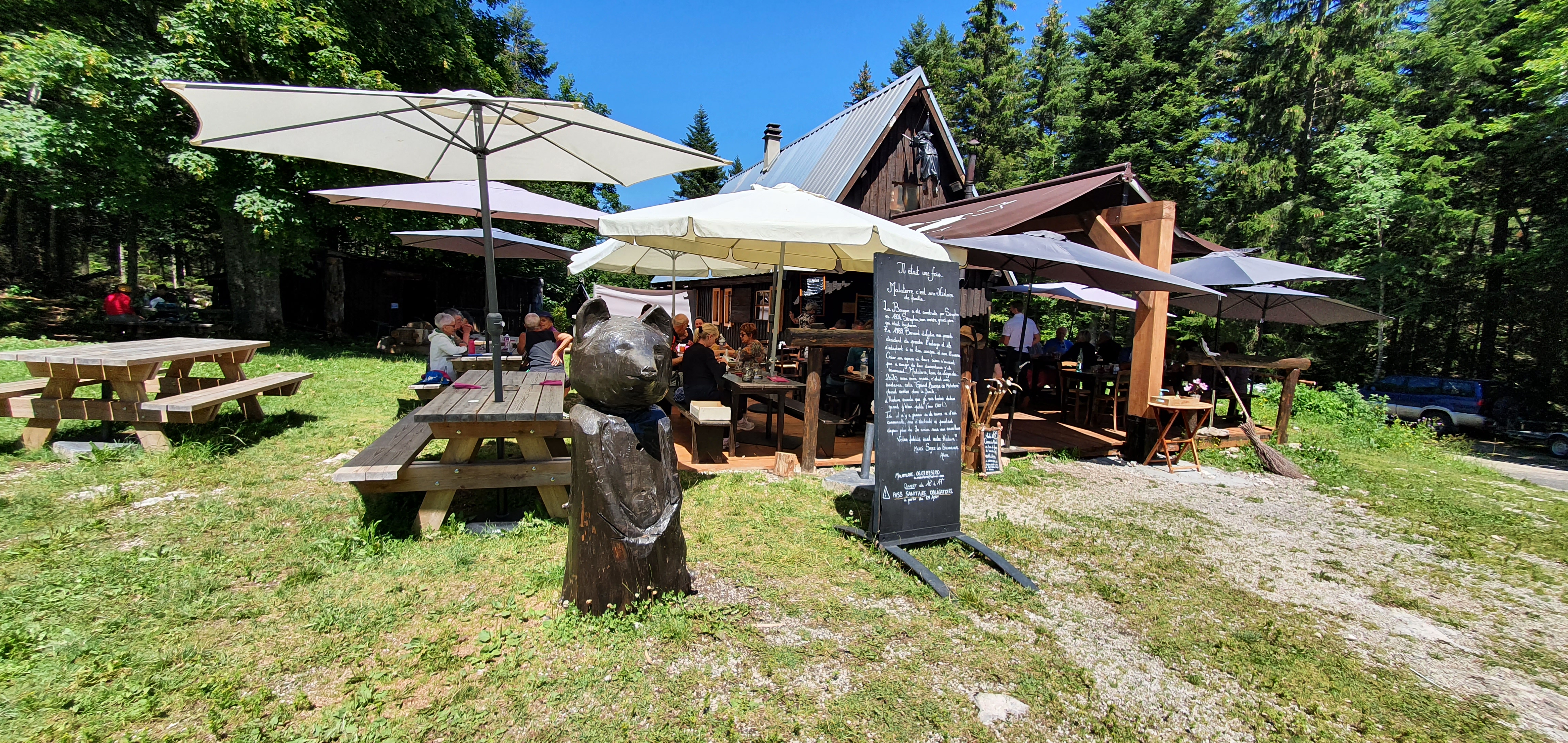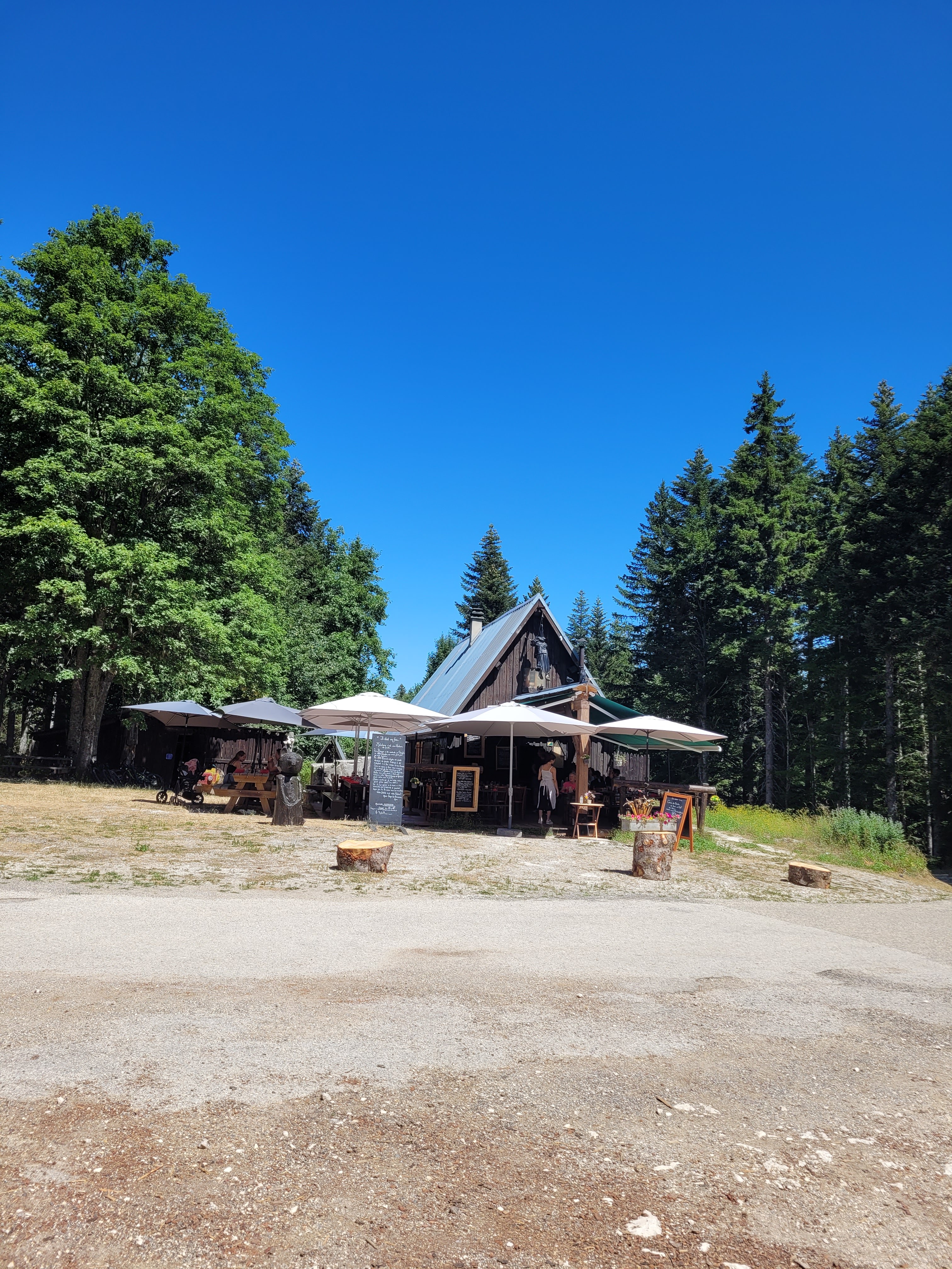 On nous a parlé de ce lieu atypique il y a peu de temps et nous avons préféré attendre que le 15 août soit passé. Même si je tournais un peu le dos à la terrasse il ne semblait pas rester une table non occupée. En plus il y a des tables légèrement à l’écart mises à disposition pour ceux qui veulent éventuellement commander un repas à emporter mais à manger sur place. Accueil et service très agréables pas la moindre attente et de bons produits frais dont certains sont vraiment très locaux … mais on n’a pas réussi malgré tout à savoir d’où 😉😁. Ici on est vraiment loin de tout et presque hors du temps avec de la forêt à 360° autour, 1200 m d’altitude et sans la moindre habitation à des kilomètres à la ronde. Très belle découverte et avec des prix très corrects. Belle histoire que cette ancienne maison d’un bûcheron qui serait sûrement fier de voir comme son petit chalet a traversé le temps. Bravo à vous tous.