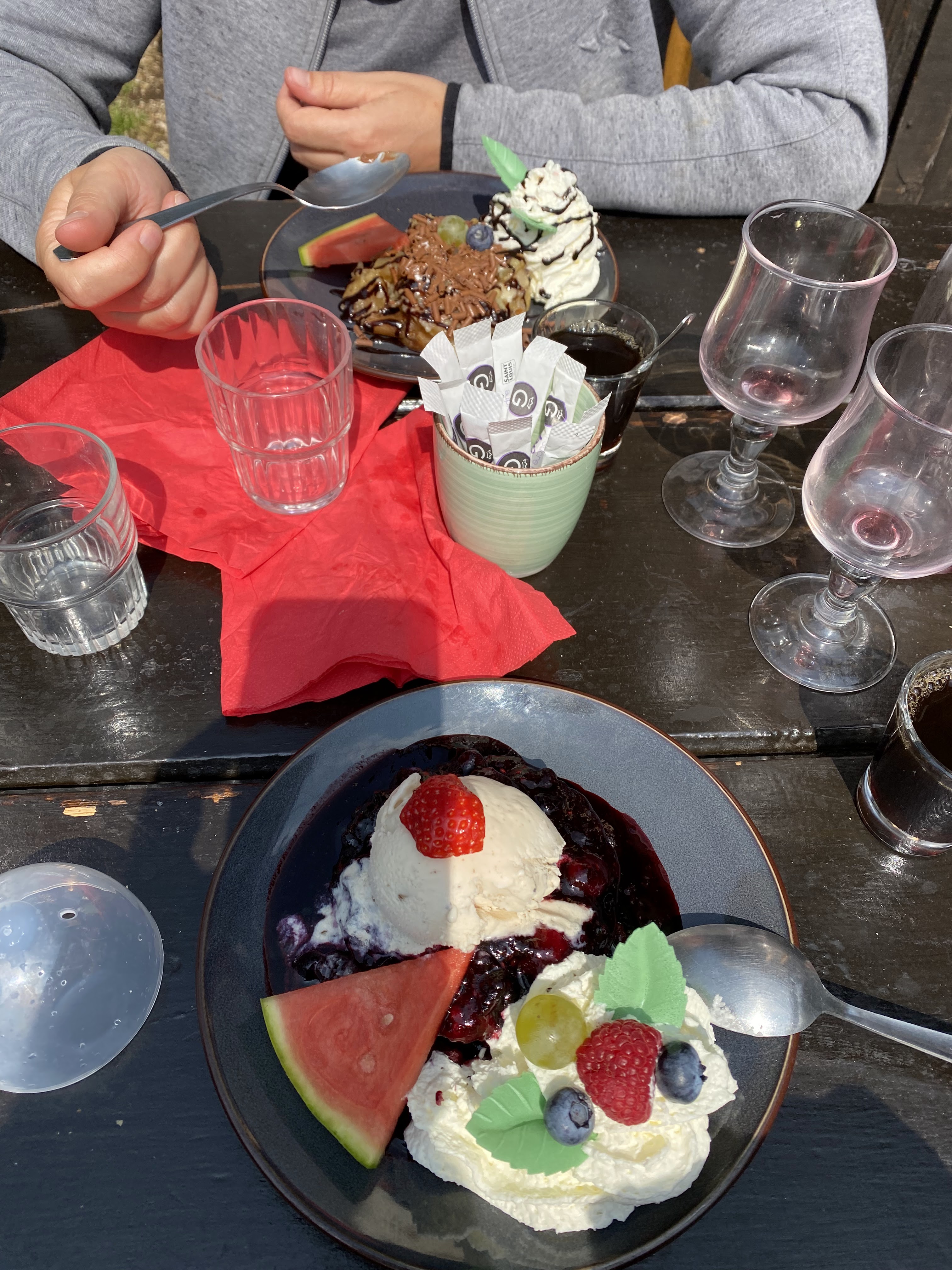 Arrivée vers 13h3o en plein service pour prendre des cafés, le patron nous a accueilli avec le sourire et installé. Du coup, on c'est laissé tenter par les desserts et glaces qui sont gargantuesques. On a apprécié l'endroit authentique, sous la fraîcheur des sapins en cette journée de canicule. Je recommande. Jean-Paul
